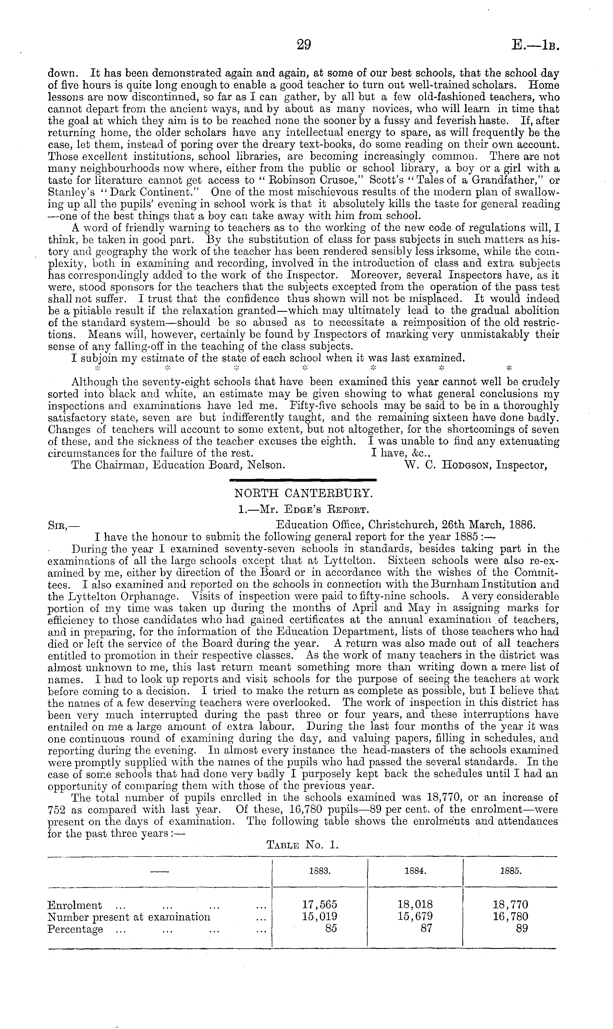NOETH CANTEEBUEY. 1. —Mr. Edge's Eepoet. Sic, — Education Office, Christcburch, 26th March, 1886. I have the honour to submit the following general report for the year 1885 : —■ During the year I examined seventy-seven schools in standards, besides taking part in the examinations of all the large schools except that at Lyttolton. Sixteen schools were also re-ex-amined by me, either by direction of the Board or in accordance with the wishes of the Committees. I also examined and reported on the schools in connection with the Burnham Institution and the Lyttelton Orphanage. Visits of inspection were paid to fifty-nine schools. A very considerable portion of my time was taken up during the months of April and May in assigning marks for efficiency to those candidates who had gained certificates at the annual examination of teachers, and in preparing, for the information of the Education Department, lists of those teachers who had died or left the service of the Board during the year. A return was also made out of all teachers entitled to promotion in their respective classes. As the work of many teachers in the district was almost unknown to me, this last return meant something more than writing down a mere list of names. I had to look up reports and visit schools for the purpose of seeing the teachers at work before coming to a decision. I tried to make the return as complete as possible, but I believe that the names of a few deserving teachers were overlooked. The work of inspection in this district has been very much interrupted during the past three or four years, and these interruptions have entailed on me a large amount of extra labour. During the last four months of the year it was one continuous round of examining during the day, and valuing papers, filling in schedules, and reporting during the evening. In almost every instance the head-masters of the schools examined were promptly supplied with the names of the pupils who had passed the several standards. In the case of some schools that had done very badly I purposely kept back the schedules until I had an opportunity of comparing them with those of the previous year. The total number of pupils enrolled in the schools examined was 18,770, or an increase of 752 as compared with last year. Of these, 16,780 pupils—B9 per cent, of the enrolment—were present on the days of examination. The following table shows the enrolments and attendances for the past three years : —