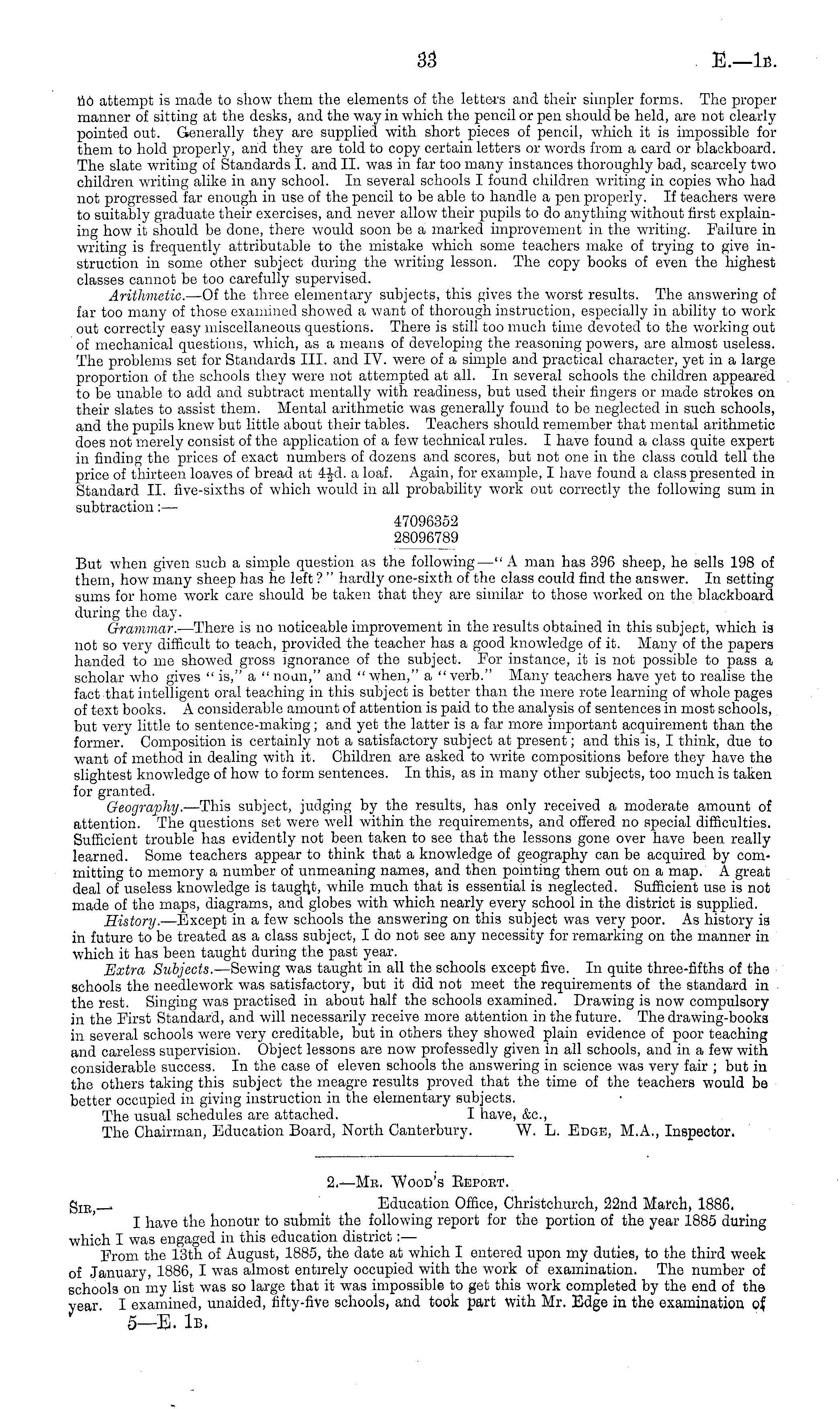 2.—Me. Wood's Eepoet. g IB _^ Education Office, Christchurch, 22nd March, 1886. I have the honour to submit the following report for the portion of the year 1885 during which I was engaged in this education district: — From the 13th of August, 1885, the date at which I entered upon my duties, to the third week of January, 1886, I was almost entirely occupied with the work of examination. The number of schools on my list was so large that it was impossible to get this work completed by the end of the year I examined, unaided, fifty-five schools, and took part with Mr. Edge in the examination of s—B. Ib.