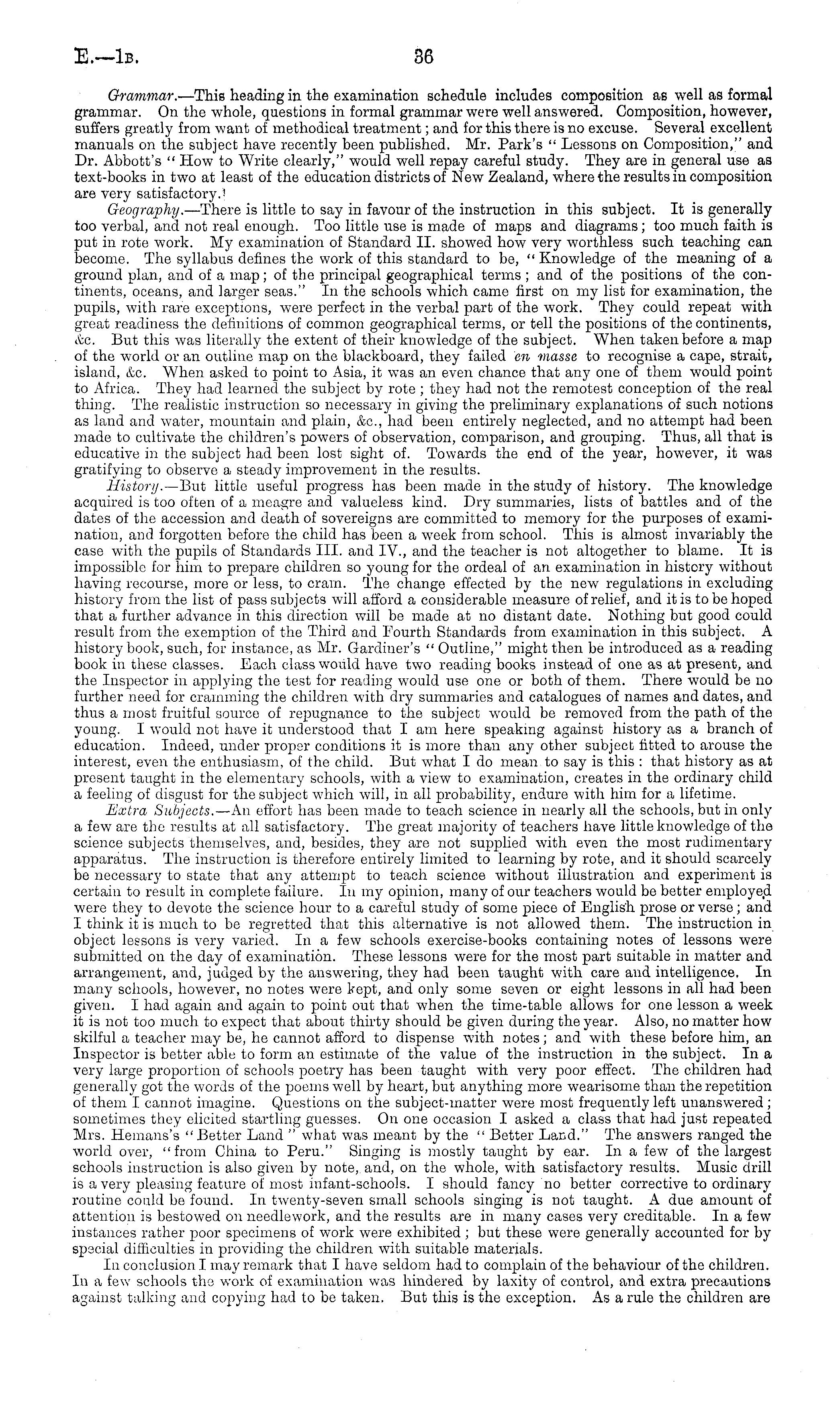 Grammar. —This heading in the examination schedule includes composition as well as formal grammar. On the whole, questions in formal grammar were well answered. Composition, however, suffers greatly from want of methodical treatment; and for this there is no excuse. Several excellent manuals on the subject have recently been published. Mr. Park's " Lessons on Composition," and Dr. Abbott's " How to Write clearly," would well repay careful study. They are in general use as text-books in two at least of the education districts of New Zealand, where the results in composition are very satisfactory.! Geography. —There is little to say in favour of the instruction in this subject. It is generally too verbal, and not real enough. Too little use is made of maps and diagrams; too much faith is put in rote work. My examination of Standard 11. showed how very worthless such teaching can become. The syllabus defines the work of this standard to be, " Knowledge of the meaning of a ground plan, and of a map; of the principal geographical terms; and of the positions of the continents, oceans, and larger seas." In the schools which came first on my list for examination, the pupils, with rare exceptions, were perfect in the verbal part of the work. They could repeat with great readiness the definitions of common geographical terms, or tell the positions of the continents, &o. But this was literally the extent of their knowledge of the subject. When taken before a map of the w rorld or an outline map on the blackboard, they failed en masse to recognise a cape, strait, island, &c. When asked to point to Asia, it was an even chance that any one of them would point to Africa. They had learned the subject by rote ; they had not the remotest conception of the real thing. The realistic instruction so necessary in giving the preliminary explanations of such notions as land and water, mountain and plain, &c, had been entirely neglected, and no attempt had been made to cultivate the children's powers of observation, comparison, and grouping. Thus, all that is educative in the subject had been lost sight of. Towards the end of the year, however, it was gratifying to observe a steady improvement in the results. History. —But little useful progress has been made in the study of history. The knowledge acquired is too often of a meagre and valueless kind. Dry summaries, lists of battles and of the dates of the accession and death of sovereigns are committed to memory for the purposes of examination, and forgotten before the child has been a week from school. This is almost invariably the case with the pupils of Standards 111. and IV., and the teacher is not altogether to blame. It is impossible for him to prepare children so young for the ordeal of an examination in history without having recourse, more or less, to cram. The change effected by the new regulations in excluding history from the list of pass subjects will afford a considerable measure of relief, and it is to be hoped that a further advance in this direction will be made at no distant date. Nothing but good could result from the exemption of the Third and Fourth Standards from examination in this subject. A history book, such, for instance, as Mr. Gardiner's " Outline," might then be introduced as a reading book in these classes. Each class would have two reading books instead of one as at present, and the Inspector in applying the test for reading would use one or both of them. There would be no further need for cramming the children with dry summaries and catalogues of names and dates, and thus a most fruitful source of repugnance to the subject would be removed from the path of the young. I would not have it understood that I am here speaking against history as a branch of education. Indeed, under proper conditions it is more than any other subject fitted to arouse the interest, even the enthusiasm, of the child. But what Ido mean to say is this : that history as at present taught in the elementary schools, with a view to examination, creates in the ordinary child a feeling of disgust for the subject which will, in all probability, endure with him for a lifetime. Extra Subjects. —An effort has been made to teach science in nearly all the schools, but in only a few are the results at all satisfactory. The great majority of teachers have little knowledge of the science subjects themselves, and, besides, they are not supplied with even the most rudimentary apparatus. The instruction is therefore entirely limited to learning by rote, and it should scarcely be necessary to state that any attempt to teach science without illustration and experiment is certain to result in complete failure. In my opinion, many of our teachers would be better employed were they to devote the science hour to a careful study of some piece of English prose or verse; and I think it is much to bo regretted that this alternative is not allowed them. The instruction in object lessons is very varied. In a few schools exercise-books containing notes of lessons were submitted on the day of examination. These lessons were for the most part suitable in matter and arrangement, and, judged by the answering, they had been taught with care and intelligence. In many schools, however, no notes were kept, and only some seven or eight lessons in all had been given. I had again and again to point out that when the time-table allows for one lesson a week it is not too much to expect that about thirty should be given during the year. Also, no matter how skilful a teacher may be, he cannot afford to dispense with notes; and with these before him, an Inspector is better able to form an estimate of the value of the instruction in the subject. In a very large proportion of schools poetry has been taught with very poor effect. The children had generally got the words of the poems well by heart, but anything more wearisome than the repetition of them I cannot imagine. Questions on the subject-matt