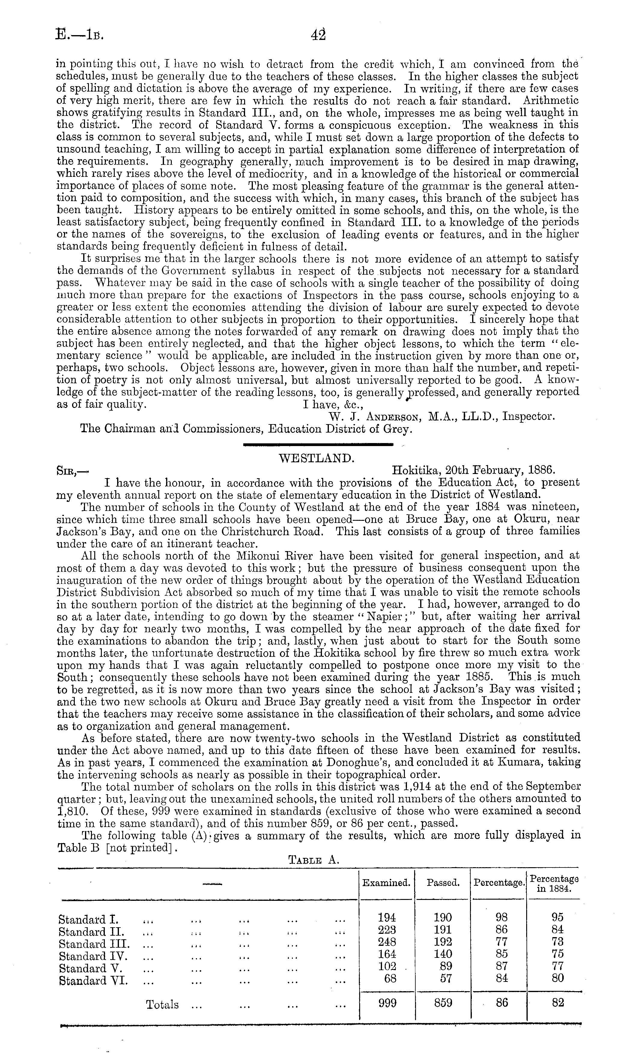 WESTLAND. Sib,— Hokitika, 20th February, 1886. I have the honour, in accordance with the provisions of the Education Act, to present my eleventh annual report on the state of elementary education in the District of Westland. The number of schools in the County of Westland at the end of the year 1884 was nineteen, since which time three small schools have been opened—one at Bruce Bay, one at Okuru, near Jackson's Bay, and one on the Christchurch Eoad. This last consists of a group of three families under the care of an itinerant teacher. All the schools north of the Mikonui Eiver have been visited for general inspection, and at most of them a day was devoted to this work; but the pressure of business consequent upon the inauguration of the new order of things brought about by the operation of the Westland Education District Subdivision Act absorbed so much of my time that I was unable to visit the remote schools in the southern portion of the district at the beginning of the year. I had, however, arranged to do so at a later date, intending to go down by the steamer " Napier;" but, after waiting her arrival day by day for nearly two months, I was compelled by the near approach of the date fixed for the examinations to abandon the trip; and, lastly, when just about to start for the South some months later, the unfortunate destruction of the Hokitika school by fire threw so much extra work upon my hands that I was again reluctantly compelled to postpone once more my visit to the South; consequently these schools have not been examined during the year 1885. This is much to be regretted, as it is now more than two years since the school at Jackson's Bay was visited ; and the two new schools at Okuru and Bruce Bay greatly need a visit from the Inspector in order that the teachers may receive some assistance in the classification of their scholars, and some advice as to organization and general management. As before stated, there are now twenty-two schools in the Westland District as constituted under the Act above named, and up to this date fifteen of these have been examined for results. As in past years, I commenced the examination at Donoghue's, and concluded it at Kumara, taking the intervening schools as nearly as possible in their topographical order. The total number of scholars on the rolls in this district was 1,914 at the end of the September quarter; but, leaving out the unexamined schools, the united roll numbers of the others amounted to 1,810. Of these, 999 were examined in standards (exclusive of those who were examined a second time in the same standard), and of this number 859, or 86 per cent., passed. The following table (A) • gives a summary of the results, which are more fully displayed in Table B [not printed].