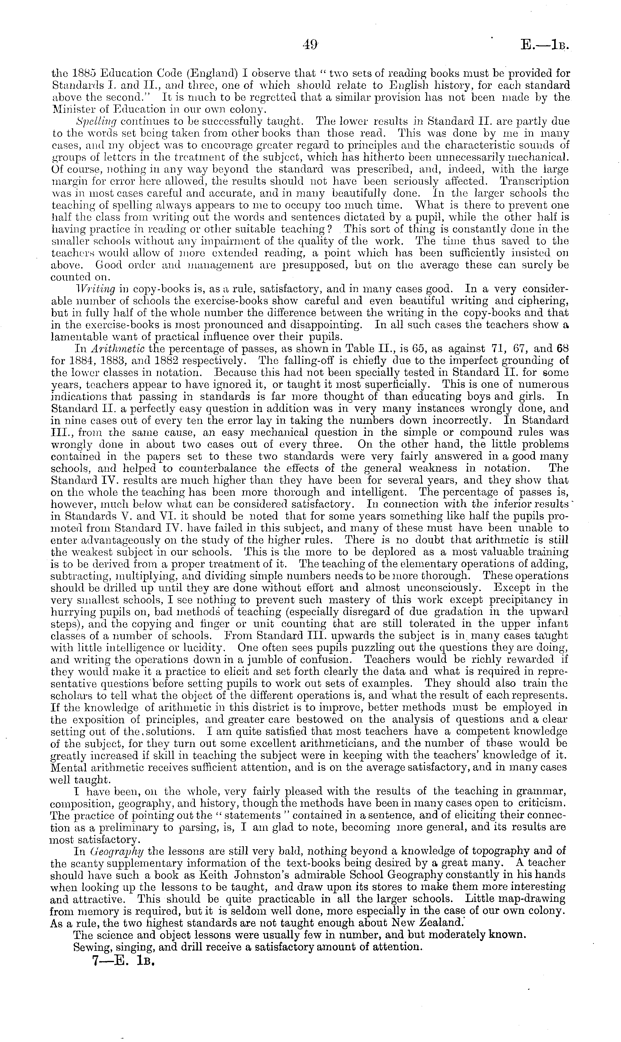 the 1885 Education Code (England) I observe that " two sets of reading books must be provided for Standards I. and 11., and three, one of which should relate to English history, for each standard above the second." It is much to be regretted that a similar provision has not been made by the Minister of Education in our own colony. Spelling continues to be successfully taught. The lower results in Standard 11. are partly due to the words set being taken from other books than those read. This was done by me in many cases, and my object was to encourage greater regard to principles and the characteristic sounds of groups of letters in the treatment of the subject, which has hitherto been unnecessarily mechanical. Of course, nothing in any w 7ay beyond the standard was prescribed, and, indeed, with the large margin for error here allowed, the results should not have been seriously affected. Transcription was in most cases careful and accurate, and in many beautifully done. In the larger schools the teaching of spelling always appears to mo to occupy too much time. What is there to prevent one half the class from writing out the words and sentences dictated by a pupil, while the other half is having practice in reading or other suitable teaching ? This sort of thing is constantly done in the smaller schools without any impairment of the quality of the work. The time thus saved to the teachers would allow of more extended reading, a point which has been sufficiently insisted on above. Good order and management are presupposed, but on the average these can surely be counted on. Writing in copy-books is, as a rule, satisfactory, and in many cases good. In a very considerable number of schools the exercise-books show careful and even beautiful writing and ciphering, but in fully half of the whole number the difference between the writing in the copy-books and that in the exercise-books is most pronounced and disappointing. In all such cases the teachers show a lamentable want of practical influence over their pupils. In Arithmetic the percentage of passes, as shown in Table 11., is 65, as against 71, 67, and 68 for 1884, 1883, and 1882 respectively. The falling-off is chiefly due to the imperfect grounding of the lower classes in notation. Because this had not been specially tested in Standard 11. for some years, teachers appear to have ignored it, or taught it most superficially. This is one of numerous indications that passing in standards is far more thought of than educating boys and girls. In Standard 11. a perfectly easy question in addition was in very many instances wrongly done, and in nine cases out of every ten the error lay in taking the numbers down incorrectly. In Standard 111., from the same cause, an easy mechanical question in the simple or compound rules was wrongly done in about two cases out of every three. On the other hand, the little problems contained in the papers set to these two standards were very fairly answered in a good many schools, and helped to counterbalance the effects of the general weakness in notation. The Standard IV. results are much higher than they have been for several years, and they show that on the whole the teaching has been more thorough and intelligent. The percentage of passes is, however, much below what can be considered satisfactory. In connection with the inferior results' in Standards V. and VI. it should be noted that for some years something like half the pupils promoted from Standard IV. have failed in this subject, and many of these must have been unable to enter advantageously on the study of the higher rules. There is no doubt that arithmetic is still the weakest subject in our schools. This is the more to be deplored as a most valuable training is to be derived from a proper treatment of it. The teaching of the elementary operations of adding, subtracting, multiplying, and dividing simple numbers needs to be more thorough. These operations should be drilled up until they are done without effort and almost unconsciously. Except in the very smallest schools, I see nothing to prevent such mastery of this work except precipitancy in hurrying pupils on, bad methods of teaching (especially disregard of due gradation in the upward steps), and the copying and finger or unit counting that are still tolerated in the upper infant classes of a number of schools. From Standard 111. upwards the subject is in many cases taught with little intelligence or lucidity. One often sees pupils puzzling out the questions they are doing, and writing the operations down in a jumble of confusion. Teachers would be richly rewarded if they would make it a practice to elicit and set forth clearly the data and what is required in representative questions before setting pupils to work out sets of examples. They should also train the scholars to tell what the object of the different operations is, and what the result of each represents. If the knowledge of arithmetic in this district is to improve, better methods must be employed in the exposition of principles, and greater care bestowed on the analysis of questions and a clear setting out of the,solutions. I am quite satisfied that most teachers have a competent knowledge of the subject, for they turn out some excellent arithmeticians, and the number of those would be greatly increased if skill in teaching the subject were in keeping with the teachers' knowledge of it. Mental arithmetic receives sufficient attention, and is on the average satisfactory, and in many cases well taught. I have been, on the whole, very fairly pleased with the results of the teaching in grammar, composition, geography, and history, though the methods have been in many cases open to criticism. The practice of pointing out the " statements " contained in a sentence, and of eliciting their connection as a preliminary to parsing, is, I am glad to note, becoming more general, and its results are most satisfactory. In Geographij the lessons are
