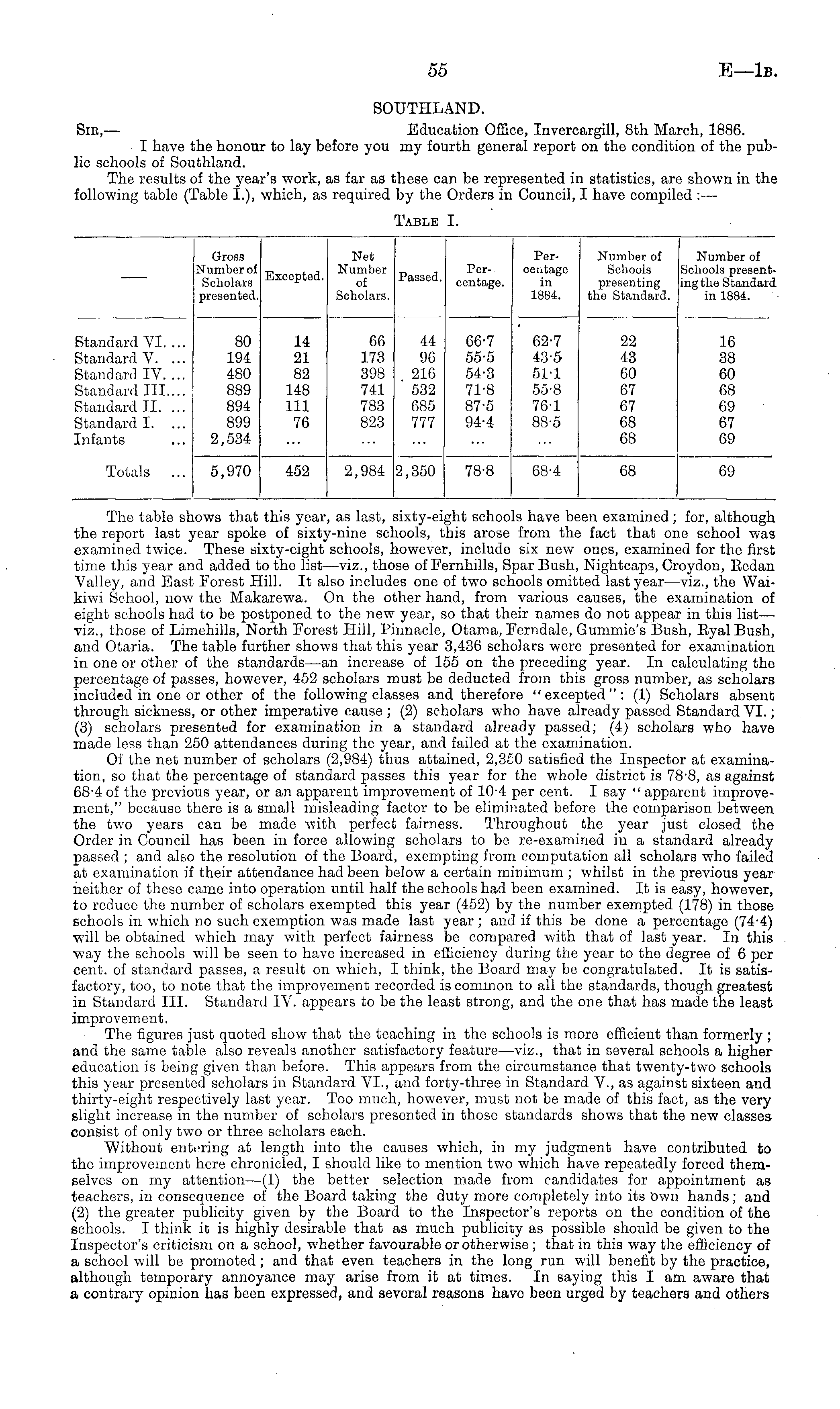 SOUTHLAND. Sic, — Education Office, Invercargill, Bth March, 1886. I have the honour to lay before you my fourth general report on the condition of the public schools of Southland. Tho results of the year's work, as far as these can be represented in statistics, are shown in the following table (Table I.), which, as required by the Orders in Council, I have compiled : —