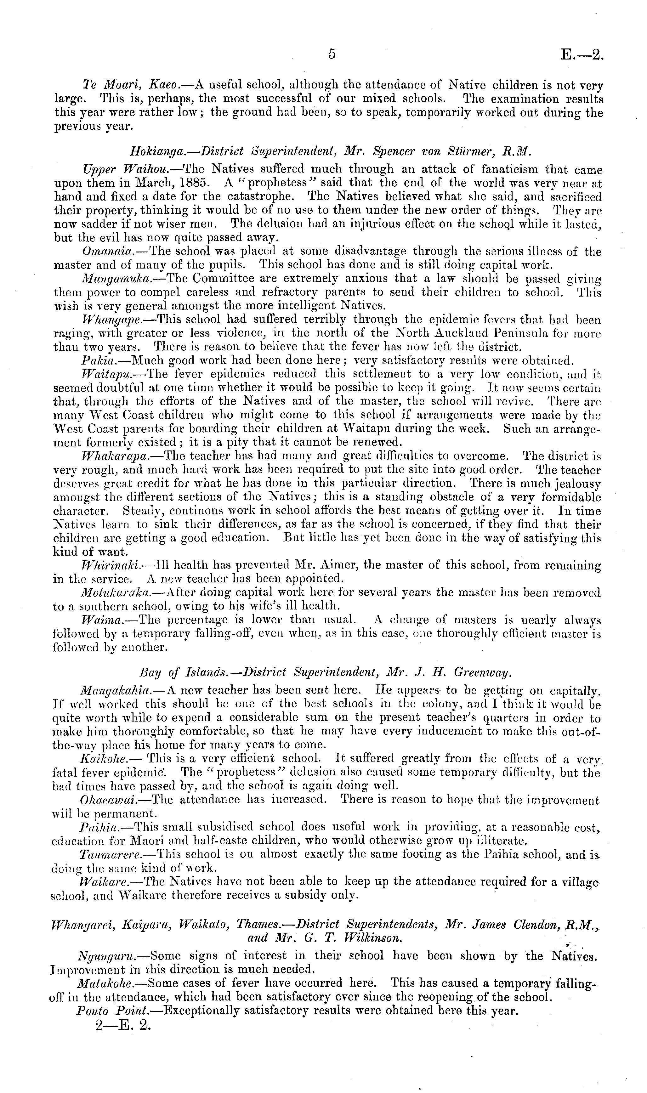 Te Moari, Kaeo. —A useful school, although the attendance of Native children is not verylarge. This is, perhaps, the most successful of our mixed schools. The examination results this year were rather low; the ground had been, so to speak, temporarily worked out during the previous year. Hokianga. — District Superintendent, Mr. Spencer von St'drmer, R.M. Upper Waihou. —The Natives suffered much through an attack of fanaticism that came upon them in March, 1885. A "prophetess" said that the end of the world was very near at hand and fixed a date for the catastrophe. The Natives believed what she said, and sacrificed. their property, thinking it would be of no use to them under the new order of things. They are now sadder if not wiser men. The delusion had an injurious effect on the sehoql while it lasted, but the evil has now quite passed away. Omanaia. —The school was placed at some disadvaiitage through the serious illness of the master and of many of the pupils. This school has done and is still doing capital work. Mangamuka. —The Committee are extremely anxious that a law should be passed giving them power to compel careless and refractory parents to send their children to school. This wish is very general amongst the more intelligent Natives. Whangape. —This school had suffered terribly through the epidemic fevers that had been raging, with greater or less violence, in the north of the North Auckland Peninsula for more than two years. There is reason to believe that the fever has now left the district. Pakia. —Much good work had been done here; very satisfactory results were obtained. Waitapu. —The fever epidemics reduced this settlement to a very low condition, and it seemed doubtful at one time whether it would be possible to keep it going. It now seems certain that, through the efforts of the Natives and of the master, the school will revive. There are many West Coast children who might come to this school if arrangements were made by the West Coast parents for boarding their children at Waitapu during the week. Such an arrangement formerly existed ; it is a pity that it cannot bo renewed. Whakarapa. —The teacher has had many and great difficulties to overcome. The district is very rough, and much hard work has been required to put the site into good order. The teacher deserves great credit for what he has done in this particular direction. There is much jealousy amongst the different sections of the Natives; this is a standing obstacle of a very formidable character. Steady, continous work in school affords the best means of getting over it. In time Natives learn to sink their differences, as far as the school is concerned, if they find that their children are getting a good education. But little has yet been done in the way of satisfying this kind of want. Whirinaki. —111 health has prevented Mr. Aimer, the master of this school, from remaining in the service. A new teacher has been appointed. Motukaraka. —After doing capital work here for several years the master has been removed to a southern school, owing to his wife's ill health. Waima. —The percentage is lower than usual. A change of masters is nearly always followed by a temporary falling-off, even when, as in this case, one thoroughly efficient master is followed by another. Bay of Islands. — District Superintendent, Mr. J. H. Greeniuay. Mangakahia. —A new teacher has been sent here. He appears to be getting on capitally. If well worked this should be one of the best schools in the colony, and I think it would be quite worth while to expend a considerable sum on the present teacher's quarters in order to make him thoroughly comfortaMe, so that he may have every inducement to make this out-of-the-way place his homo for many years to come. Kaikohe. —■ This is a very efficient school. It suffered greatly from the effects of a very. fatal fever epidemic'. The "prophetess" delusion also caused some temporary difficulty, but the bad times have passed by, and the school is again doing well. Ohaeaioai. —The attendance has increased. There is reason to hope that the improvement will be permanent. Paihia. —This small subsidised school does useful work in providing, at a reasonable cost, education for Maori and half-caste children, who would otherwise grow up illiterate. Taumarere. —This school is on almost exactly the same footing as the Paihia school, and is doing the s:une kind of work. Waikare. —The Natives have not been able to keep up the attendance required for a village school, and Waikare therefore receives a subsidy only. Whangarei, Kaipara, Waikato, Thames. — District Superintendents, Mr. James Clendon, R.M., and Mr. G. T. Wilkinson. Ngunguru. —Some signs of interest in their school have been shown by the Natives. Improvement in this direction is much needed. Matakohe. —Some cases of fever have occurred here. This has caused a temporary fallingoff in the attendance, which had been satisfactory ever since the reopening of the school. Pouto Point. —Exceptionally satisfactory results were obtained hero this year. 2—E. 2.