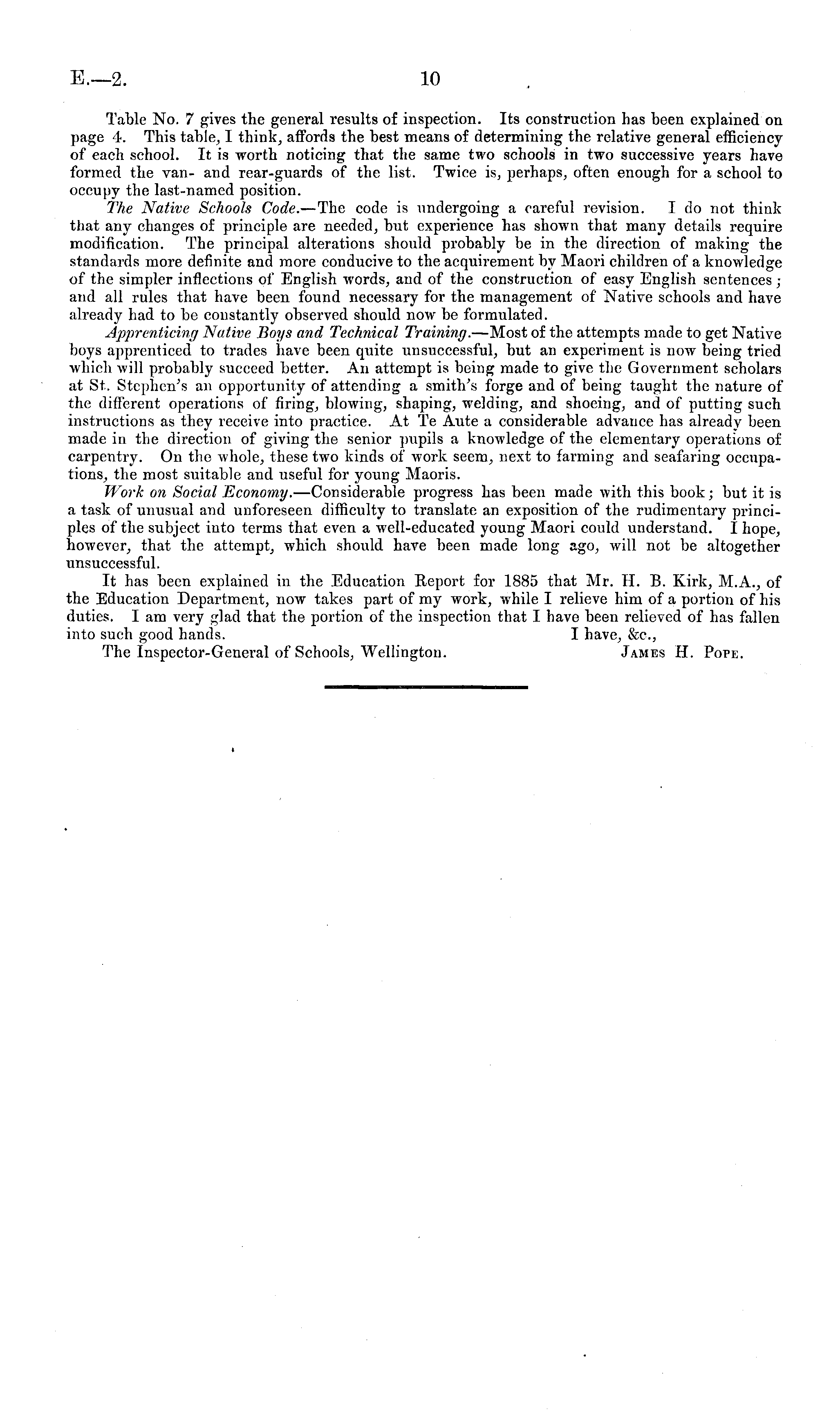 Table No. 7 gives the general results of inspection. Its construction has been explained on page 4. This table, I think, affords the best means of determining the relative general efficiency of each school. It is worth noticing that the same two schools in two successive years have formed the van- and rear-guards of the list. Twice is, perhaps, often enough for a school to occupy the last-named position. The Native Schools Code. —The code is undergoing a rareful revision. Ido not think that any changes of principle are needed, but experience has shown that many details require modification. The principal alterations should probably be in the direction of making the standards more definite and more conducive to the acquirement by Maori children of a knowledge of the simpler inflections of English words, and of the construction of easy English sentences ; and all rules that have been found necessary for the management of Native schools and have already had to be constantly observed should now be formulated. Apprenticing Native Boys and Technical Training. —Most of the attempts made to get Native boys apprenticed to trades have been quite unsuccessful, but an experiment is now being tried which will probably succeed better. An attempt is being made to give the Government scholars at St. Stephen's an opportunity of attending a smith's forge and of being taught the nature of the different operations of firing, blowing, shaping, welding, and shoeing, and of putting such instructions as they receive into practice. At Te Aute a considerable advance has already been made in the direction of giving the senior pupils a knowledge of the elementary operations of carpentry. On the whole, these two kinds of work seem, next to farming and seafaring occupations, the most suitable and useful for young Maoris. Work on Social Economy. —Considerable progress has been made with this book; but it is a task of unusual and unforeseen difficulty to translate an exposition of the rudimentarv principles of the subject into terms that even a well-educated young Maori could understand. I hope, however, that the attempt, which should have been made long ago, will not be altogether unsuccessful. It has been explained in the Education Report for 1885 that Mr. 11. B. Kirk, M.A., of the Education Department, now takes part of my work, while I relieve him of a portion of his duties. lam very glad that the portion of the inspection that I have been relieved of has fallen into such good hands. I have, &c., The Inspector-General of Schools, Wellington. James H. Pope.
