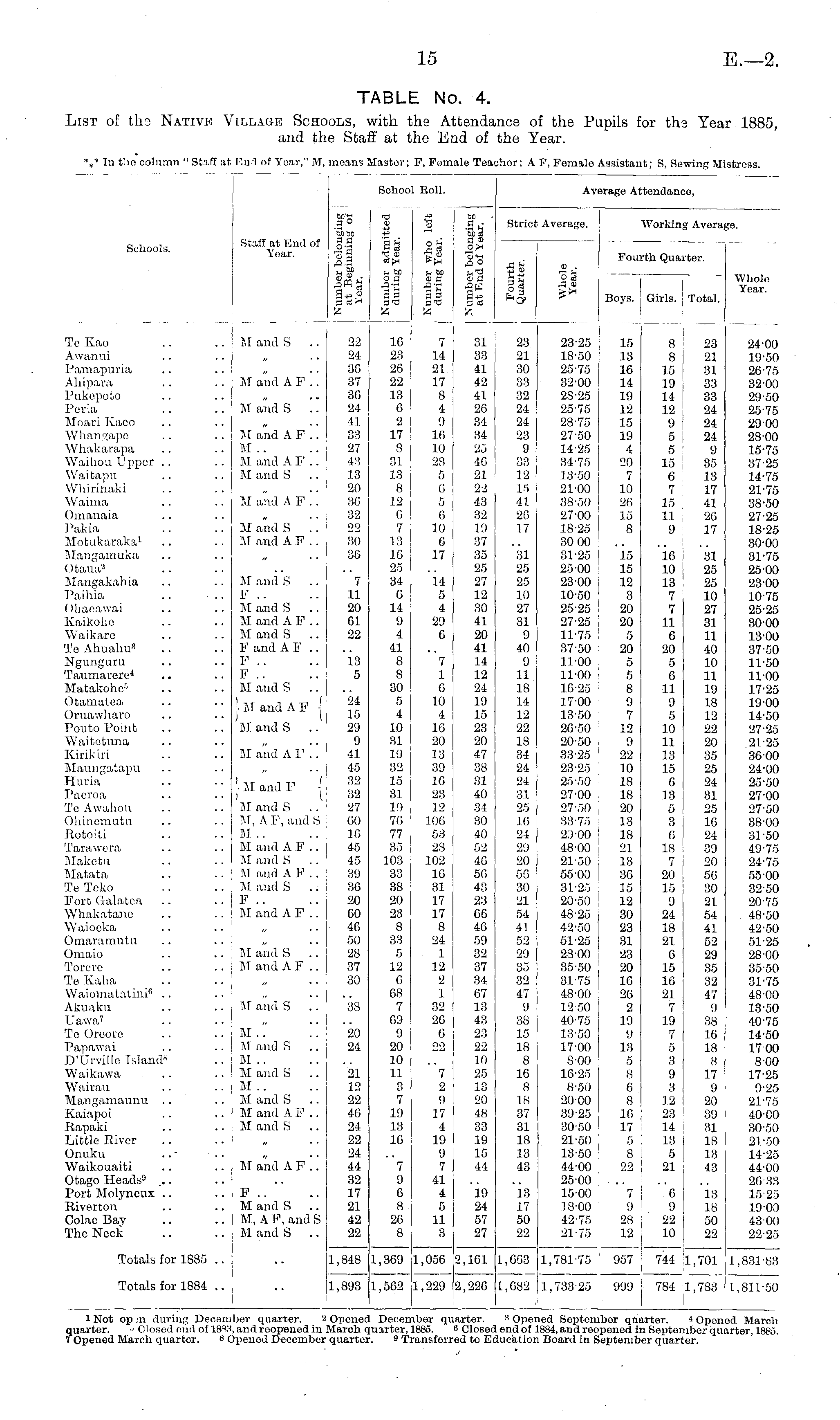 TABLE No. 4. List of the Native Village Schools, with the Attendance of the Pupils for the Year 1885, and the Staff at the End of the Year.