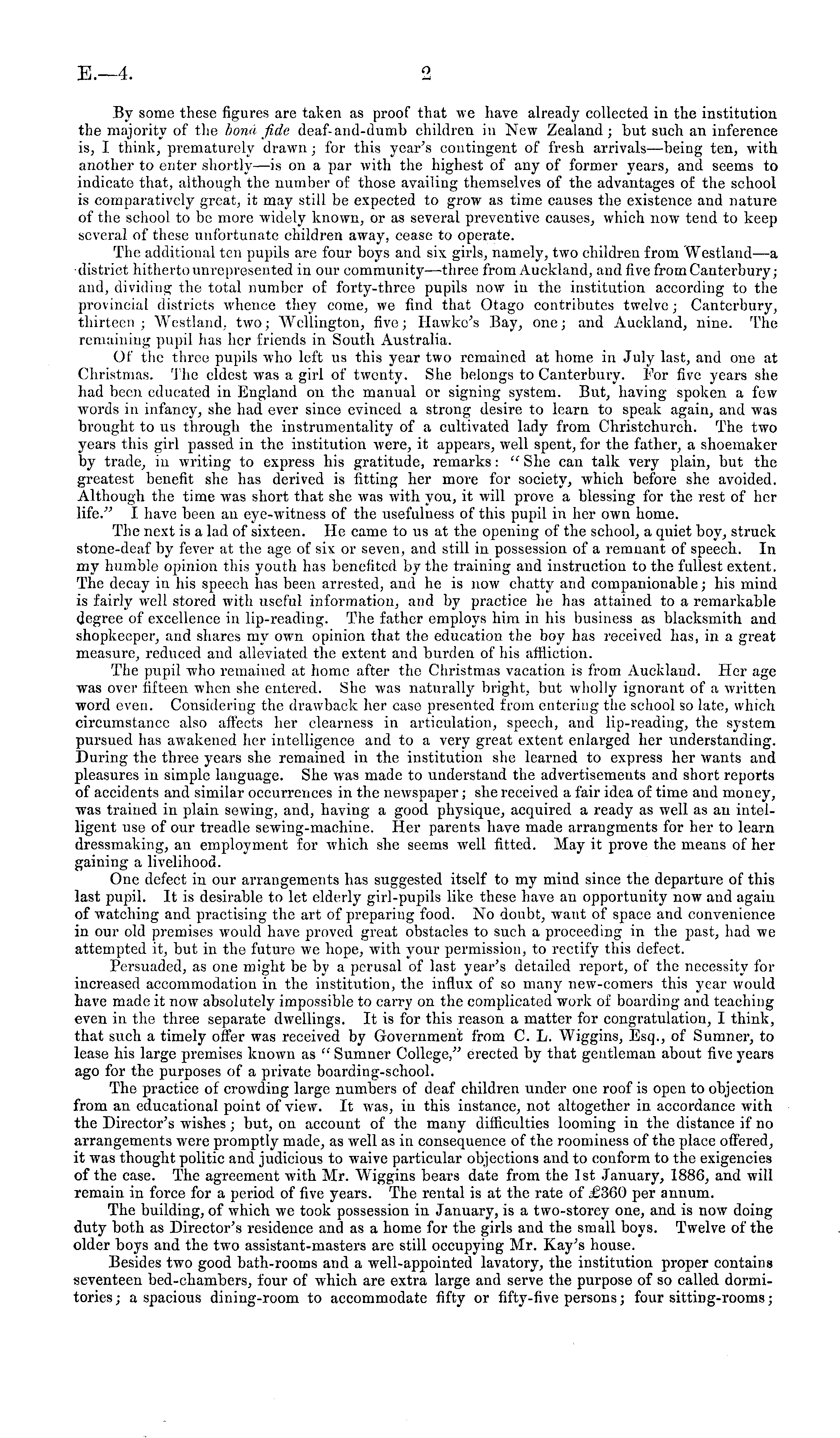 By some these figures are taken as proof that we have already collected in the institution the majority of the bona fide deaf-and-dumb children in New Zealand ; but such an inference is, I think, prematurely drawn; for this year's contingent of fresh arrivals—being ten, with another to enter shortly—is on a par with the highest of any of former years, and seems to indicate that, although the number of those availing themselves of the advantages of the school is comparatively great, it may still be expected to grow as time causes the existence and nature of the school to be more widely known, or as several preventive causes, which now tend to keep several of these unfortunate children away, cease to operate. The additional ten pupils are four boys and six girls, namely, two children from Westland—a •district hitherto unrepresented in our community—three from Auckland, and five from Canterbury; and, dividing the total number of forty-three pupils now in the institution according to the provincial districts whence they come, we find that Otago contributes twelve; Canterbury, thirteen ; Westland, two; Wellington, five; Hawko's Bay, one; and Auckland, nine. The remaining pupil has her friends in South Australia. Of the three pupils who left us this year two remained at home in July last, and one at Christmas. The eldest was a girl of twenty. She belongs to Canterbury. For five years she had been educated in England on the manual or signing system. But, having spoken a few words in infancy, she had ever since evinced a strong desire to learn to speak again, and was brought to us through the instrumentality of a cultivated lady from Christchurch. The two years this girl passed in the institution were, it appears, well spent, for the father, a shoemaker by trade, in writing to express his gratitude, remarks: " She can talk very plain, but the greatest benefit she has derived is fitting her more for society, which before she avoided. Although the time was short that she was with you, it will prove a blessing for the rest of her life." I have been an eye-witness of the usefuluess of this pupil in her own home. The next is a lad of sixteen. He came to us at the opening of the school, a quiet boy, struck stone-deaf by fever at the age of six or seven, and still in possession of a remnant of speech. In my humble opinion this youth has benefited by the training and instruction to the fullest extent. The decay in his speech has been arrested, and he is now chatty and companionable; his mind is fairly well stored with useful information, and by practice he has attained to a remarkable degree of excellence in lip-reading. The father employs him in his business as blacksmith and shopkeeper, and shares my own opinion that the education the boy has received has, in a great measure, reduced and alleviated the extent and burden of his affliction. The pupil who remained at home after the Christmas vacation is from Auckland. Her age was over fifteen when she entered. She was naturally bright, but wholly ignorant of a written word even. Considering the drawback her case presented from entering the school so late, which circumstance also affects her clearness in articulation, speech, and lip-reading, the system pursued has awakened her intelligence and to a very great extent enlarged her understanding. During the three years she remained in the institution she learned to express her wants and pleasures in simple language. She was made to understand the advertisements and short reports of accidents and similar occurrences in the newspaper; she received a fair idea of time and money, was trained in plain sewing, and, having a good physique, acquired a ready as well as an intelligent use of our treadle sewing-machine. Her parents have made arrangments for her to learn dressmaking, an employment for which she seems well fitted. May it prove the means of her gaining a livelihood. One defect in our arrangements has suggested itself to my mind since the departure of this last pupil. It is desirable to let elderly girl-pupils like these have an opportunity now and again of watching and practising the art of preparing food. No doubt, want of space and convenience in our old premises would have proved great obstacles to such a proceeding in the past, had we attempted it, but in the future we hope, with your permission, to rectify this defect. Persuaded, as one might be by a perusal of last year's detailed report, of the necessity for increased accommodation in the institution, the influx of so many new-comers this year would have made it now absolutely impossible to carry on the complicated work of boarding and teaching even in the three separate dwellings. It is for this reason a matter for congratulation, I think, that such a timely offer was received by Government from C. L. Wiggins, Esq., of Sumner, to lease his large premises known as " Sumner College," erected by that gentleman about five years ago for the purposes of a private boarding-school. The practice of crowding large numbers of deaf children under one roof is open to objection from an educational point of view. It was, in this instance, not altogether in accordance with the Director's wishes; but, on account of the many difficulties looming in the distance if no arrangements were promptly made, as well as in consequence of the roominess of the place offered, it was thought politic and judicious to waive particular objections and to conform to the exigencies of the case. The agreement with Mr. Wiggins bears date from the Ist January, 1886, and will remain in force for a period of five years. The rental is at the rate of £360 per annum. The building, of which we took possession in January, is a two-storey one, and is now doing duty both as Director's residence and as a home for the girls and the small boys. Twelve of the older boys and the two assistant-masters are still occupying Mr. Kay's house. Besides two good bath-rooms and a well-appointed lava