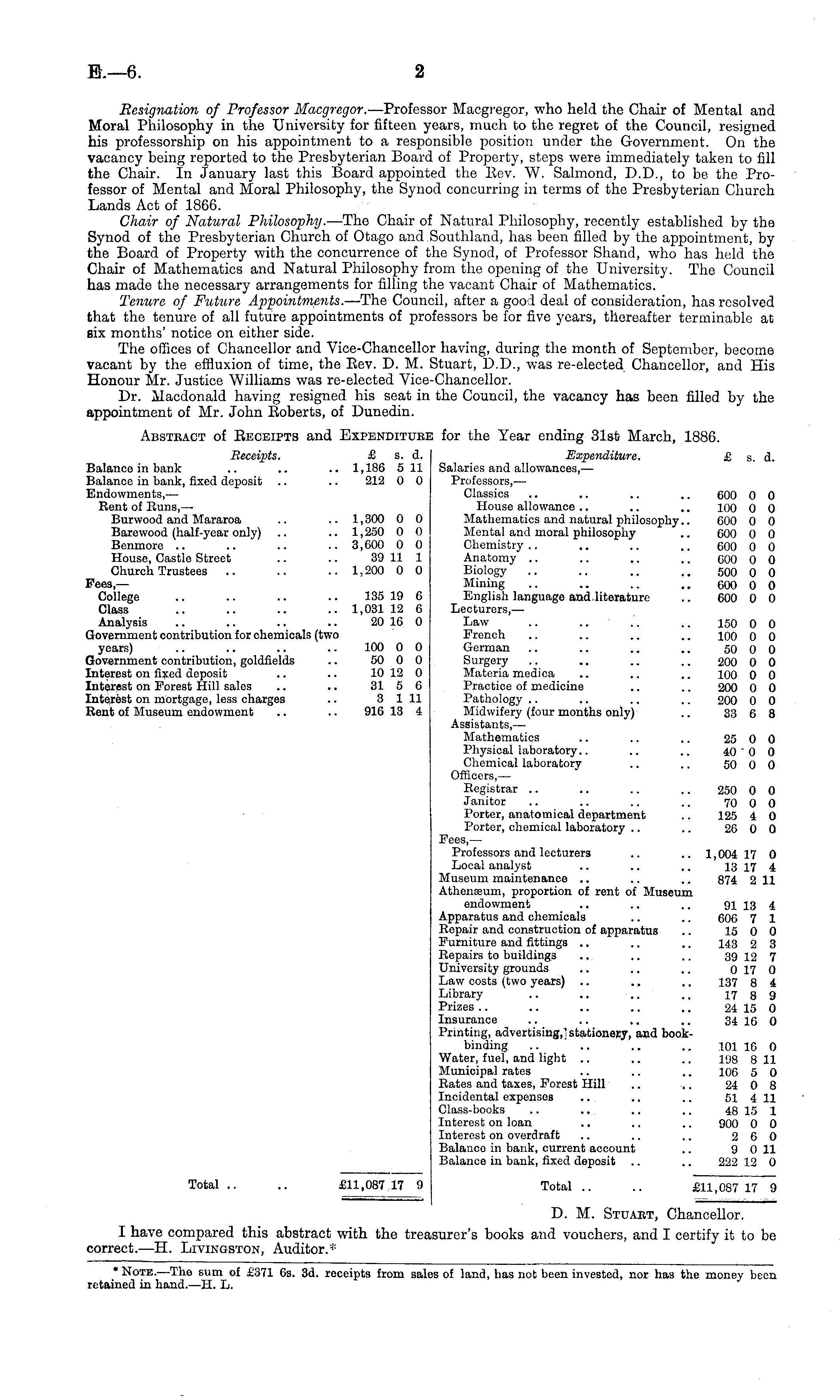 Resignation of Professor Macgregor. —Professor Macgregor, who held the Chair of Mental and Moral Philosophy in the University for fifteen years, much to the regret of the Council, resigned his professorship on his appointment to a responsible position under the Government. On the vacancy being reported to the Presbyterian Board of Property, steps were immediately taken to fill the Chair. In January last this Board appointed the Bev. W. Sahnond, D.D., to bo the Professor of Mental and Moral Philosophy, the Synod concurring in terms of the Presbyterian Church Lands Act of 1866. Chair of Natural Philosophy. —The Chair of Natural Philosophy, recently established by the Synod of the Presbyterian Church of Otago and Southland, has been filled by the appointment, by the Board of Property with the concurrence of the Synod, of Professor Shand, who has held the Chair of Mathematics and Natural Philosophy from the opening of the University. The Council has made the necessary arrangements for filling the vacant Chair of Mathematics. Tenure of Future Appointments. —The Council, after a good deal of consideration, has resolved that the tenure of all future appointments of professors be for five years, thereafter terminable at six months' notice on either side. The offices of Chancellor and Vice-Chancellor having, during the month of September, become vacant by the effluxion of time, the Bev. D. M. Stuart, D.D., was re-elected Chancellor, and His Honour Mr. Justice Williams was re-elected Vice-Chancellor. Dr. Macdonald having resigned his seat in the Council, the vacancy has been filled by the appointment of Mr. John Boberts, of Dunedin. Abstract of Beceipts and Expenditure for the Year ending 31st March, 1886. Receipts. £ s. d. Expenditure. £ s. d. Balance in bank .. .. .. 1,186 511 Salaries and allowances,— Balance in bank, fixed deposit .. .. 212 0 0 Professors, — Endowments, — Classics .. .. .. .. 600 0 0 Rent of Buns,— House allowance .. .. .. 100 0 0 Burwood and Mararoa .. .. 1,300 0 0 Mathematics and natural philosophy.. 600 0 0 Barewood (half-year only) .. .. 1, 250 0 0 Mental and moral philosophy .. 600 0 0 Benmore .. .. .. .. 3,600 0 0 Chemistry.. .. .. .. 600 0 0 House, Castle Street .. .. 39 11 1 Anatomy .. .. .. .. 600 0 0 Church Trustees .. .. .. 1,200 0 0 Biology .. .. .. .. 500 0 0 Fees,— Mining .. .. .. .. 600 0 0 College .. .. .. .. 135 19 6 English language and literature .. 600 0 0 Class .. .. .. .. 1,031 12 6 Lecturers,— Analysis .. .. .. .. 20 16 0 Law .. .. .. .. 150 0 0 Government contribution for chemicals (two French .. .. .. .. 100 0 0 years) .. .. .. .. 100 0 0 German .. .. .. .. 50 0 0 Government contribution, goldfields .. 50 0 0 Surgery .. .. .. .. 200 0 0 Interest on fixed deposit .. .. 10 12 0 Materia medica .. .. .. 100 0 0 Interest on Forest Hill sales .. .. 31 5 6 Practico of medicine .. .. 200 0 0 Interest on mortgage, less charges .. 3 1 11 Pathology .. .. .. .. 200 0 0 Rent of Museum endowment .. .. 916 13 4 Midwifery (four months only) .. 33 6 8 Assistants, — Mathematics .. .. .. 25 0 0 Physical laboratory.. .. .. 40 ' 0 0 Chemical laboratory .. .. 50 0 0 Officers, — Registrar .. .. .. .. 250 0 0 Janitor .. .. .. .. 70 0 0 Porter, anatomical department .. 125 4 0 Porter, chemical laboratory .. .. 26 0 0 Fees, — Professors and lecturers .. .. 1,004 17 0 Local analyst .. .. .. 13 17 4 Museum maintenance .. .. .. 874 2 11 Athenaeum, proportion of rent of Museum endowment .. .. .. 91 13 4 Apparatus and chemicals .. .. 606 7 1 Repair and construction of apparatus .. 15 0 0 Furniture and fittings .. .. .. 143 2 3 Repairs to buildings .. .. .. 39 12 7 University grounds .. .. .. 017 0 Law costs (two years) .. .. .. 137 8 4 Library .. .. .. ~ 17 8 9 Prizes .. .. .. .. .. 24 15 0 Insurance .. .. .. .. 34 16 0 Printing, advertising,:stationery, and bookbinding .. .. .. .. 101 16 0 Water, fuel, and light .. .. .. 198 8 11 Municipal rates .. .. .. 106 5 0 Rates and taxes, Forest Hill .. .. 24 0 8 Incidental expenses .. .. .. 51 4 11 Class-books .. .. .. .. 48 15 1 Interest on loan .. .. .. 900 0 0 Interest on overdraft .. .. .. 2 0 0 Balanco in bank, current account .. 9 0 11 Balance in bank, fixed deposit .. .. 222 12 0 Total.. .. £11,087 17 9 Total .. .. £11,087 V7~9 D. M. Stuart, Chancellor. I have compared this abstract with the treasurer's books and vouchers, and I certify it to be correct.—H. Livingston, Auditor.*