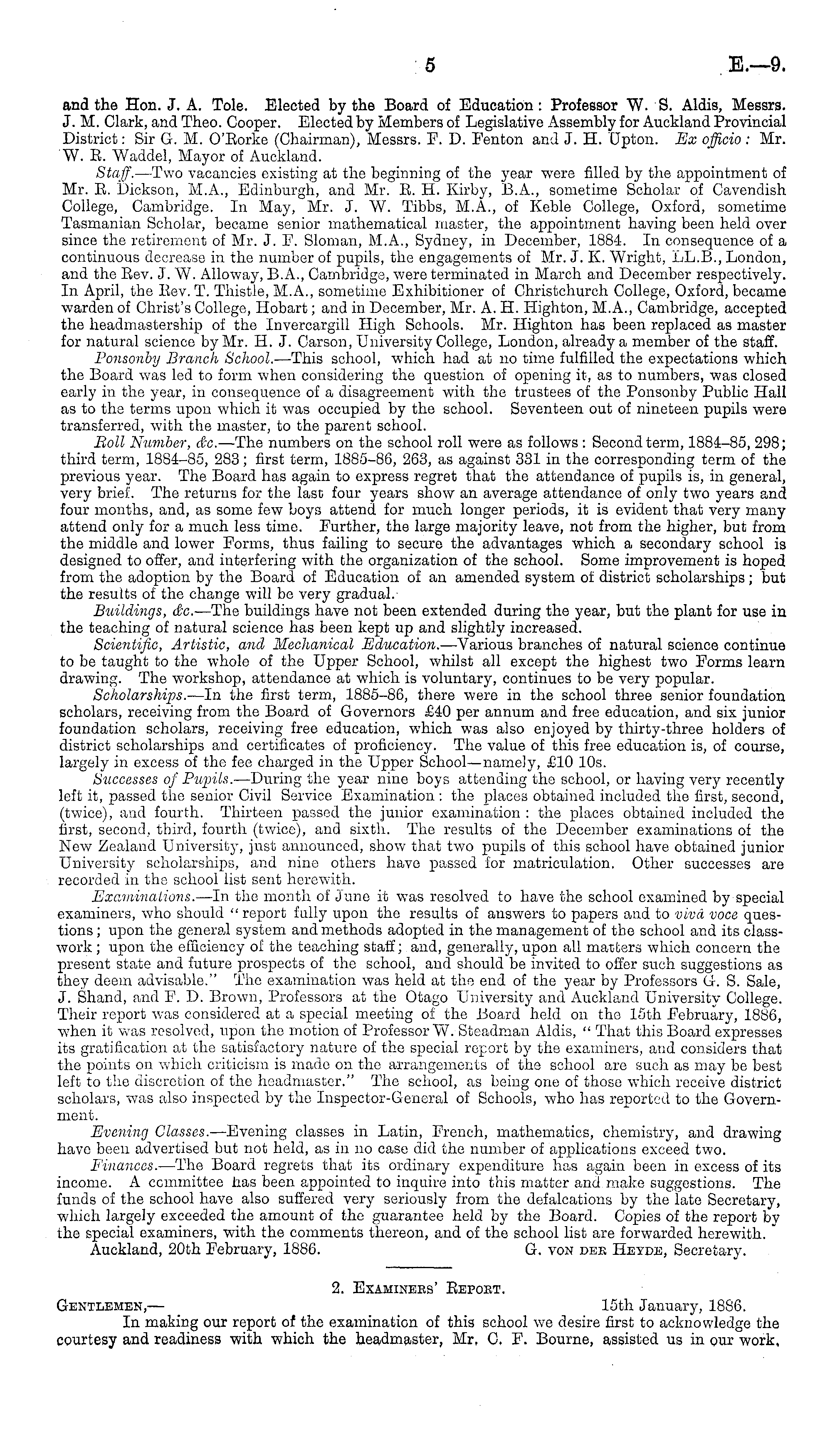 and the Hon. J. A. Tole. Elected by the Board of Education : Professor W. S. Aldis, Messrs. J. M. Clark, and Theo. Cooper. Elected by Members of Legislative Assembly for Auckland Provincial District: Sir G. M. O'Eorke (Chairman), Messrs. F. D. Fenton and J. H. Upton. Ex offlcio : Mr. "W. E. Waddel, Mayor of Auckland. Staff. —Two vacancies existing at the beginning of the year were filled by the appointment of Mr. E. Dickson, M.A., Edinburgh, and Mr. E. H. Kirby, 8.A., sometime Scholar of Cavendish College, Cambridge. In May, Mr. J. W. Tibbs, M.A., of Keble College, Oxford, sometime Tasmanian Scholar, became senior mathematical master, the appointment having been held over since the retirement of Mr. J. F. Sloman, M.A., Sydney, in December, 1884. In consequence of a continuous decrease in the number of pupils, the engagements of Mr. J. K. Wright, LL.B., London, and the Eev. J. W. Alloway, 8.A., Cambridge, were terminated in March and December respectively. In April, the Eev. T. Thistle, M.A., sometime Exhibitioner of Christchurch College, Oxford, became warden of Christ's College, Hobart; and in December, Mr. A. H. Highton, M.A., Cambridge, accepted the headmastership of the Invercargill High Schools. Mr. Highton has been replaced as master for natural science by Mr. 11. J. Carson, University College, London, already a member of the staff. I'onsonby Branch School. —This school, which had at no time fulfilled the expectations which the Board was led to form when considering the question of opening it, as to numbers, was closed early in the year, in consequence of a disagreement with the trustees of the Ponsonby Public Hall as to the terms upon which it was occupied by the school. Seventeen out of nineteen pupils were transferred, with the master, to the parent school. 801 l Number, &c. —The numbers on the school roll were as follows : Second term, 1884-85, 298; third term, 18S4-85, 283; first term, 1885-86, 263, as against 331 in the corresponding term of the previous year. The Board has again to express regret that the attendance of pupils is, in general, very brief. The returns for the last four years show an average attendance of only two years and four months, and, as some few boys attend for much longer periods, it is evident that very many attend only for a much less time. Further, the large majority leave, not from the higher, but from the middle and lower Forms, thus failing to secure the advantages which a secondary school is designed to offer, and interfering with the organization of the school. Some improvement is hoped from the adoption by the Board of Education of an amended system of district scholarships; but the results of the change will be very gradual. Buildings, do. —The buildings have not been extended during the year, but the plant for use in the teaching of natural science has been kept up and slightly increased. Scientific, Artistic, and Mechanical Education. —Various branches of natural science continue to be taught to the whole of the Upper School, whilst all except the highest two Forms learn drawing. The workshop, attendance at which is voluntary, continues to be very popular. Scholarships. —ln the first term, 1885-86, there were in the school three senior foundation scholars, receiving from the Board of Governors £40 per annum and free education, and six junior foundation scholars, receiving free education, which was also enjoyed by thirty-three holders of district scholarships and certificates of proficiency. The value of this free education is, of course, largely in excess of the fee charged in the Upper School—namely, £10 10s. Successes of Pupils. —During the year nine boys attending the school, or having very recently left it, passed the senior Civil Service Examination : the places obtained included the first, second, (twice), and fourth. Thirteen passed the junior examination : the places obtained included the first, second, third, fourth (twice), and sixth. The results of the December examinations of the New Zealand University, just announced, show that two pupils of this school have obtained junior University scholarships, and nine others have passed for matriculation. Other successes are recorded in the school list sent herewith. Examinations. —ln the month of June it was resolved to have the school examined by special examiners, who should "report fully upon the results of answers to papers and to viva voca questions ; upon the general system and methods adopted in the management of the school and its classwork ; upon the efficiency of the teaching staff; and, generally, upon all matters which concern the present state and future prospects of the school, and should be invited to offer such suggestions as they deem advisable." The examination was held at the end of the year by Professors G. S. Sale, J. Shand, and F. D. Brown, Professors at the Otago University and Auckland University College. Their report was considered at a special meeting of the -Board held on the loth February, 1886, when it was resolved, upon the motion of Professor W. Steadman Aldis, " That this Board expresses its gratification at the satisfactory nature of the special report by the examiners, and considers that the points on which criticism is made on the arrangements of the school are such as may be best left to the discretion of the headmaster." The school, as being one of those which receive district scholars, was also inspected by the Inspector-General of Schools, who lias reported to the Government. Evening Classes. —Evening classes in Latin, French, mathematics, chemistry, and drawing have been advertised but not held, as in no case did the number of applications exceed two. Finances. —The Board regrets that its ordinary expenditure has again been in excess of its income. A cemmittee has been appointed to inquire into this matter and make suggestions. The funds of the school have also suffered very seriously from the defalcations by the late Secreta