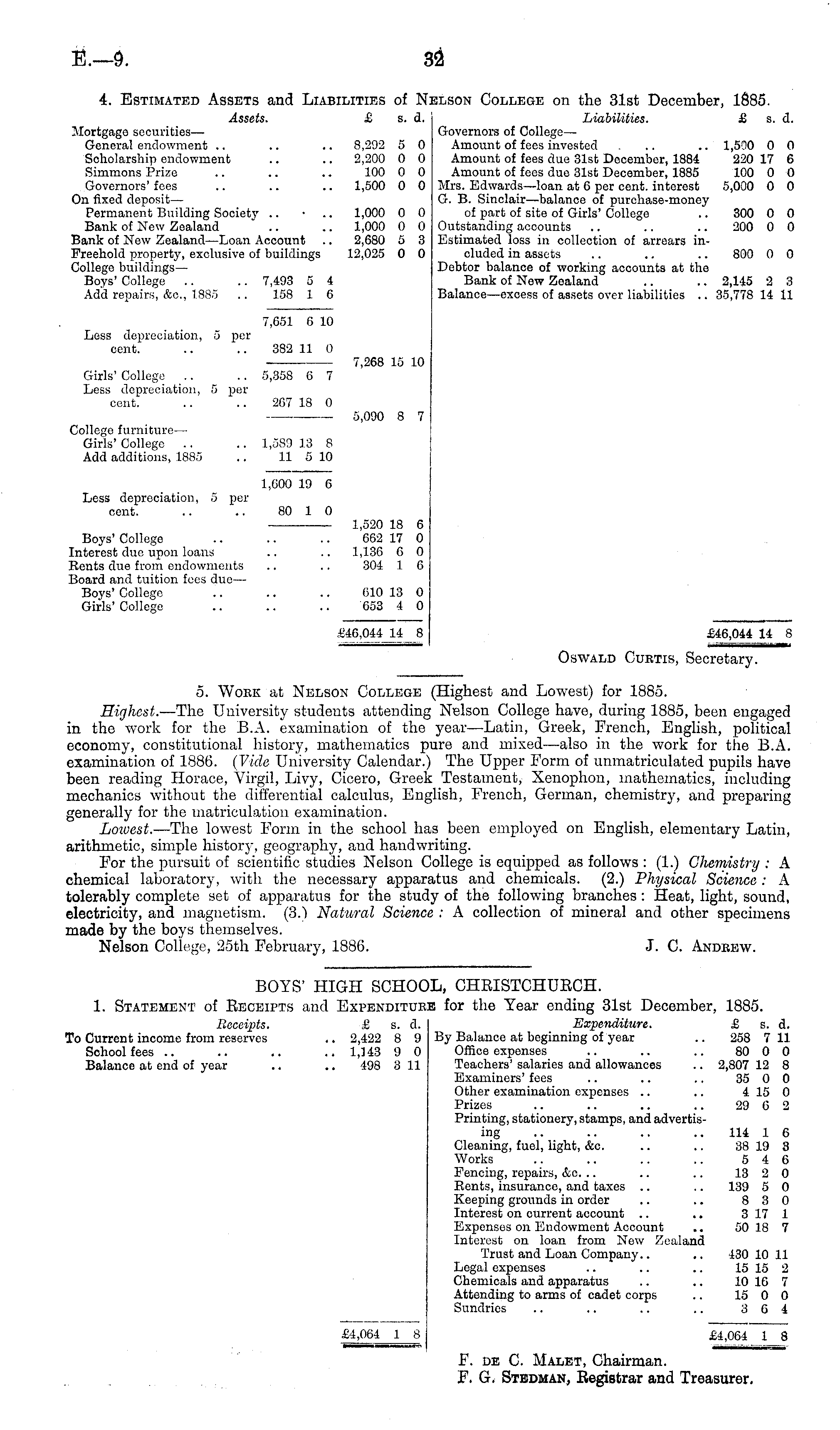 BOYS' HIGH SCHOOL, CHEISTCHDECH. 1. Statement of Eeceipts and Exvendituee for the Year ending 31st December, 1885. Receipts. £ s. d. Expenditure. £ s. d. To Current income from reserves .. 2,422 8 9 By Balance at beginning of year .. 258 711 School fees .. .. .. .. 1,143 9 0 Office expenses .. .. .. 80 0 0 Balance at end of year .. .. 498 311 Teachers'salaries and allowances .. 2,807 12 8 Examiners' fees .. .. .. 35 0 0 Other examination expenses .. .. 4 15 0 Prizes .. .. .. .. 29 6 2 Printing, stationery, stamps, and advertising .. .. .. .. 114 1 6 Cleaning, fuel, light, &c. .. .. 38 19 3 Works .. .. .. .. 5 4 6 Fencing, repairs, <ic. .. .. .. 13 2 0 Rents, insurance, and taxes .. .. 139 5 0 Keeping grounds in order .. .. 8 3 0 Interest on current account .. .. 3 17 1 Expenses on Endowment Account .. 50 18 7 Interest on loan from New Zealand Trust and Loan Company.. .. 430 10 11 Legal expenses .. .. .. 15 15 2 Chemicals and apparatus .. .. 10 16 7 Attending to arms of cadet corps .. 15 0 0 Sundries .. .. .. .. 3 6 4 F. de C. Malet, Chairman. F. G. Stbdman, Registrar and Treasurer,