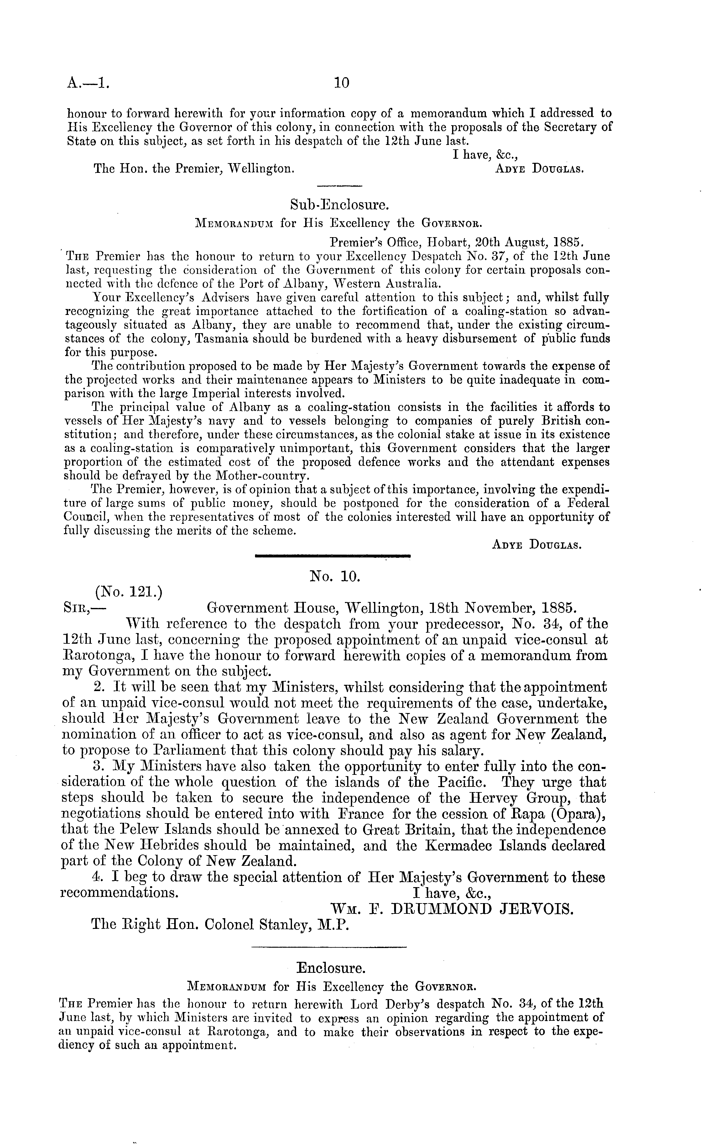 Sub-Enclosure. Memorandum for His Excellency the Governor. Premier's Office, Hobart, 20th August, 1885. The Premier has the honour to return to your Excellency Despatch No. 37, of the 12th June last, requesting the consideration of the Government of this colony for certain proposals connected with the defence of the Port of Albany, Western Australia. Your Excellency's Advisers have given careful attention to this subject; and, whilst fully recognizing the great importance attached to the fortification of a coaling-station so advantageously situated as Albany, they are unable to recommend that, under the existing circumstances of the colony, Tasmania should be burdened with a heavy disbursement of public funds for this purpose. The contribution proposed to be made by Her Majesty's Government towards the expense of the projected works and their maintenance appears to Ministers to be quite inadequate in comparison with the large Imperial interests involved. The principal value of Albany as a coaling-station consists in the facilities it affords to vessels of Her Majesty's navy and to vessels belonging to companies of purely British constitution; and therefore, under these circumstances, as the colonial stake at issue in its existence as a coaling-station is comparatively unimportant, this Government considers that the larger proportion of the estimated cost of the proposed defence works and the attendant expenses should be defrayed by the Mother-country. The Premier, however, is of opinion that a subject of this importance, involving the expenditure of large sums of public money, should be postponed for the consideration of a Federal Council, when the representatives of most of the colonies interested will have an opportunity of fully discussing the merits of the scheme. Adye Douglas.