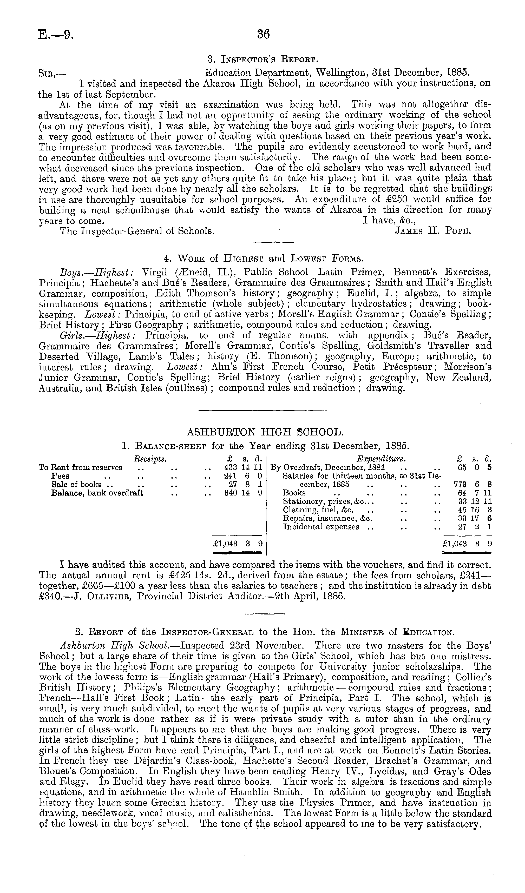 3. Inspectoe's Eepoet. Sir,— Education Department, Wellington, 31st December, 1885. I visited and inspected the Akaroa High School, in accordance with your instructions, on the Ist of last September. At the time of my visit an examination was being held. This was not altogether disadvantageous, for, though I had not an opportunity of seeing the ordinary working of the school (as on my previous visit), I was able, by watching the boys and girls working their papers, to form a very good estimate of their power of dealing with questions based on their previous year's work. The impression produced was favourable. The pupils are evidently accustomed to work hard, and to encounter difficulties and overcome them satisfactorily. The range of the work had been somewhat decreased since the previous inspection. One of the old scholars who was well advanced had left, and there were not as yet any others quite fit to take his place; but it was quite plain that very good work had been done by nearly all the scholars. It is to be regretted that the buildings in use are thoroughly unsuitable for school purposes. An expenditure of £250 would suffice for building a neat schoolhouse that would satisfy the wants of Akaroa in this direction for many years to come. I have, &c, The Inspector-General of Schools. James H. Pope.