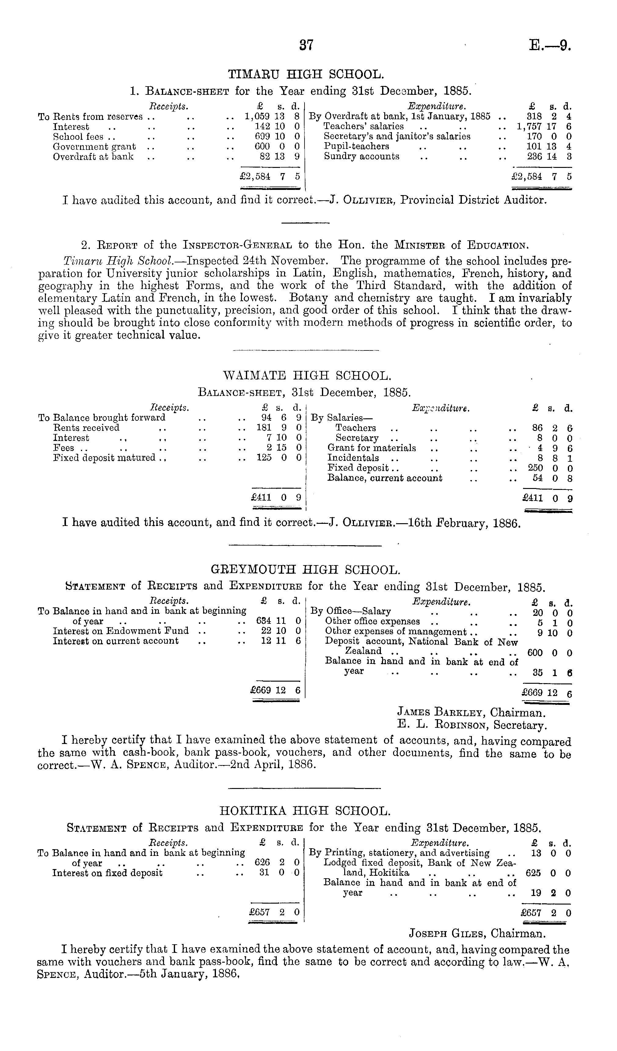 TIMAEU HIGH SCHOOL. 1. Balance-sheet for the Year ending 31st Decamber, 1885. Receipts. £ s. d. Expenditure. £ s. d. To Rents from reserves .. .. .. 1,059 13 8 By Overdraft at bank, Ist January, 1885 .. 318 2 4 Interest .. .. .. .. 142 10 0 Teachers' salaries .. .. .. 1,757 17 6 School foes .. .. .. .. 699 10 0 Secretary's and janitor's salaries .. 170 0 0 Government grant .. .. .. 600 0 0 Pupil-teachers .. .. .. 101 13 4 Overdraft at bank .. .. .. 82 13 9 Sundry accounts .. .. .. 230 14 3 £2,584 7 5 £2,584 7 5 I have audited this account, and find it correct.—J. Ollivier, Provincial District Auditor.