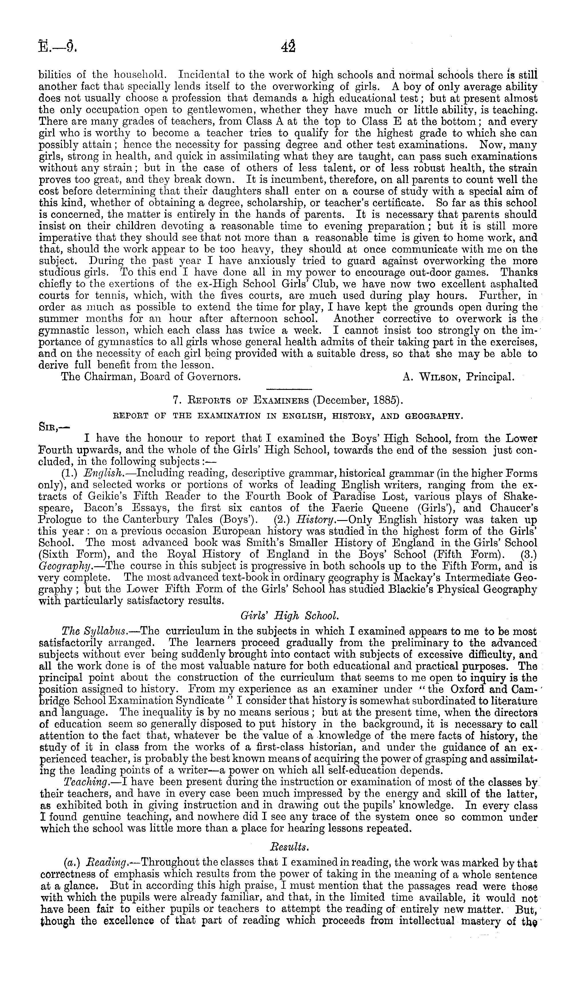 7. Eepoets op Examinees (December, 1885). EEPOET OP THE EXAMINATION IN ENGLISH, HISTOEY, AND GEOGEAPHY. SlE,— I have the honour to report that I examined the Boys' High School, from the Lower Fourth upwards, and the whole of the Girls' High School, towards the end of the session just concluded, in the following subjects :— (1.) English. —lncluding reading, descriptive grammar, historical grammar (in the higher Forms only), and selected works or portions of works of leading English writers, ranging from the extracts of Gcikie's Fifth Eeader to the Fourth Book of Paradise Lost, various plays of Shakespeare, Bacon's Essays, the first six cantos of the Faerie Queene (Girls'), and Chaucer's Prologue to the Canterbury Tales (Boys'). (2.) History. —Only English history was taken up this year : on a previous occasion European history was studied in the highest form of the Girls' School. The most advanced book was Smith's Smaller History of England in the Girls' School (Sixth Form), and the Eoyal History of England in the Boys' School (Fifth Form). (3.) Geography. —The course in this subject is progressive in both schools up to the Fifth Form, and is very complete. The most advanced text-book in ordinary geography is Mackay's Intermediate Geography ; but the Lower Fifth Form of the Girls' School has studied Blackie's Physical Geography with particularly satisfactory results. Girls' High School. The Syllabus. —The curriculum in the subjects in which I examined appears to me to be most satisfactorily arranged. The learners proceed gradually from the preliminary to the advanced subjects without ever being suddenly brought into contact with subjects of excessive difficulty, and all the work done is of the most valuable nature for both educational and practical purposes. The principal point about the construction of the curriculum that seems to me open to inquiry is the position assigned to history. From my experience as an examiner under "the Oxford and Cambridge School Examination Syndicate " I consider that history is somewhat subordinated to literature and language. The inequality is by no means serious ; but at the present time, when the directors of education seem so generally disposed to put history in the background, it is necessary to call attention to the fact that, whatever be the value of a knowledge of the mere facts of history, the study of it in class from the works of a first-class historian, and under the guidance of an experienced teacher, is probably the best known means of acquiring the power of grasping and assimilating the leading points of a writer—a power on which all self-education depends. Teaching. —l have been present during the instruction or examination of most of the classes by their teachers, and have in every case been much impressed by the energy and skill of the latter, as exhibited both in giving instruction and in drawing out the pupils' knowledge. In every class I found genuine teaching, and nowhere did I see any trace of the system once so common under which the school was little more than a place for hearing lessons repeated. Results. (a.) Beading, —Throughout the classes that I examined in reading, the work was marked by that correctness of emphasis which results from the power of taking in the meaning of a whole sentence at a glance. But in according this high praise, I must mention that the passages read were those with which the pupils were already familiar, and that, in the limited time available, it would not have been fair to either pupils or teachers to attempt the reading of entirely new matter. But, though the excellence of that part of reading which proceeds from intellectual mastery of the