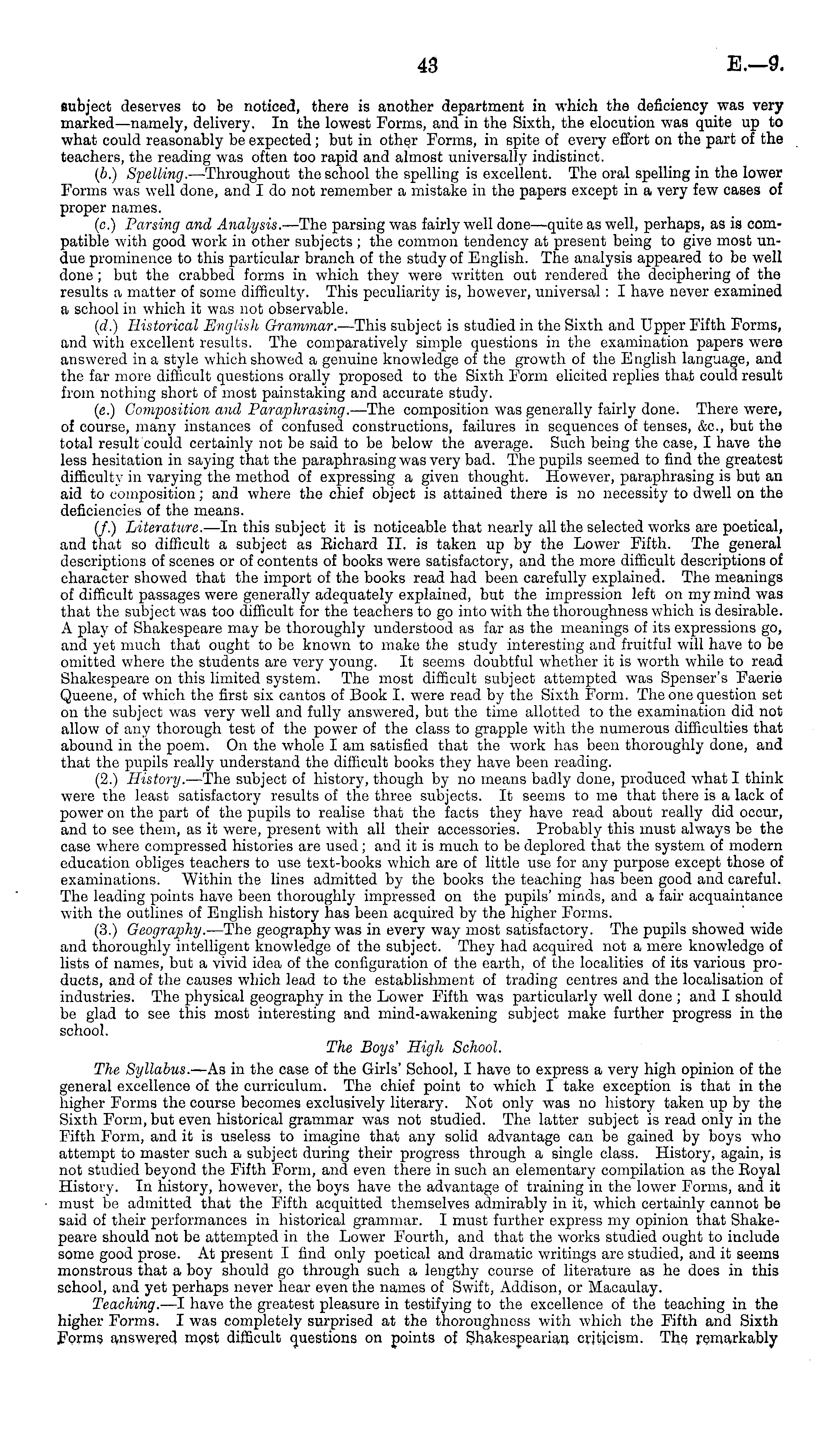 subject deserves to be noticed, there is another department in which the deficiency was very marked—namely, delivery. In the lowest Forms, and in the Sixth, the elocution was quite up to what could reasonably be expected; but in other Forms, in spite of every effort on the part of the teachers, the reading was often too rapid and almost universally indistinct. (b.) Spelling. —Throughout the school the spelling is excellent. The oral spelling in the lower Forms was well done, and I do not remember a mistake in the papers except in a very few cases of proper names. (c.) Parsing and Analysis. —The parsing was fairly well done—quite as well, perhaps, as is compatible with good work in other subjects; the common tendency at present being to give most undue prominence to this particular branch of the study of English. The analysis appeared to be well done; but the crabbed forms in which they were written out rendered the deciphering of the results a matter of some difficulty. This peculiarity is, however, universal: I have never examined a school in which it was not observable. (d.) Historical English Grammar. —This subject is studied in the Sixth and Upper Fifth Forms, and with excellent results. The comparatively simple questions in the examination papers were answered in a style which showed a genuine knowledge of the growth of the English language, and the far more difficult questions orally proposed to the Sixth Form elicited replies that could result from nothing short of most painstaking and accurate study. (c.) Composition and Paraphrasing. —The composition was generally fairly done. There were, of course, many instances of confused constructions, failures in sequences of tenses, &c, but the total result could certainly not be said to be below the average. Such being the case, I have the less hesitation in saying that the paraphrasing was very bad. The pupils seemed to find the greatest difficulty in varying the method of expressing a given thought. However, paraphrasing is but an aid to composition; and where the chief object is attained there is no necessity to dwell on the deficiencies of the means. (/.) Literature. —ln this subject it is noticeable that nearly all the selected works are poetical, and that so difficult a subject as Eichard 11. is taken up by the Lower Fifth. The general descriptions of scenes or of contents of books were satisfactory, and the more difficult descriptions of character showed that the import of the books read had been carefully explained. The meanings of difficult passages were generally adequately explained, but the impression left on my mind was that the subject was too difficult for the teachers to go into with the thoroughness which is desirable. A play of Shakespeare may be thoroughly understood as far as the meanings of its expressions go, and yet much that ought to be known to make the study interesting and fruitful will have to be omitted where the students are very young. It seems doubtful whether it is worth while to read Shakespeare on this limited system. The most difficult subject attempted was Spenser's Faerie Queene, of which the first six cantos of Book I. were read by the Sixth Form. The one question set on the subject was very well and fully answered, but the time allotted to the examination did not allow of any thorough test of the power of the class to grapple with the numerous difficulties that abound in the poem. On the whole lam satisfied that the work has been thoroughly done, and that the pupils really understand the difficult books they have been reading. (2.) History. —The subject of history, though by no means badly done, produced what I think were the least satisfactory results of the three subjects. It seems to me that there is a lack of power on the part of the pupils to realise that the facts they have read about really did occur, and to see them, as it were, present with all their accessories. Probably this must always be the case where compressed histories are used; and it is much to be deplored that the system of modern education obliges teachers to use text-books which are of little use for any purpose except those of examinations. Within the lines admitted by the books the teaching has been good and careful. The leading points have been thoroughly impressed on the pupils' minds, and a fair acquaintance with the outlines of English history has been acquired by the higher Forms. (3.) Geography. —The geography was in every way most satisfactory. The pupils showed wide and thoroughly intelligent knowledge of the subject. They had acquired not a mere knowledge of lists of names, but a vivid idea of the configuration of the earth, of the localities of its various products, and of the causes which lead to the establishment of trading centres and the localisation of industries. The physical geography in the Lower Fifth was particularly well done ; and I should be glad to see this most interesting and mind-awakening subject make further progress in the school. The Boys' High School. The Syllabus. —As in the case of the Girls' School, I have to express a very high opinion of the general excellence of the curriculum. The chief point to which I take exception is that in the higher Forms the course becomes exclusively literary. Not only was no history taken up by the Sixth Form, but even historical grammar was not studied. The latter subject is read only in the Fifth Form, and it is useless to imagine that any solid advantage can be gained by boys who attempt to master such a subject during their progress through a single class. History, again, is not studied beyond the Fifth Form, and even there in such an elementary compilation as the Eoyal History. In history, however, the boys have the advantage of training in the lower Forms, and it must be admitted that the Fifth acquitted themselves admirably in it, which certainly cannot be said of their performances in historical grammar. I must further express my op