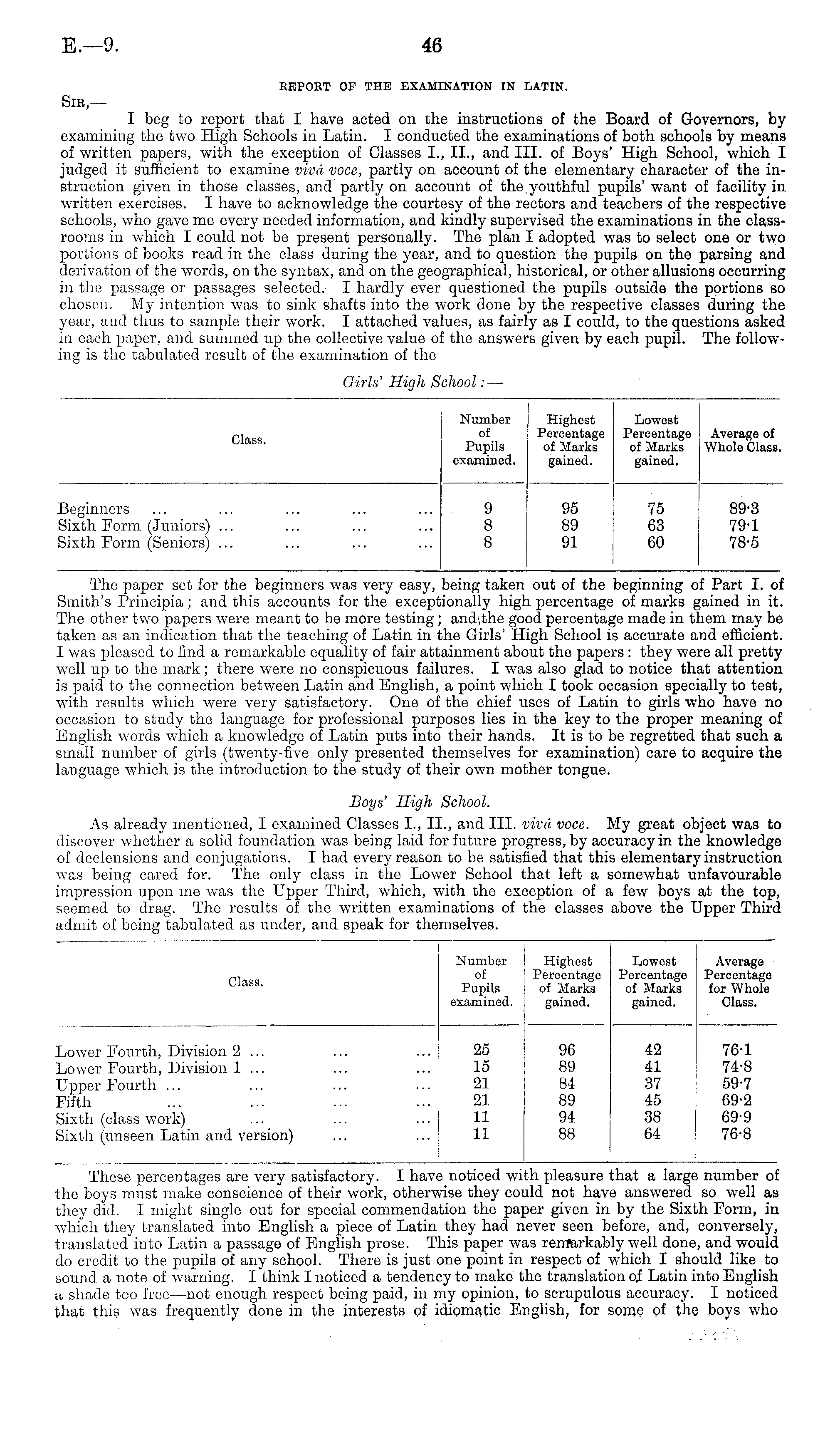 report op the examination in latin. Sir,— I beg to report that I have acted on the instructions of the Board of Governors, by examining the two High Schools in Latin. I conducted the examinations of both schools by means of written papers, with the exception of Classes 1., 11., and 111. of Boys' High School, which I judged it sufficient to examine viva voce, partly on account of the elementary character of the instruction given in those classes, and partly on account of the.youthful pupils' want of facility in written exercises. I have to acknowledge the courtesy of the rectors and teachers of the respective schools, who gave me every needed information, and kindly supervised the examinations in the classrooms in which I could not be present personally. The plan I adopted was to select one or two portions of books read in the class during the year, and to question the pupils on the parsing and derivation of the words, on the syntax, and on the geographical, historical, or other allusions occurring in the passage or passages selected. I hardly ever questioned the pupils outside the portions so chosen. My intention was to sink shafts into the work done by the respective classes during the year, and thus to sample their work. I attached values, as fairly as I could, to the questions asked in each paper, and summed up the collective value of the answers given by each pupil. The following is the tabulated result of the examination of the Girls' High School: —