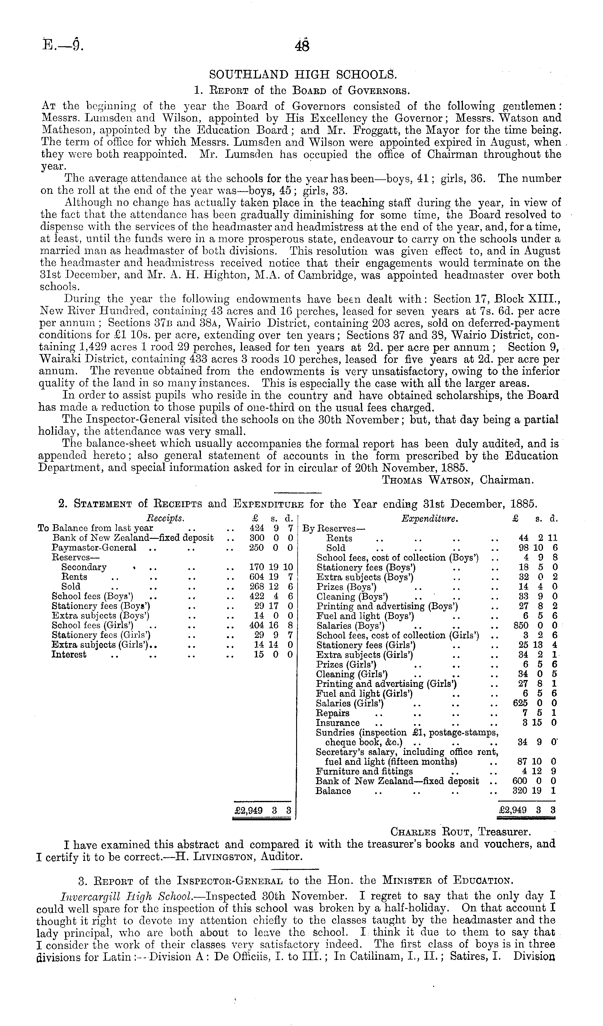 SOUTHLAND HIGH SCHOOLS. 1. Eepoet of the Board of Governors. At the beginning of the year the Board of Governors consisted of the following gentlemen: Messrs. Lumsden and Wilson, appointed by His Excellency the Governor; Messrs. Watson and Matheson, appointed by the Education Board; and Mr. Froggatt, the Mayor for the time being. The term of office for which Messrs. Lumsden and Wilson were appointed expired in August, when they were both reappointed. Mr. Lumsden has occupied the office of Chairman throughout the year. The average attendance at the schools for the year has been —boys, 41; girls, 36. The number on the roll at the end of the year was —boys, 45 ; girls, 33. Although no change has actually taken place in the teaching staff during the year, in view of the fact that the attendance has been gradually diminishing for some time, the Board resolved to dispense with the services of the headmaster and headmistress at the end of the year, and, for a time, at least, until the funds were in a more prosperous state, endeavour to carry on the schools under a married man as headmaster of both divisions. This resolution w Tas given effect to, and in August the headmaster and headmistress received notice that their engagements would terminate on the 31st December, and Mr. A. H. Highton, M.A. of Cambridge, was appointed headmaster over both schools. During the year the following endowments have been dealt with : Section 17, Block XIII., New Eiver Hundred, containing 43 acres and 16 perches, leased for seven years at 7s. 6d. per acre per annum ; Sections 37b and 38a, Wairio District, containing 203 acres, sold on deferred-payment conditions for £1 10s. per acre, extending over ten years; Sections 37 and 33, Wairio District, containing 1,429 acres 1 rood 29 perches, leased for ten years at 2d. per acre per annum ; Section 9, Wairaki District, containing 433 acres 3 roods 10 perches, leased for five years at 2d. per acre per annum. The revenue obtained from the endowments is very unsatisfactory, owing to the inferior quality of the land in so many instances. This is especially the case with all the larger areas. In order to assist pupils who reside in the country and have obtained scholarships, the Board has made a reduction to those pupils of one-third on the usual fees charged. The Inspector-General visited the schools on the 30th November; but, that day being a partial holiday, the attendance was very small. The balance-sheet which usually accompanies the formal report has been duly audited, and is appended hereto; also general statement of accounts in the form prescribed by the Education Department, and special information asked for in circular of 20th November, 1885. Thomas Watson, Chairman.