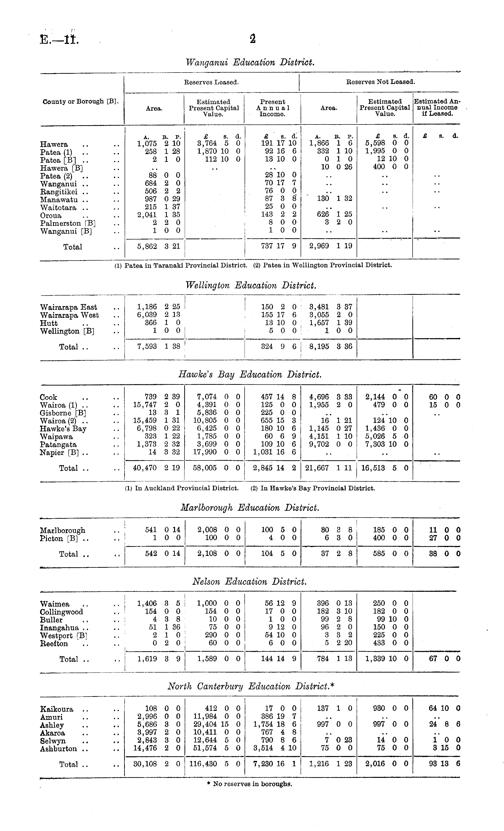 Eeserves Leased. Eoi serves Not Leasei County or Borough [B]. Area. Estimated Present Capital Value. Present Annual Income. Area. Estimated Present Capital Value. Estimated Annual Income if Leased. Hawera Patea (1) .. Patea [B] .. Hawera [B] Patea (2) .. Wanganui .. Rangitikei .. Manawatu .. Waitotara .. Oroua Palmerston [B] Wanganui [B] A. B. P. 1,075 2 10 258 1 28 2 10 £ a. d. 3,764 5 0 1,870 10 0 112 10 0 £ s. d. 191 17 10 92 16 6 13 10 0 A. B. P. 1,866 1 6 332 1 10 0 10 10 0 26 £ s. d. 5,598 0 0 1,995 0 0 12 10 0 400 0 0 £ a. d. 88 0 0 684 2 0 506 2 2 987 0 29 215 1 37 2,041 1 35 2 2 0 10 0 28 10 0 70 17 7 76 0 0 87 3 8 25 0 0 143 2 2 8 0 0 10 0 130' 1 32 I 626' 1 25 3 2 0 Total 5,862 3 21 737 17 9 2,969 1 19 (1) Patea in Taranaki Provincial District. (2) Patea in Wellington Provincial District.