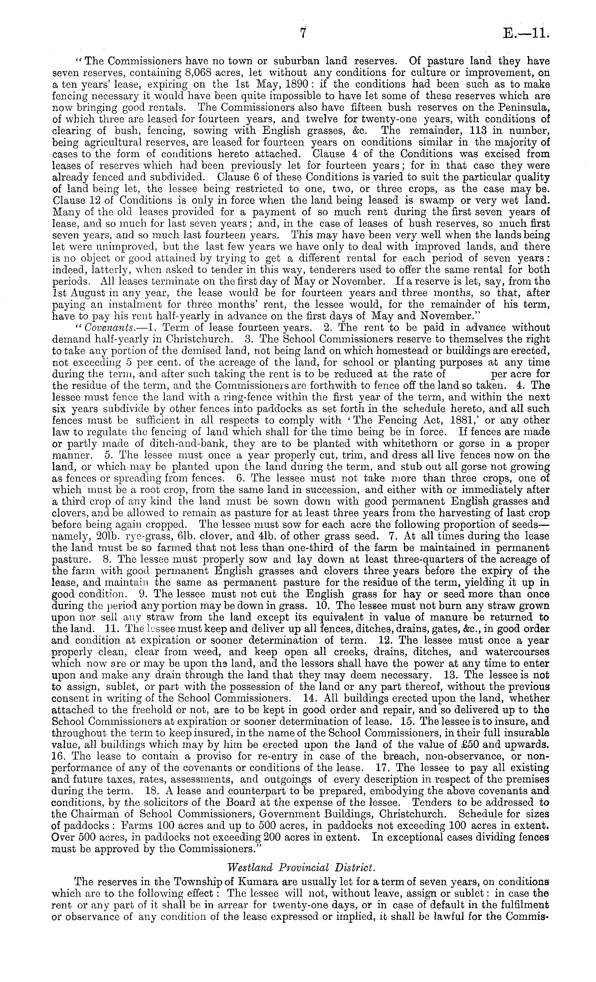 " The Commissioners have no town or suburban land reserves. Of pasture land they have seven reserves, containing 8,068 acres, let without any conditions for culture or improvement, on a ten years' lease, expiring on the Ist May, 1890 : if the conditions had been such as to make fencing necessary it would have been quite impossible to have let some of these reserves which are now bringing good rentals. The Commissioners also have fifteen bush reserves on the Peninsula, of which three are leased for fourteen years, and twelve for twenty-one years, with conditions of clearing of bush, fencing, sowing with English grasses, &c. The remainder, 113 in number, being agricultural reserves, are leased for fourteen years on conditions similar in the majority of cases to the form of conditions hereto attached. Clause 4 of the Conditions was excised from leases of reserves which had been previously let for fourteen years; for in that case they were already fenced and subdivided. Clause 6of these Conditions is varied to suit the particular quality of land being let, the lessee being restricted to one, two, or three crops, as the case may be. Clause 12 of Conditions is only in force when the land being leased is swamp or very wet land. Many of the old leases provided for a payment of so much rent during the first seven years of lease, and so much for last seven years; and, in the case of leases of bush reserves, so much first seven years, and so much last fourteen years. This may have been very well when the lands being let were unimproved, but the last few years we have only to deal with improved lands, and there is no object or good attained by trying to get a different rental for each period of seven years : indeed, latterly, when asked to tender in this way, tenderers used to offer the same rental for both periods. All leases terminate on the first day of May or November. If a reserve is let, say, from the Ist August in any year, the lease would be for fourteen years and three months, so that, after paying an instalment for three months' rent, the lessee would, for the remainder of his term, have to pay his rent half-yearly in advance on the first days of May and November." " Covenants. —1. Term of lease fourteen years. 2. The rent to be paid in advance without demand half-yearly in Christchurch. 3. The School Commissioners reserve to themselves the right to take any portion of the demised land, not being land on which homestead or buildings are erected, not exceeding 5 per cent, of the acreage of the land, for school or planting purposes at any time during the term, and after such taking the rent is to be reduced at the rate of per acre for the residue of the term, and the Commissioners are forthwith to fence off the land so taken. 4. The lessee must fence the land with a ring-fence within the first year of the term, and within the next six years subdivide by other fences into paddocks as set forth in the schedule hereto, and all such fences must be sufficient in all respects to comply with ' The Fencing Act, 1881,' or any other law to regulate the fencing of land which shall for the time being be in force. If fences are made or partly made of ditch-and-bank, they are to be planted with whitethorn or gorse in a proper manner. 5. The lessee must once a year properly cut, trim, and dress all live fences now on the land, or which may be planted upon the land during the term, and stub out all gorse not growing as fences or spreading from fences. 6. The lessee must not take more than three crops, one of which must be a root crop, from the same land in succession, and either with or immediately after a third crop of any kind the land must be sown down with good permanent English grasses and clovers, and be allowed to remain as pasture for at least three years from the harvesting of last crop before being again cropped. The lessee must sow for each acre the following proportion of seeds— namely, 201b. rye-grass, 61b. clover, and 41b. of other grass seed. 7. At all times during the lease the land must be so farmed that not less than one-third of the farm be maintained in permanent pasture. 8. The lessee must properly sow and lay down at least three-quarters of the acreage of the farm with good permanent English grasses and clovers three years before the expiry of the lease, and maintain the same as permanent pasture for the residue of the term, yielding it up in good condition. 9. The lessee must not cut the English grass for hay or seed more than once during the period any portion may be down in grass. 10. The lessee must not burn any straw grown upon nor sell any straw from the land except its equivalent in value of manure be returned to the land. 11. The lessee must keep and deliver up all fences, ditches, drains, gates, &c, in good order and condition at expiration or sooner determination of term. 12. The lessee must once a year properly clean, clear from weed, and keep open all creeks, drains, ditches, and watercourses which now are or may be upon the land, and the lessors shall have the power at any time to enter upon and make any drain through the land that they may deem necessary. 13. The lessee is not to assign, sublet, or part with the possession of the land or any part thereof, without the previous consent in writing of the School Commissioners. 14. All buildings erected upon the land, whether attached to the freehold or not, are to be kept in good order and repair, and so delivered up to the School Commissioners at expiration or sooner determination of lease. 15. The lessee is to insure, and throughout the term to keep insured, in the name of the School Commissioners, in their full insurable value, all buildings which may by him be erected upon the land of the value of £50 and upwards. 16. The lease to contain a proviso for re-entry in case of the breach, non-observance, or nonperformance of any of the covenants or conditions of the lease. 17. The lessee to pay all existing and future tax