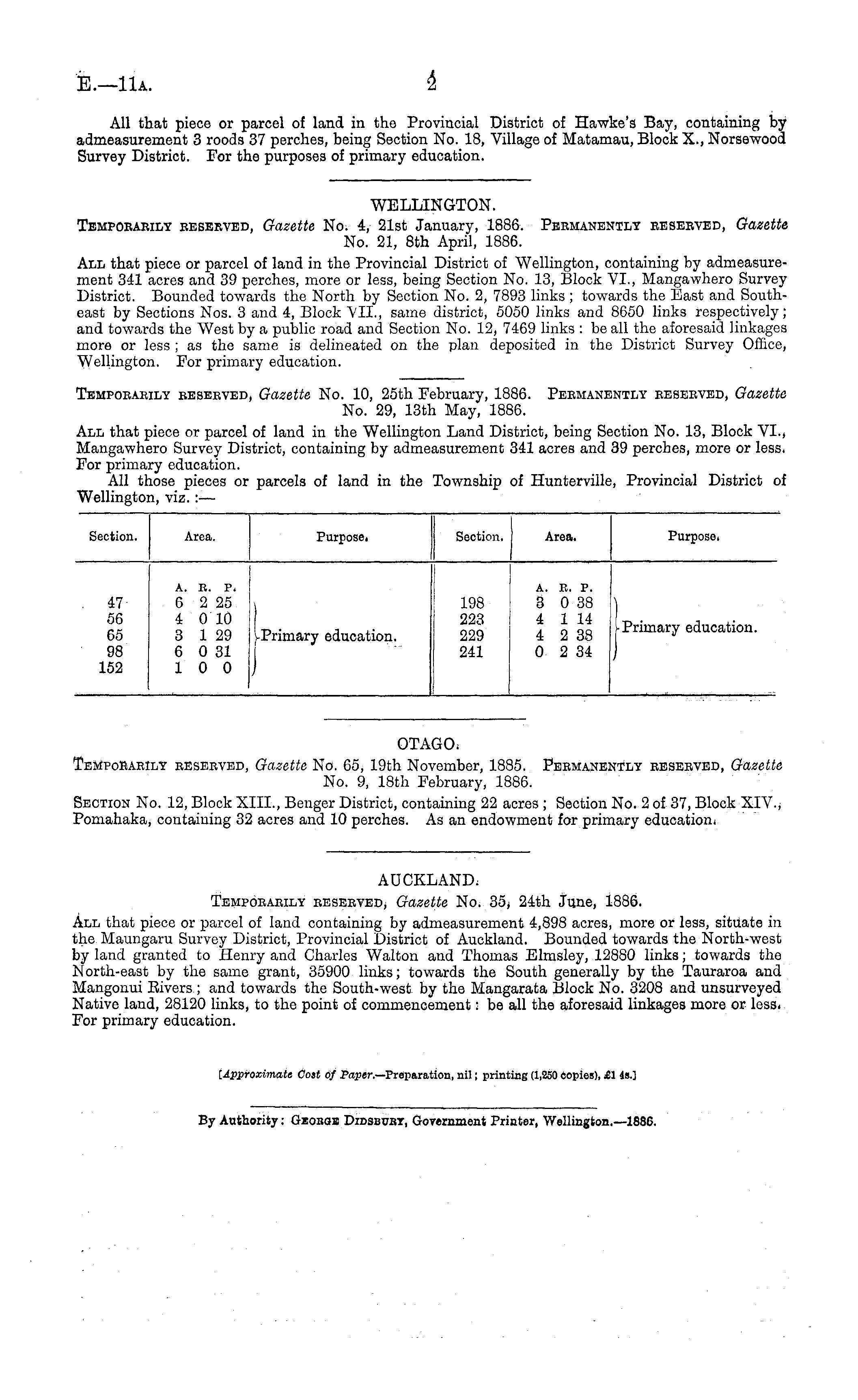 OTAGO. Tempoeaeily eeseeved, Gazette No. 65, 19th November, 1885. Peemanently eeseeved, Gazette No. 9, 18th February, 1886. Section No. 12, Block XIII., Benger District, containing 22 acres ; Section No. 2of 37, Block XIV., Pomahaka, containing 32 acres and 10 perches. As an endowment for primary education*