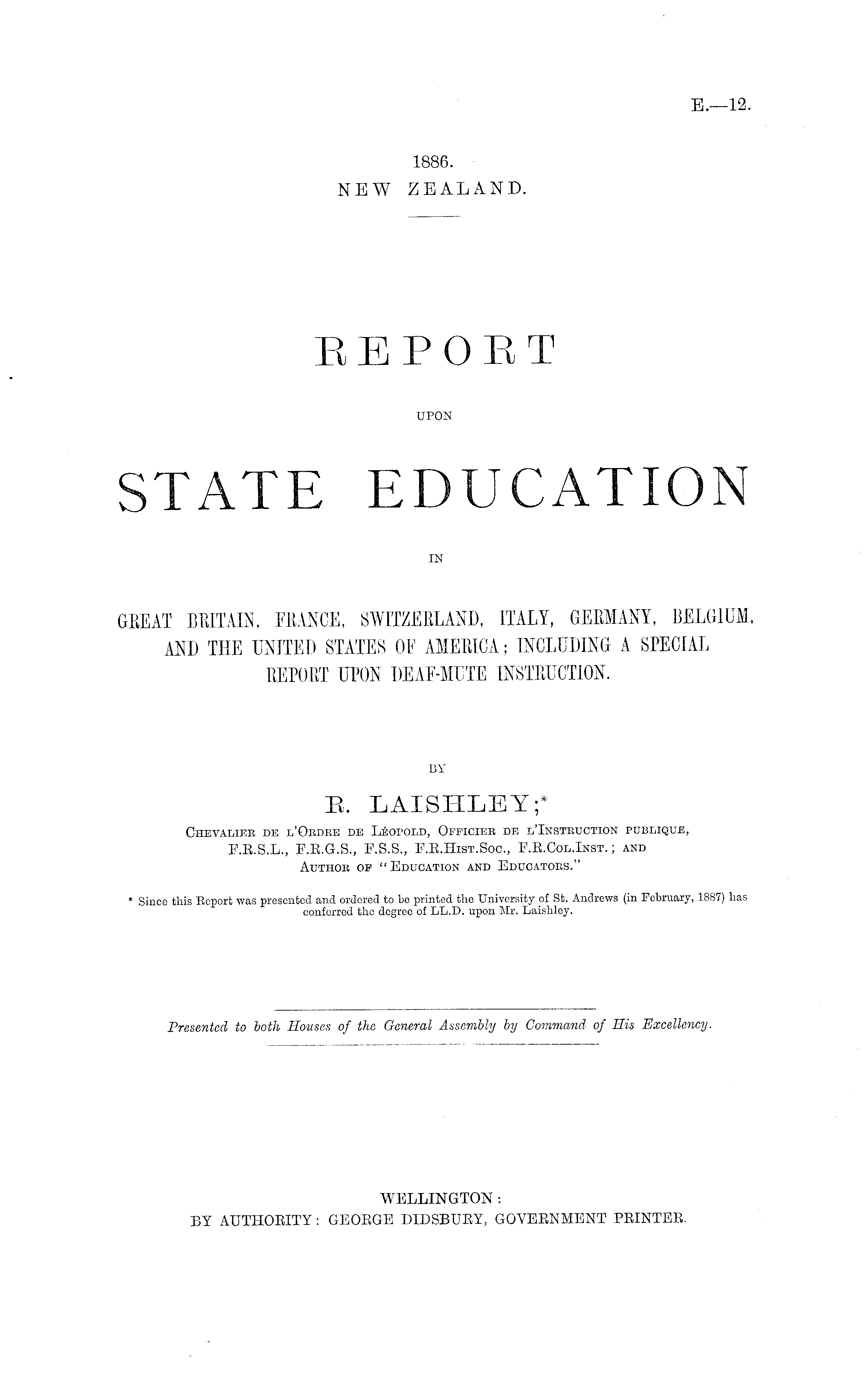 BY E. LAISHLEY;* Chevaliee de l'Oedee de Leopold, Officieb de l'Insteuction pubeique, E.B.S.L., F.B.G.S., F.B.S., F.E.Hist.Soc., F.E.Col.Inst. ; and Authob of "Education and Educatoes." * Since this Eeport was presented and ordered to bo printed the University of St. Andrews (in February, 1887) has conferred the degree of LL.D. upon Mr. Laishley. Presented to both Houses of the General Assembly by Command of His Excellency. WELLINGTON : BY AUTHOEITY: GEOBGE DIDSBUEY, GOVEENMENT EEINTEE.