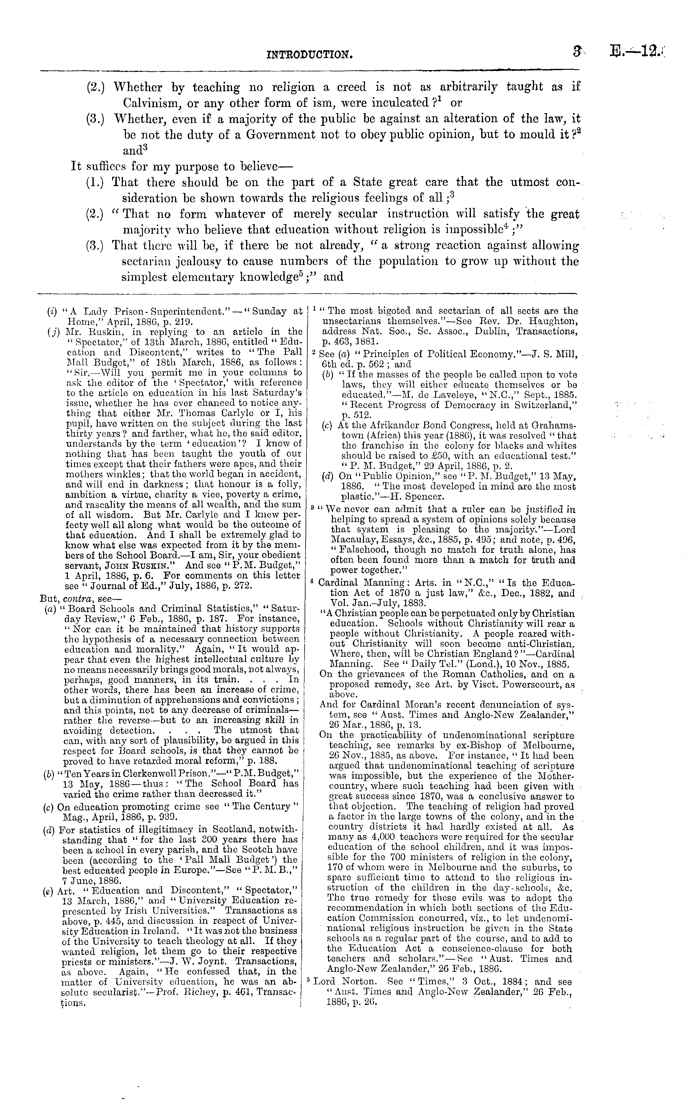 1 " The most bigoted and sectarian of all sects are the unseetarians themselves."—See Rev. Dr. Haughton, address Nat. Soc, So. Assoc., Dublin, Transactions, p. 463, 1881. 2 See (a) "Principles of Political Economy."—J. S. Mill, 6th ed. p. 562 ; and (6) " If the masses of the people bo called upon to vote laws, they will either educate themselves or bo educated."—M. de Laveleye, "N.0.," Sept., 1885. " Recent Progress of Democracy in Switzerland," p. 512. (c) At the Afrikander Bond Congress, held at Grahamstown (Africa) this year (1886), it was resolved " that the franchise in the colony for blacks and whites should be raised to £50, with an educational test." " P. M. Budget," 29 April, 1886, p. 2. (d) On "Public Opinion," see "P. M. Budget," 13 May, 1886. " The most developed in mind are the most plastic."—H. Spencer. s " We never can admit that a ruler can be justified in helping to spread a system of opinions solely because that system is pleasing to the majority."—Lord Macaulay, Essays, &c, 1885, p. 495; and note, p. 496, " Falsehood, though no match for truth alone, has often been found more than a match for truth and power together." 4 Cardinal Manning: Arts, in " N.C.," "Is the Education Act of 1870 a just law," &c, Dec, 1882, and Vol. Jan.-July, 1883. "A Christian people can be perpetuated only by Christian education. Schools without Christianity will rear a people without Christianity. A people reared without Christianity will soon become anti-Christian. Where, then, will bo Christian England?"—Cardinal Manning. See " Daily Tel." (Lond.), 10 Nov., 1885. On the grievances of the Roman Catholics, and on a proposed remedy, see Art. by Visct. Powerscourt, as above. And for Cardinal Moran's recent denunciation of system, see " Aust. Times and Anglo-New Zealander," 26 Mar., 1886, p. 13. On the practicability of undenominational scripture teaching, see remarks by ex-Bishop of Melbourne, 26 Nov., 18S5, as above. For instance, "It had been argued that undenominational teaching of scricturc was impossible, but the experience of the Mothercountry, where such teaching had been given with great success since 1870, was a conclusive answer to that objection. The teaching of religion had proved a factor in the large towns of the colony, and in the country districts it had hardly existed at all. As many as 4,000 teachers were required for the secular education of the school children, and it was impossible for the 700 ministers of religion in the colony, 170 of whom were in Melbourne and the suburbs, to spare sufficient time to attend to the religious instruction of the children in the day-schools, &c. The true remedy for these evils was to adopt the recommendation in which both sections of the Education Commission concurred, viz., to let undenominational religious instruction bo given in the State schools as a regular part of the course, and to add to the Education Act a conscience-clause for both teachers and scholars." — See "Aust. Times and Anglo-Now Zealander," 26 Feb., 1886. Lord Norton. See "Times," 3 Oct., 1884; and see "Aust. Times and. Anglo-New Zealander," 20 Feb., 188G, p. 2G.