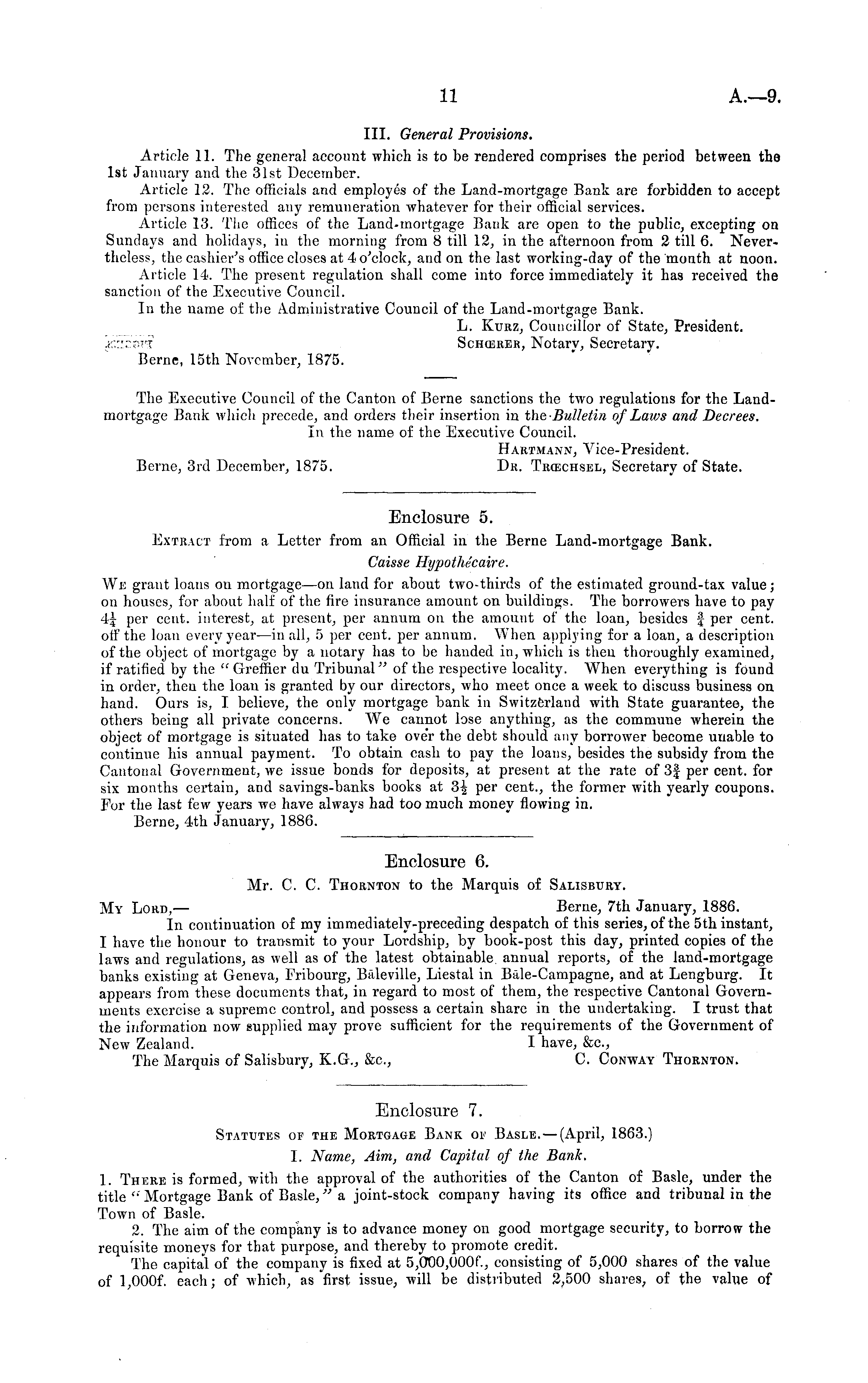 Enclosure 6. Mr. C. C. Thornton to the Marquis of Salisbury. Mv Lord, — Berne, 7th January, 1886. In continuation of my immediately-preceding despatch of this series, of the sth instant, I have the honour to transmit to your Lordship, by book-post this day, printed copies of the laws and regulations, as well as of the latest obtainable annual reports, of the land-mortgage banks existing at Geneva, Fribourg, Baleville, Liestal in Bale-Campagne, and at Lengburg. It appears from these documents that, in regard to most of them, the respective Cantonal Governments exercise a supreme control, and possess a certain share in the undertaking. I trust that the information now supplied may prove sufficient for the requirements of the Government of New Zealand. I have, &c, The Marquis of Salisbury, K.G., &c, C. Conway Thornton.
