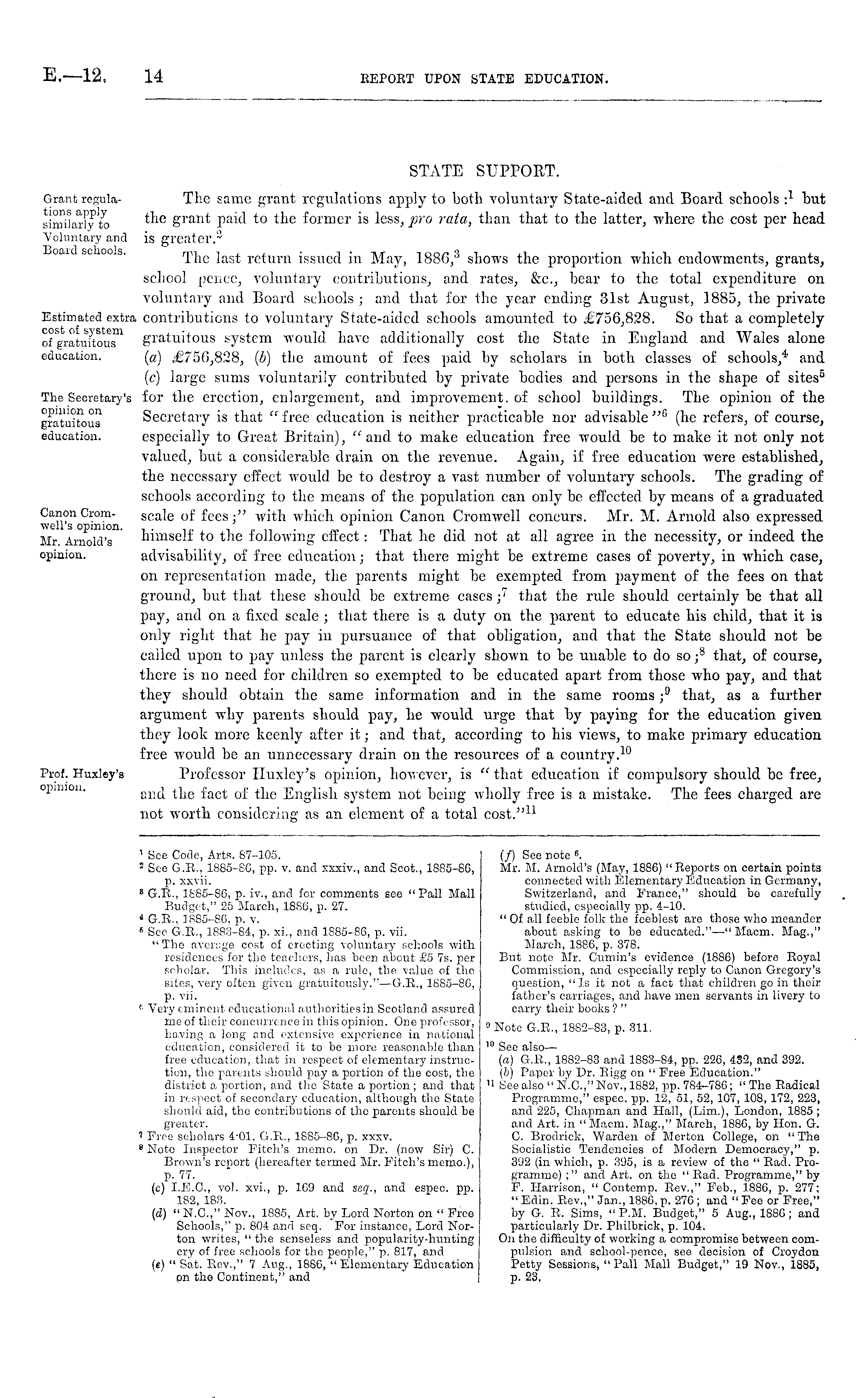 STATE SUPPORT. The same grant regulations apply to both voluntary State-aided and Board schools ■} but the grant paid to the former is less, pro rata, than that to the latter, where the cost per head is greater. 2 The last return issued in May, 188G, 3 shows the proportion which endowments, grants, school pence, voluntary contributions, and rates, &c, bear to the total expenditure on voluntary and Board schools ; and that for the year ending 31st August, 1885, the private contributions to voluntary State-aided schools amounted to £756,828. So that a completely gratuitous system would have additionally cost the State in England and Wales alone («) £756,828, (b) the amount of fees paid by scholars in both classes of schools, 4 and (c) large sums voluntarily contributed by private bodies and persons in the shape of sites 5 for the erection, enlargement, and improvement, of school buildings. The opinion of the Secretary is that " free education is neither practicable nor advisable "G (he refers, of course, especially to Great Britain), "and to make education free would be to make it not only not valued, but a considerable drain on the revenue. Again, if free education were established, the necessary effect would be to destroy a vast number of voluntary schools. The grading of schools according to the means of the population can only be effected by means of a graduated scale of fees;" with which opinion Canon Cromwell concurs. Mr. M. Arnold also expressed himself to the following effect: That he did not at all agree in the necessity, or indeed the advisability, of free education; that there might be extreme cases of poverty, in which case, on representation made, the parents might be exempted from payment of the fees on that ground, but that these should be extreme cases ; 7 that the rule should certainly be that all pay, and on a fixed scale ; that there is a duty on the parent to educate his child, that it is only right that he pay in pursuance of that obligation, and that the State should not be called upon to pay unless the parent is clearly shown to be unable to do so ; 8 that, of course, there is no need for children so exempted to be educated apart from those who pay, and that they should obtain the same information and in the same rooms ; 9 that, as a further argument why parents should pay, he would urge that by paying for the education given they look more keenly after it; and that, according to his views, to make primary education free would be an unnecessary drain on the resources of a country. 10 Professor Huxley's opinion, however, is " that education if compulsory should be free, and the fact of the English system not being wholly free is a mistake. The fees charged are not worth considering as an element of a total cost." 11