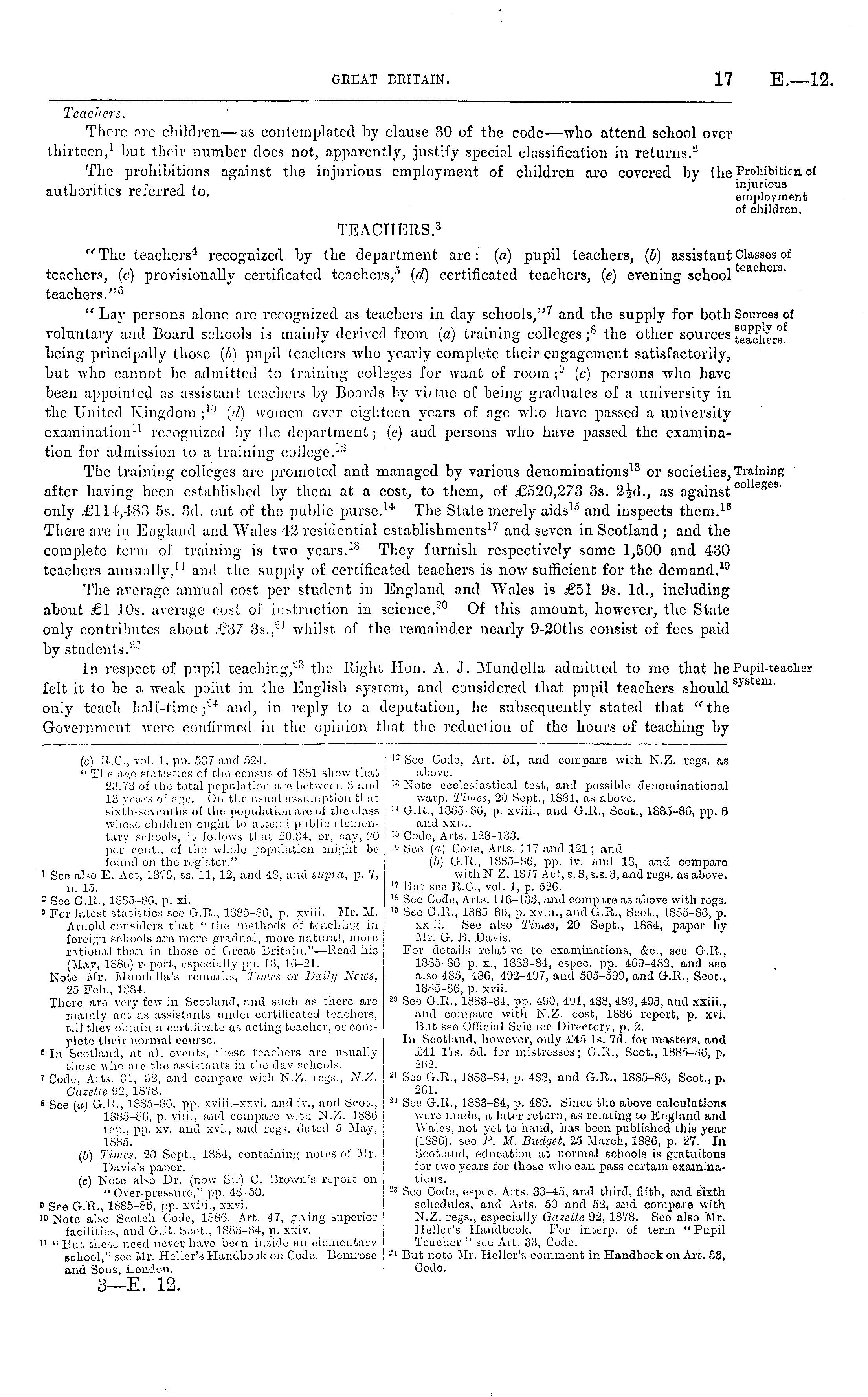 12 See Code, Art. fll, and compare with N.Z. regs. as above. 18 Note ecclesiastical test, and possible denominational warp, Times, 20 Sept., 1881, as above. 14 G.R., 1885-80, p. xviii., and G.E., Scot., 188j-BG, pp. 8 and xxiii. is Code, Arts. 128-133. 10 Seo (a) Code, Arts. 117 and 121; and (b) G.H., 1885-86, pp. iv. ami 18, and compare with N.Z. 1577 Act,s.B,s.s. 3,androgs. as above. •> But see 8.C., vol. 1, p. 526. 18 See Code, Arts. 116-133, and compare as above with regs. 13 Seo G.R., 1885-86, p. xviii., and U.R., Scot., 1885-BG, p. xxiii. See also Times, 20 Sept., 1884, papor by Mr. G. B. Davis. For details relative to examinations, &c, seo G.R., 1885-86, p. x., 1833-84, cspec. pp. 469-482, and seo also 485, 456, 4'J2-4<J7, and 505-599, and G-.R., Scot., 1885-86, p. xvii. 20 See G.R., 1883-84, pp. 490, 491, 488, 489, 493, and xxiii., and compare with N.Z. cost, 1886 report, p. xvi. But see Official Science Directory, p. 2. In Scotland, however, only £45 Is. 7d. for masters, and £41 17s. sd. for mistresses; G.U., Scot., 1885-86, p. 262. 21 See G.R., 1883-84, p. 483, and G.R., 1885-86, Scot., p. 261. 23 See G.R., 1883-84, p. 489. Since the above calculations were made, a later return, as relating to England and Wales, not yet to hand, has been published this year (1886). see P. M. Budget, 25 March, 1886, p. 27. In Scotland, education at normal schools is gratuitous for two years for those who can pass certain examinations. ! :3 See Code, espec. Arts. 33-45, and third, fifth, and sixth schedules, and Arts. 50 and 52, and oompaia with N.Z. regs., especially Gazette 92, 1878. See also Mr. Heller's Handbook. For interp. of term "Pupil Teacher " see Ait. 33, Code. 24 But note Mr. Holler's comment in Handbook on Art. S3, Code