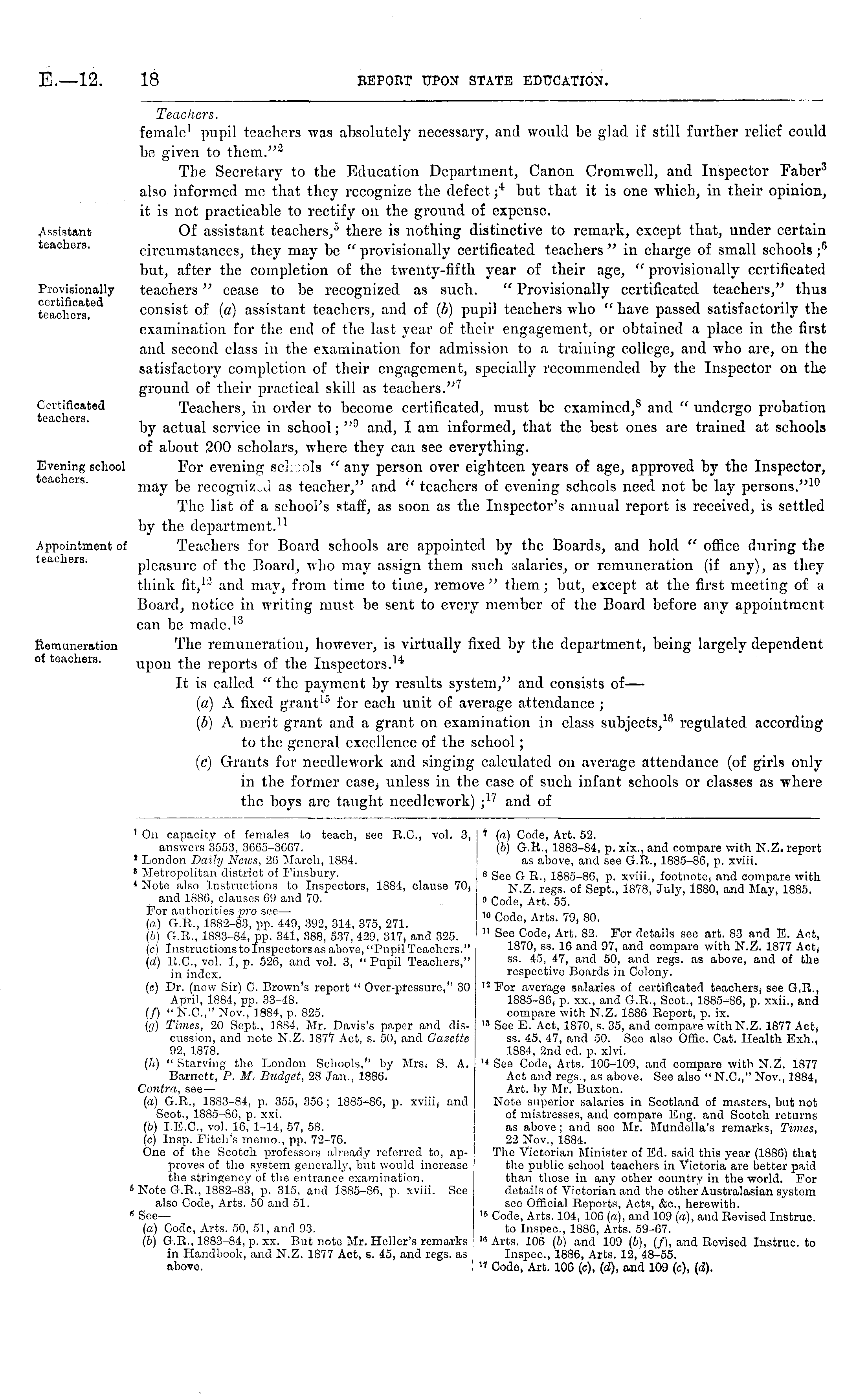 ' On capacity of females to teach, see R.C., vol. 3, answers 3553, 3605-3CG7. 1 London Daily News, 20 March, 1884. 8 Metropolitan district of Finsbury. i Note also Instructions to Inspectors, 1884, clause 70, and 1886, clauses 69 and 70. For authorities pro see— (a) G.R., 1882-83, pp. 449, 392, 314, 375, 271. (b) G.R., 1883-84, pp. 341, 388, 537,429, 317, and 325. (c) Instructions to Inspectors as above, "Pupil Teachers." (d) R.C., vol. 1, p. 520, and vol. 3, " Pupil Teachers," in index. («) Dr. (now Sir) C. Brown's report " Over-pressure,*' 30 April, 1884, pp. 33-48. (/) "N.C.," Nov., 1884, p. 825. (g) Times, 20 Sept., 1884, Mr. Davis's paper and discussion, and note N.Z. 1877 Act, s. 50, and Gazette 92, 1878. (h) " Starving the London Schools," by Mrs, S. A. Barnett, P. M. Budget, 28 Jan., 1886. Contra, see— (a) G.R., 1883-84, p. 355, 336 ; 1885-86, p. xviii, and Scot., 1885-86, p. xxi. (6) 1.E.C., vol. 16, 1-14, 57, 58. (c) Insp. Fitch's memo., pp. 72-76. One of the Scotch professors already referred to, approves of the system generally, but would increase the stringency of the entrance examination. 6 Note G.R., 1882-83, p. 315, and 1885-86, p. xviii. Seo also Code, Arts. 50 and 51. 'Seefa) Code, Arts. 50, 51, and 93. (b) G.R., 1883-84, p. xx. But noto Mr. Heller's remarks in Handbook, and N.Z. 1877 Act, s. 45, and regs. as above