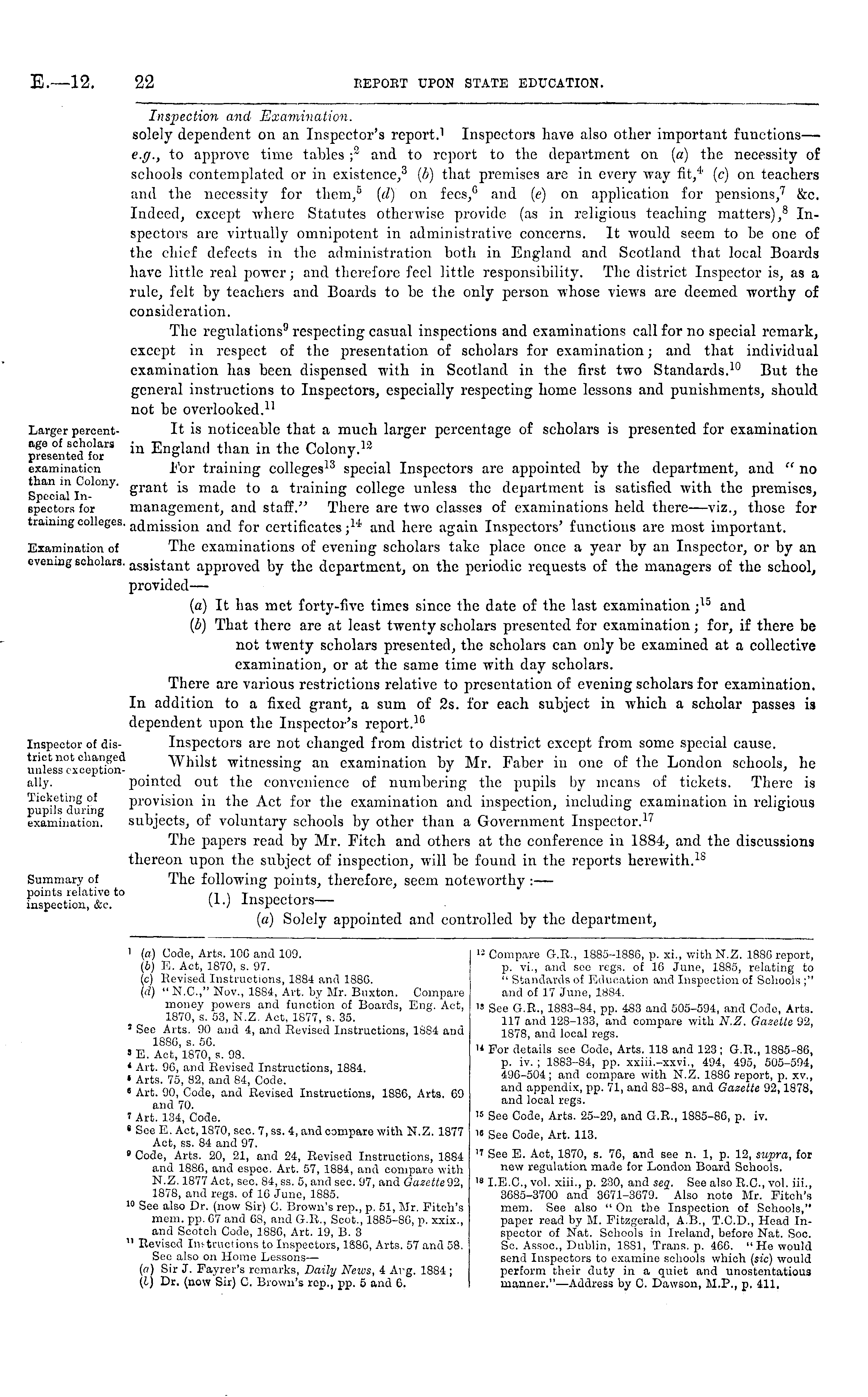 l (a) Code, Arts. 106 and 109. (b) E. Act, 1870, s. 97. (c) Revised Instructions, 1884 and 1886. (d) " N.C.," Nov., 1884, Art. by Mr. Buxton. Compare money powers and function of Boards, Eng. Act, 1870, s. 53, N.Z. Act, 1877, s. 35. ' See Arts. 90 and 4, and Revised Instructions, 18S4 and 1886, s. 56. ' E. Act, 1870, s. 98. * Art. 96, and Revised Instructions, 1884. « Arts. 75, 82, and 84, Code. 6 Art. 90, Code, and Revised Instructions, 1886, Arts. 69 and 70. 1 Art. 134, Code. 8 See E. Act, 1870, sec. 7, ss. 4, and compare with N.Z. 1877 Act, ss. 84 and 97. 8 Code, Arts. 20, 21, and 24, Revised Instructions, 1884 and 1886, and espec. Art. 07, 1884, and compare with N.Z. 1877 Act, sec. 84, ss. 5, and sec. 97, and Gazetted, 1878, and regs. of 16 June, 1885. 10 See also Dr. (now Sir) C. Brown's rep., p. 51, Mr. Fitch's mem. pp. 67 and 68, and G.R., Scot., 1885-86, p. xxix., and Scotch Code, 1886, Art. 19, B. 3 " Revised Instructions to Inspectors, 1886, Arts. 57 and 58. See also on Home Lessons— (a) Sir J. Fayrer's remarks, Daily Neivs, 4 Arg. 1884 ; (1) Dr. (now Sir) C. Brown's rep., pp. 5 and 6.