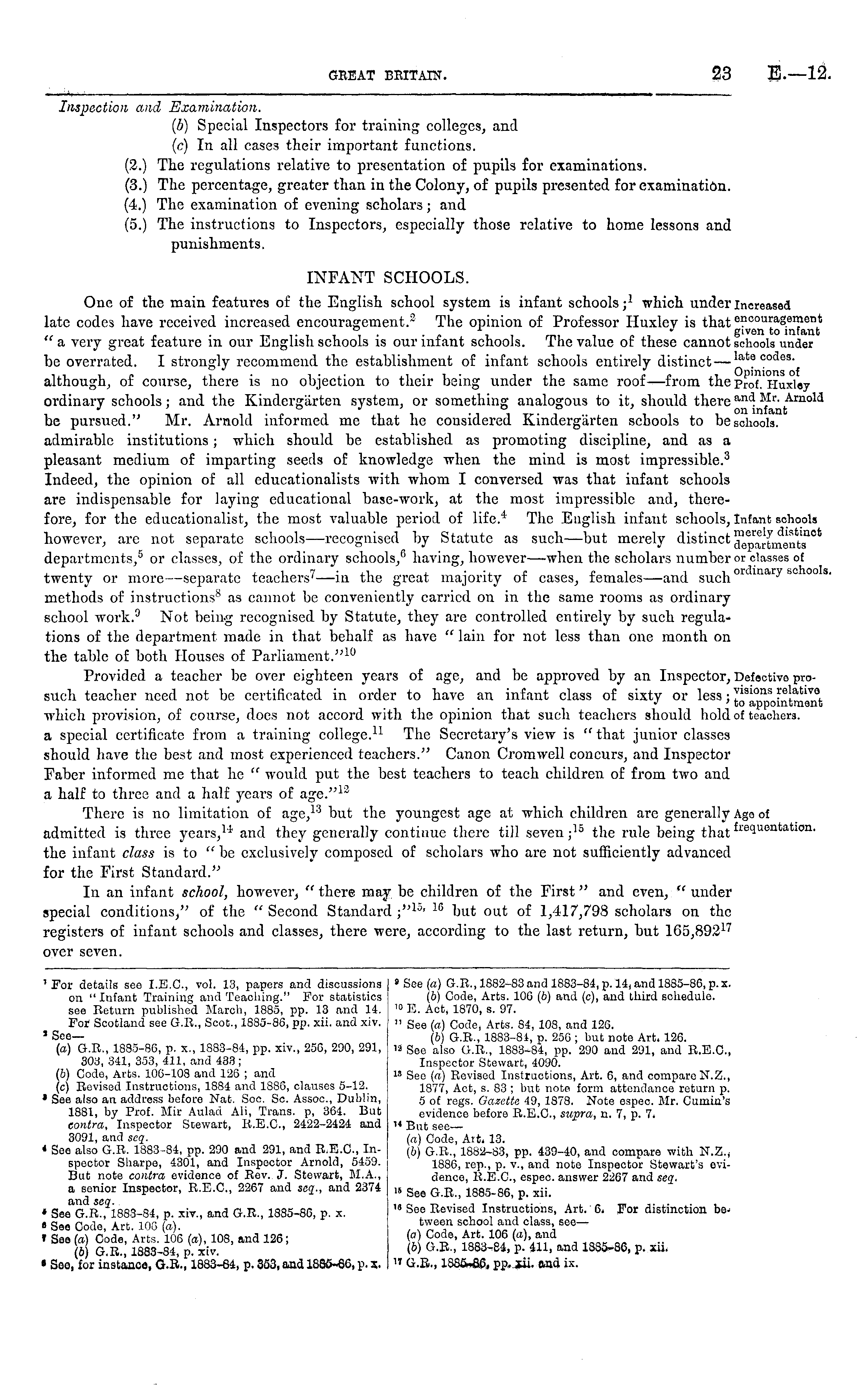 1 For details see 1.E.C., vol. 13, papers and discussions on " Infant Training and Teaching." For statistics see Return published March, 1885, pp. 13 and 14. For Scotland see G.R., Scot., 1885-86, pp. xii. and xiv. 'See— (a) G.R., 1885-86, p. x., 1883-84, pp. xiv., 256, 200, 291, 303, 341, 353, 411, and 433; (6) Code, Arts. 106-108 and 126 ; and (c) Revised Instructions, 1884 and 1886, clauses 5-12. • See also an address before Nat. Soc. Sc. Assoc, Dublin, 1881, by Prof. Mir Aulad AH, Trans, p, 364. But contra, Inspector Stewart, R.E.C., 2422-2424 and 3091, and seq. * See also G.R. 1883-84, pp. 290 and 291, and R.E.C., Inspector Sharpe, 4301, and Inspector Arnold, 5459. But note contra evidence of Rev. J. Stewart, M.A., a senior Inspector, R.E.C., 2267 and seq., and 2374 and seq. * See G.R., 1883-84, p. xiv., and G.R., 1885-86, p. x. « See Code, Art. 10G (a). » See (a) Code, Arts. 106 (a), 108, and 126; (6) G.R., 1883-84, p. xiv. • See, for instance, G.8., 1883-64, p. 353, and 1886-66, p. x.