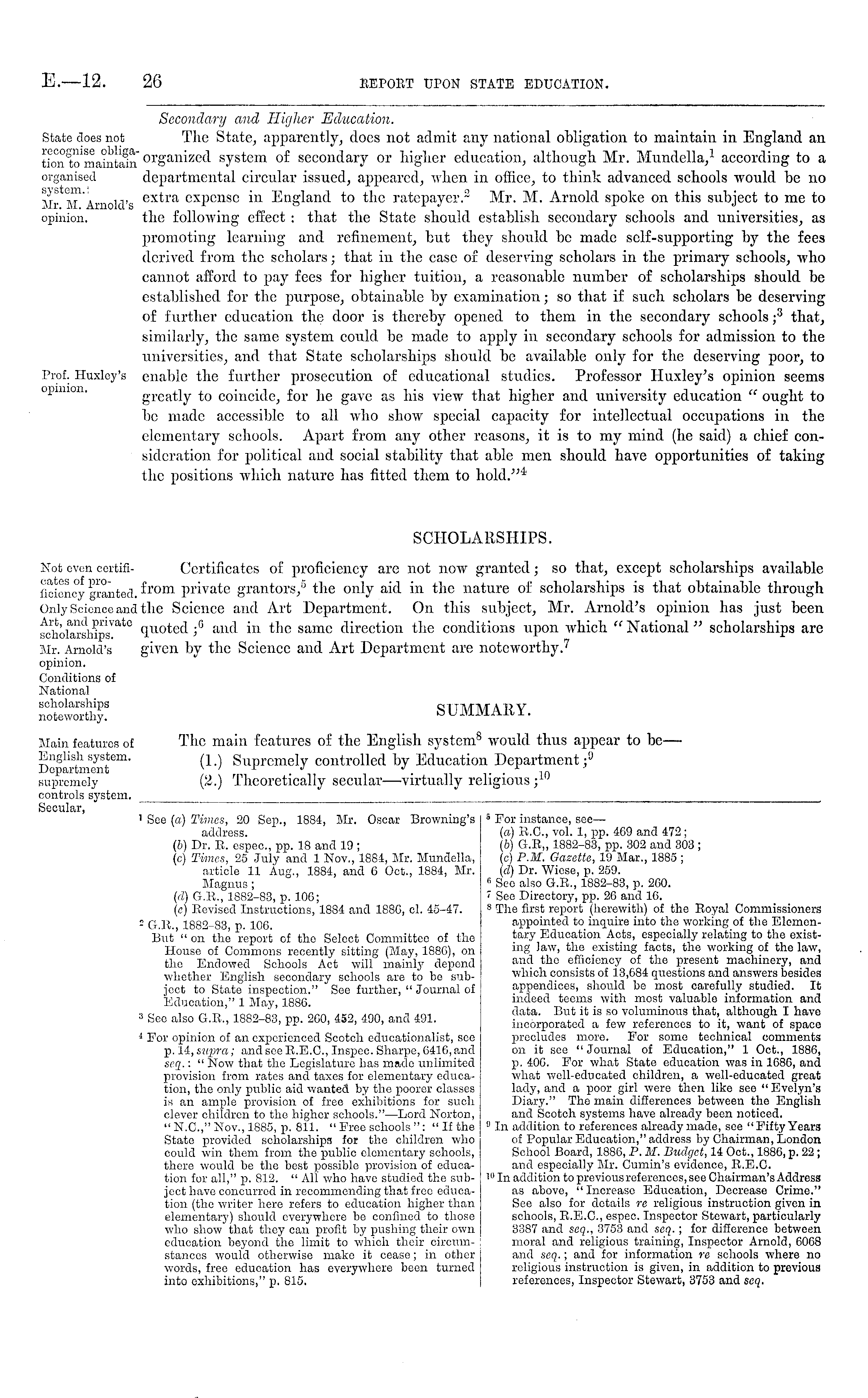 1 See (a) Times, 20 Sep., 1884, Mr. Oscar Browning's address. (b) Dr. E. espee., pp. 18 and 19 ; (c) Times, 25 July and 1 Nov., 1884, Mr. Mundella, article 11 Aug., 1884, and 6 Oct., 1884, Mr. Magnus ; (d) G.8., 1882-83, p. 106; (c) Revised Instructions, 1884 and 1880, cl. 45-47. - G.R., 1882-83, p. 106. But " on the report of the Select Committee of the House of Commons recently sitting (May, 1886), on the Endowed Schools Act will mainly depend whether English secondary schools are to bo subject to State inspection." See further, " Journal of Education," 1 May, 1886. 3 See also G.R., 1882-83, pp. 200, 452, 490, and 491. 4 For opinion of an experienced Scotch educationalist, see p. 14, supra; andseeß.E.C,lnspec. Sharpe,64l6,and seq.: " Now that the Legislature has made unlimited provision from rates and taxes for elementary education, the only public aid wanted by the poorer classes is an ample provision of free exhibitions for such clever children to the higher schools." —Lord Norton, " N.C.," Nov., 1885, p. 811. " Free schools ": "If the State provided scholarships for the children who could win them from the public elementary schools, there would be the best possible provision of education for all," p. 812. " All who have studied the subject have concurred in recommending that free education (the writer here refers to education higher than elementary) should everywhere be confined to those who show that they can profit by pushing their own education beyond the limit to which their circumstances would otherwise make it cease; in other words, free education has everywhere been turned into exhibitions," p. 815.