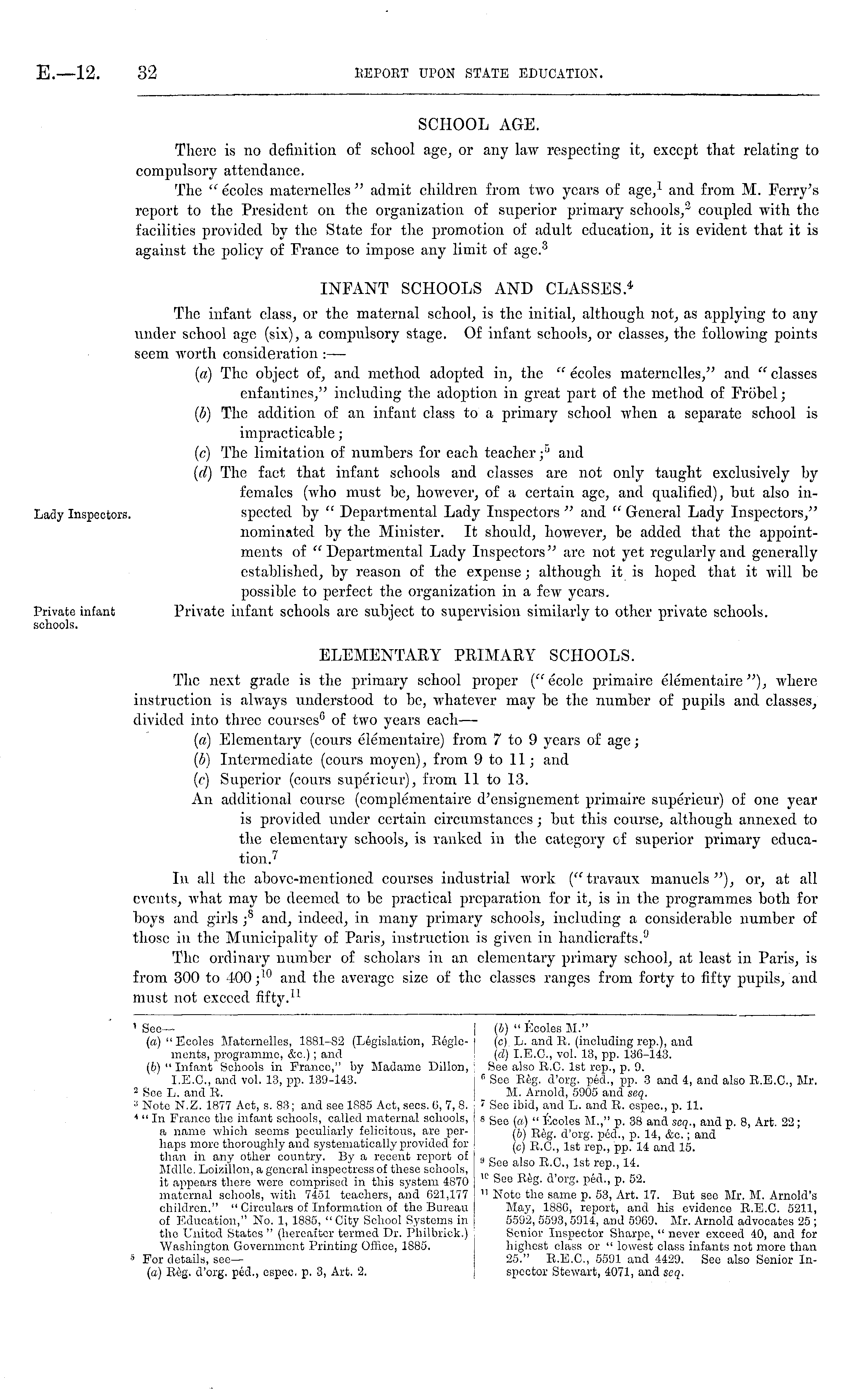1 See— (a) "Ecoles Maternelles, 1881-82 (Legislation, Beglements, programme, &o.); and (b) "Infant Schools in Prance," by Madame Dillon, 1.E.0., and vol. 13, pp. 139-143. 2 See L. and B. 3 Note N.Z. 1877 Act, s. 83; and see 1885 Act, sees. 6, 7, 8. 4 " In France the infant schools, called maternal schools, a name which seems peculiarly felicitous, are perhaps more thoroughly and systematically provided for than in any other country. By a recent report of Mdllc. Loizillon, a general inspectress of these schools, it appears there were comprised in this system 4870 maternal schools, with 7451 teachers, and 621,177 children." " Circulars of Information of the Bureau of Education," No. 1, 1885, "City School Systems in the United States " (hereafter termed Dr. Philbrick.) Washington Government Printing Office, 1885. 5 For details, see— (a) Beg. d'org. ped., espeo. p. 3, Art. 2.