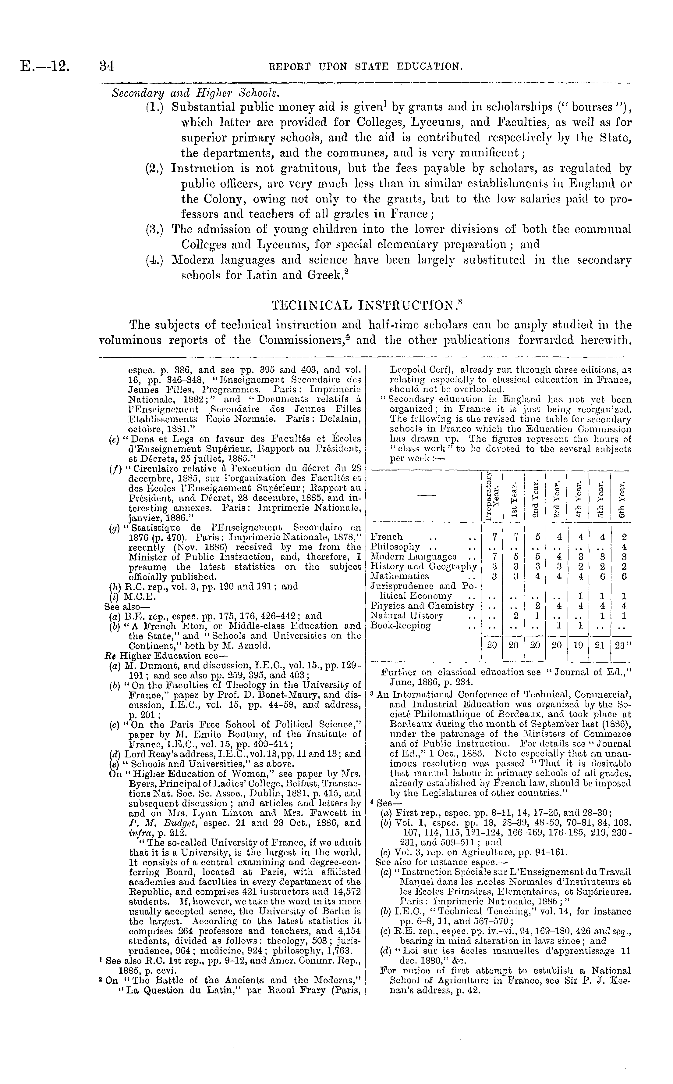 Secondary and Higher Schools. (1.) Substantial public money aid is givenl by grants and in scholarships (" bourses "), which latter are provided for Colleges, Lyceums, and Faculties, as well as for superior primary schools, and the aid is contributed respectively by the State, the departments, and the communes, and is very munificent j (2.) Instruction is not gratuitous, but the fees payable by scholars, as regulated by public officers, are very much less than in similar establishments in England or the Colony, owing not only to the grants, but to the low salaries paid to professors and teachers of all grades in France; (3.) The admission of young children into the lower divisions of both the communal Colleges and Lyceums, for special elementary preparation; and (4.) Modern languages and science have been largely substituted in the secondary schools for Latin and Greek. 2 TECHNICAL INSTRUCTION. 3 The subjects of technical instruction and half-time scholars can be amply studied in the voluminous reports of the Commissioners, 4 and the other publications forwarded herewith.