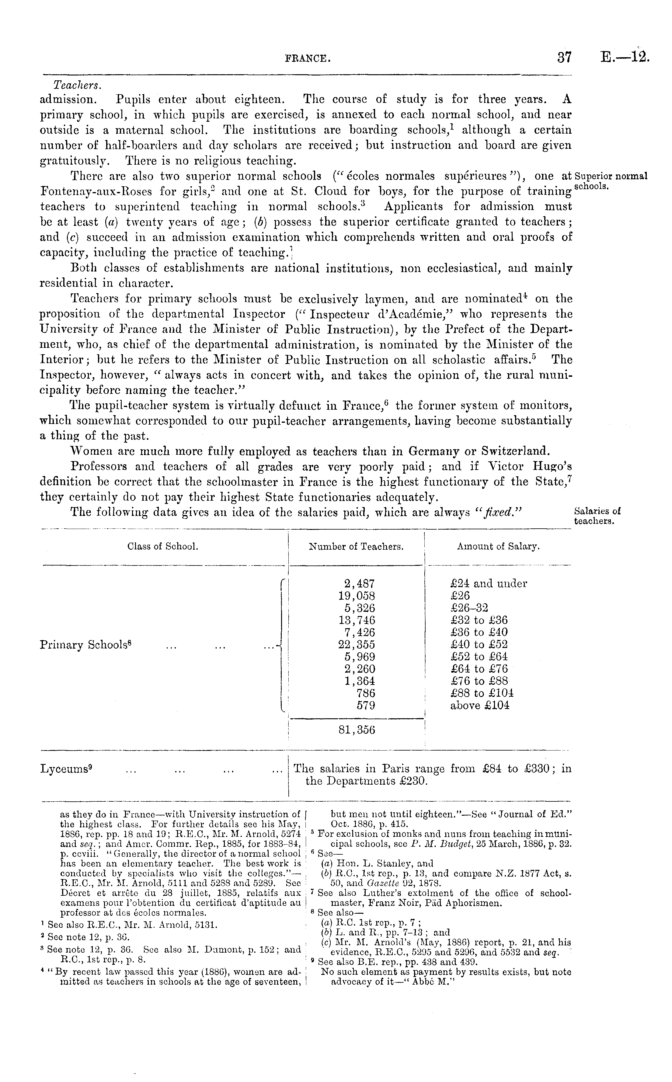 | but men not until eighteen."—See " Journal of Ed." I Oct. 188G, p. 415. 5 For exclusion of monks and nuns from teaching inmunicipal schools, see P. M. Budget, 25 March, 188G, p. 32. 6 See — ; (a) Hon. L. Stanley, and , (b) 8.C., Ist rep., p. 13, and compare N.Z. 1877 Act, s. 50, and Gazette 92, 1878. 7 See also Luther's extolment of the office of schoolmaster, Franz Noir, Pad Aphorismen. 8 See also— (a) R-C Ist rep., p. 7 ; {") *J- an<l "■< PP' 7-13 ; and Mr M _ ArnoUVs ( MaV) 1886 ) roport> p . 2 1, and his ' evidence, R.E.C., 5295 and 5296, and 5532 and seq. t S ee also B.E. rep., pp. 438 and 439. | No such element as payment by results exists, but note ; advocacy of it—" Abbe M."