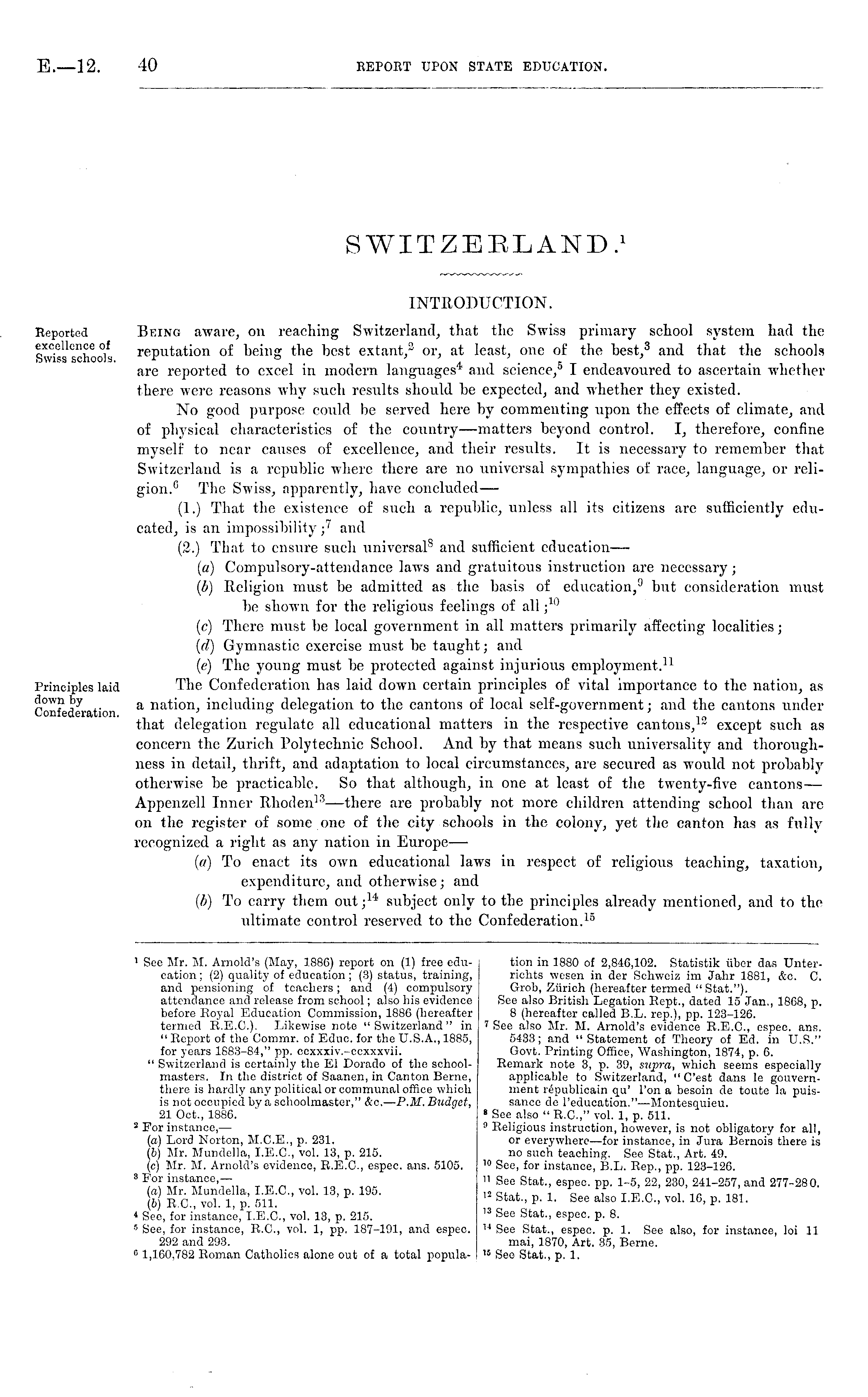 tion in 1880 of 2,846,102. Statistik iiber das Unterrichts wesen in der Sehweiz im Jahr 1881, &c. C. Grob, Zurich (hereafter termed "Stat."). See also British Legation Rept, dated 15 Jan., 1868, p. 8 (hereafter called B.L. rep.), pp. 123-126. i See also Mr. M. Arnold's evidence R.E.C., espee. ans. 5433; and "Statement of Theory of Ed. in U.S." Govt. Printing Office, Washington, 1874, p. 6. Remark note 3, p. 39, supra, which seems especially applicable to Switzerland, " C'est dans le gouvernment republicain qu' Ton a besoin de toute la puissance de l'education."—Montesquieu. 8 See also " R.C.," vol. 1, p. 511. 9 Religious instruction, however, is not obligatory for all, or everywhere—for instance, in Jura Bernois there is no such teaching. See Stat., Art. 49. 10 See, for instance, B.L. Rep., pp. 123-126. " See Stat., espec. pp. 1-5, 22, 230, 241-257, and 277-280. 12 Stat., p. 1. See also 1.E.C., vol. 16, p. 181. 73 See Stat., espec. p. 8. 14 See Stat., espec. p. 1. See also, for instance, loi 11 mai, 1870, Art. 85, Berne. '« See Stat., p. 1.