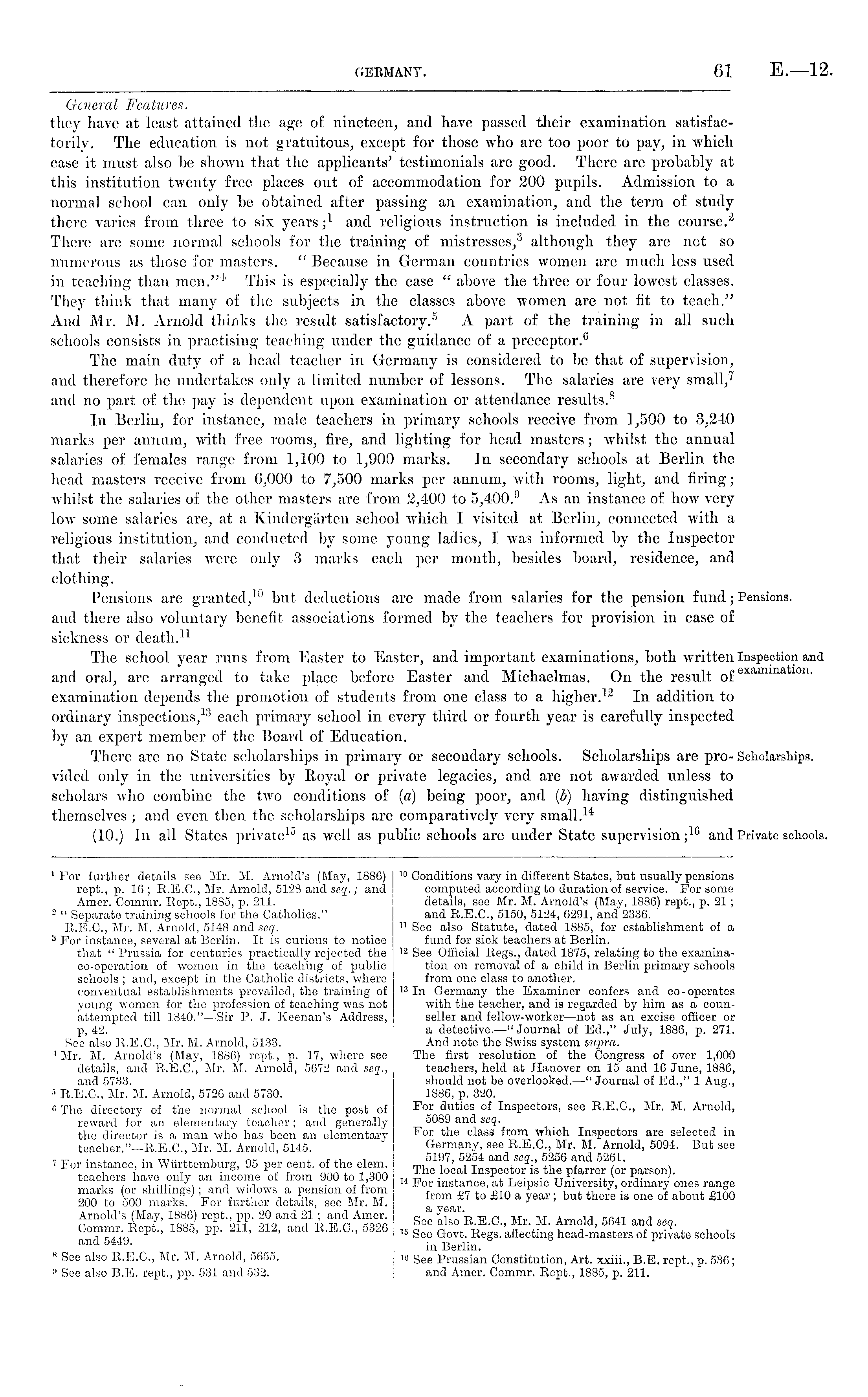10 Conditions vary in different States, but usually pensions computed according to duration of service. For some details, seo Mr. M. Arnold's (May, 1886) rept., p. 21 ; and R.E.C., 5150, 5124, 6291, and 2330. 11 See also Statute, dated 1885, for establishment of a fund for sick teachers at Berlin. 12 See Official Kegs., dated 1875, relating to the examination on removal of a child in Berlin primary schools from one class to another. 13 In Germany the Examiner confers and co-operates with the teacher, and is regarded by him as a counseller and fellow-worker —not as an excise officer or a detective. —"Journal of Ed.," July, 1886, p. 271. And note the Swiss system supra. The first resolution of the Congress of over 1,000 teachers, held at Hanover on 15 and 10 June, 1880, should not be overlooked. —"Journal of Ed.," 1 Aug., 1886, p. 320. For duties of Inspectors, see R.E.C., Mr. M. Arnold, 5089 and scq. For the class from which Inspectors are selected in Germany, see R.E.C., Mr. M. Arnold, 5094. But see 5197, 5254 and scq., 5256 and 5261. The local Inspector is the pfarrer (or parson). 14 p Ol . instance, at Leipsic University, ordinary ones range from £7 to £10 a year; but there is one of about £100 a year. See also R.E.C., Mr. M. Arnold, 5641 and scq. 15 See Govt. Regs, affecting head-masters of private schools in Berlin. 16 See Prussian Constitution, Art. xxiii., B.E. rept., p. 536; and Amer. Commr. Rept., 1885, p. 211.