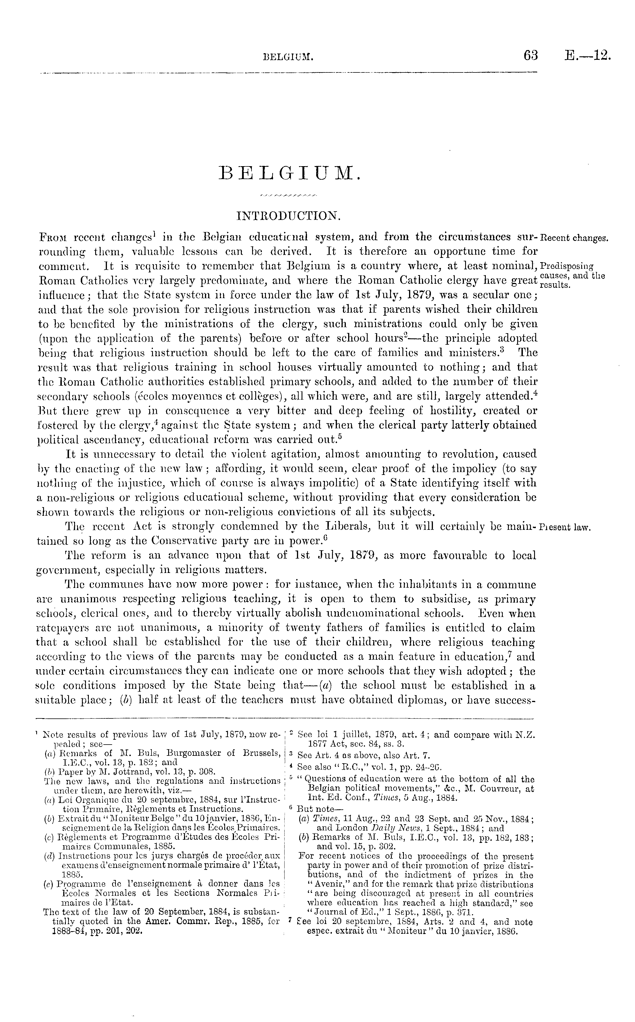 INTRODUCTION. From recent changes 1 in the Belgian educational system, and from the circumstances sur-Re rounding them, valuable lessons can be derived. It is therefore an opportune time for comment. It is requisite to remember that Belgium is a country where, at least nominal, Pr Roman Catholics very largely predominate, and where the Roman Catholic clergy have great influence; that the State system in force under the law of Ist July, 1879, was a secular one; and that the sole provision for religious instruction was that if parents wished their children to be benefited by the ministrations of the clergy, such ministrations could only be given (upon the application of the parents) before or after school hours 2 —the principle adopted being that religious instruction should be left to the care of families and ministers. 3 The result was that religious training in school houses virtually amounted to nothing; and that the Roman Catholic authorities established primary schools, and added to the number of their secondary schools (ecoles moyennes et colleges), all v^hich were, and are still, largely attended. 4 But there grew up in consequence a very bitter and deep feeling of hostility, created or fostered by the clergy, 4 against the State system; and when the clerical party latterly obtained political ascendancy, educational reform was carried out. 5 It is unnecessary to detail the violent agitation, almost amounting to revolution, caused by the enacting of the new law; affording, it would seem, clear proof of the impolicy (to say nothing of the injustice, which of course is always impolitic) of a State identifying itself with a non-religious or religious educational scheme, without providing that every consideration be shown towards the religious or non-religious convictions of all its subjects. The recent Act is strongly condemned by the Liberals, but it will certainly be main- Pi< taincd so long as the Conservative party arc in power. 0 The reform is an advance upon that of Ist July, 1879, as more favourable to local government, especially in religious matters. The communes have now more power: for instance, when the inhabitants in a commune are unanimous respecting religious teaching, it is open to them to subsidise, as primary schools, clerical ones, and to thereby virtually abolish undenominational schools. Even when ratepayers are not unanimous, a minority of twenty fathers of families is entitled to claim that a school shall be established for the use of their children, where religious teachingaccording to the views of the parents may be conducted as a main feature in education, 7 and under certain circumstances they can indicate one or more schools that they wish adopted ; the sole conditions imposed by the State being that— (a) the school must be established in a suitable place; (/;) half at least of the teachers must have obtained diplomas, or have success-