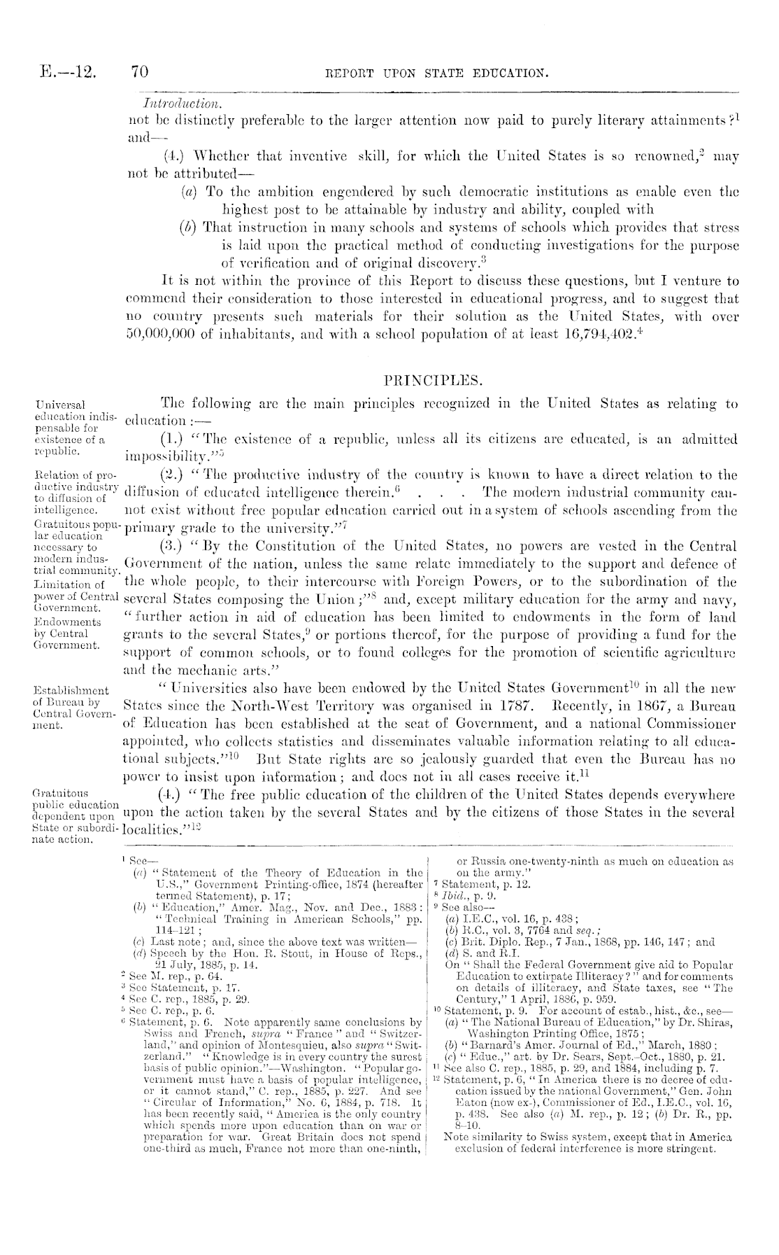 Introduction. not be distinctly preferable to the larger attention now paid to purely literary attainments P 1 and — (4.) Whether that inventive skill, for which the United States is so renowned, 3 may not be attributed— (a) To the ambition engendered by such democratic institutions as enable even the highest post to be attainable by industry and ability, coupled with (b) That instruction in many schools and systems of schools which provides that stress is laid upon the practical method of conducting investigations for the purpose of verification and of original discovery. 3 It is not within the province of this Report to discuss these questions, but I venture to commend their consideration to those interested in educational progress, and to suggest that no country presents such materials for their solution as the United States, with over 50,000,000 of inhabitants, and with a school population of at least 16,794 v 102. 4 PRINCIPLES. The following are the main principles recognized in the United States as relating to ■ education; — (1.) "The existence of a republic, unless all its citizens are educated, is an admitted impossibility." 5 (2.) " The productive industry of the country is known to have a direct relation to the ' diffusion of educated intelligence therein. 6 . • ■ The modern industrial community cannot exist without free popular education carried out in a system of schools ascending from the '-primary grade to the university." 7 (3.) "By the Constitution of the United States, no powers are vested in the Central Government of the nation, unless the same relate immediately to the support and defence of the whole people, to their intercourse with Foreign Powers, or to the subordination of the 1 several States composing the Union ;" s and, except military education for the army and navy, " further action in aid of education has been limited to endowments in the form of land grants to the several States, 9 or portions thereof, for the purpose of providing a fund for the support of common schools, or to found colleges for the promotion of scientific agriculture and the mechanic arts." " Universities also have been endowed by the United States Government 10 in all the new States since the North-West Territory was organised in 1787. Recently, in 18G7, a Bureau of Education has been established at the seat of Government, and a national Commissioner appointed, who collects statistics and disseminates valuable information relating to all educational subjects." 10 But State rights are so jealously guarded that even the Bureau has no power to insist upon information; and docs not in all cases receive it. 11 (4.) " The free public education of the children of the United States depends everywhere upon the action taken by the several States and by the citizens of those States in the several -localities." 12
