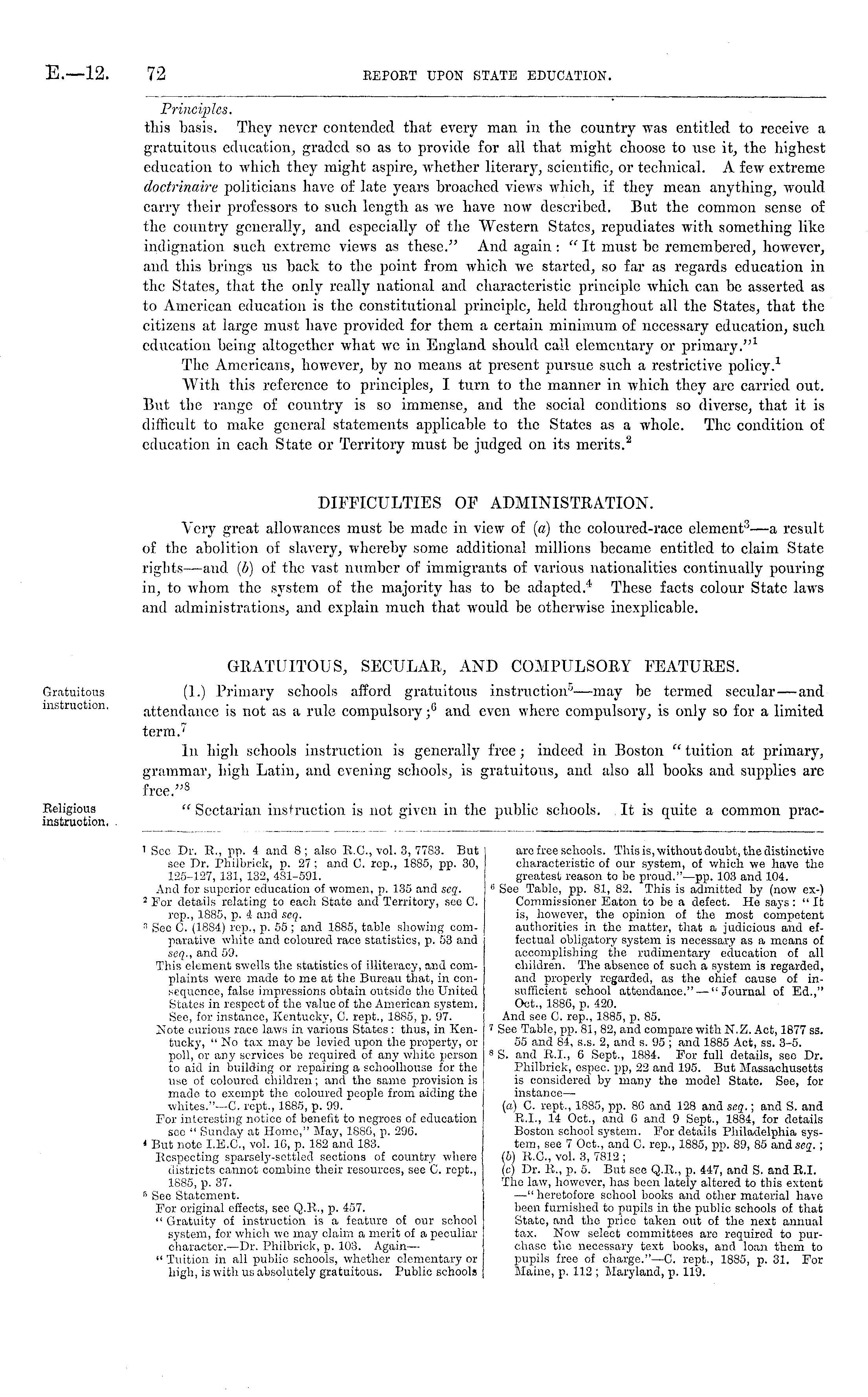 arc free schools. This is, without doubt, the distinctive characteristic of our system, of which we have the greatest reason to be pvoud."—pp. 103 and 104. 15 See Table, pp. 81, 82. This is admitted by (now ex-) Commissioner Eaton to be a defect. He says: "It is, however, the opinion of the most competent authorities in the matter, that a judicious and effectual obligatory system is necessary as a means of accomplishing the rudimentary education of all children. The absence of such a system is regarded, and properly regarded, as the ohief cause of insufficient school attendance." —"Journal of Ed.," Oct., 1886, p, 420. And see C. rep., 1885, p. 85. i See Table, pp. 81, 82, and compare with N.Z. Act, 1877 ss. 55 and 84, s.s. 2, and s. 95 ; and 1885 Act, ss. 3-5. BS. and E.1., G Sept., 1884. For full details, see Dr. Philbrick, espec. pp, 22 and 195. But Massachusetts is considered by many the model State. See, for instance— (a) G. rept., 1885, pp. 8G and 128 and seq. ; and S. and R.1., 14 Oct., and G and 9 Sept., 1884, for details Boston school system. For details Philadelphia system, see 7 Oct., and G. rep., 1885, pp. 89, 85 and sew. ; (b) R.G., vol. 3, 7812 ; (c) Dr. R., p. 5. But see Q.E., p. 447, and S. and E.I. The law, however, has been lately altered to this extent —"heretofore school books and other material have been furnished to pupils in the public schools of that State, and the price taken out of the next annual tax. Now select committees are required to purchase the necessary text books, and loan them to pupils free of charge."—C. rept., 1885, p. 31. For Maine, p. 112 ; Maryland, p. 119.