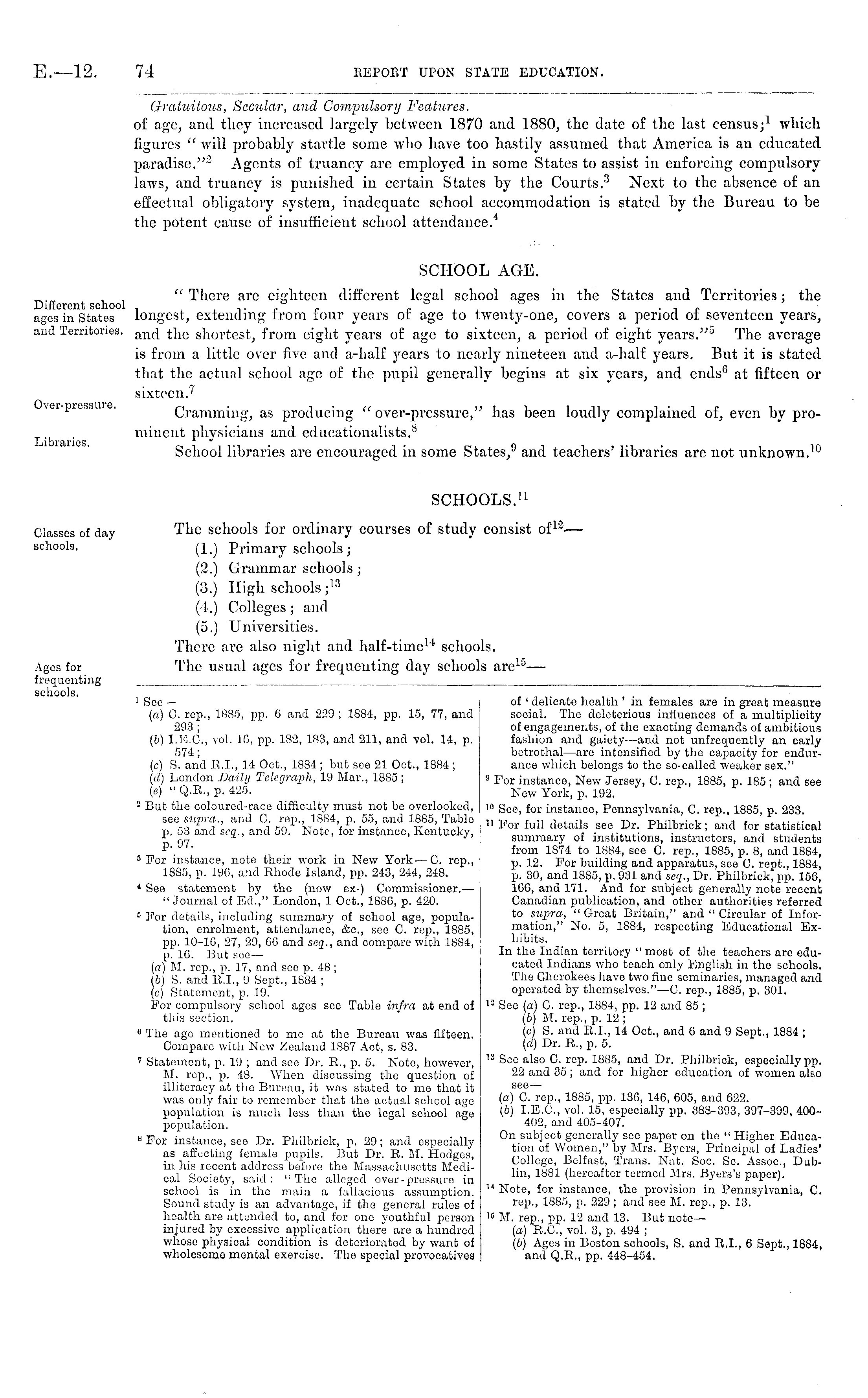 Gratuitous, Secular, and Compulsory Features. of age, and tlicy increased largely between 1870 and 1880, the date of the last census; 1 which figures " will probably startle some who have too hastily assumed that America is an educated paradise." 2 Agents of truancy are employed in some States to assist in enforcing compulsory laws, and truancy is punished in certain States by the Courts. 3 Next to the absence of an effectual obligatory system, inadequate school accommodation is stated by the Bureau to be the potent cause of insufficient school attendance. 4 SCHOOL AGE. " There arc eighteen different legal school ages in the States and Territories; the longest, extending from four years of age to twenty-one, covers a period of seventeen years, and the shortest, from eight years of age to sixteen, a period of eight years. " J The average is from a little over five and a-half years to nearly nineteen and a-half years. But it is stated that the actual school age of the pupil generally begins at six years, and ends 8 at fifteen or sixteen. 7 Cramming, as producing " over-pressure," has been loudly complained of, even by prominent physicians and educationalists. 8 School libraries are encouraged in some States, 9 and teachers' libraries are not unknown. 10 SCHOOLS. 11 The schools for ordinary courses of study consist of 13 — (1.) Primary schools; (2.) Grammar schools ; (3.) High schools; 13 (4.) Colleges; and (5.) Universities. There are also night and half-time 14 schools. The usual ages for frequenting day schools are 15 —