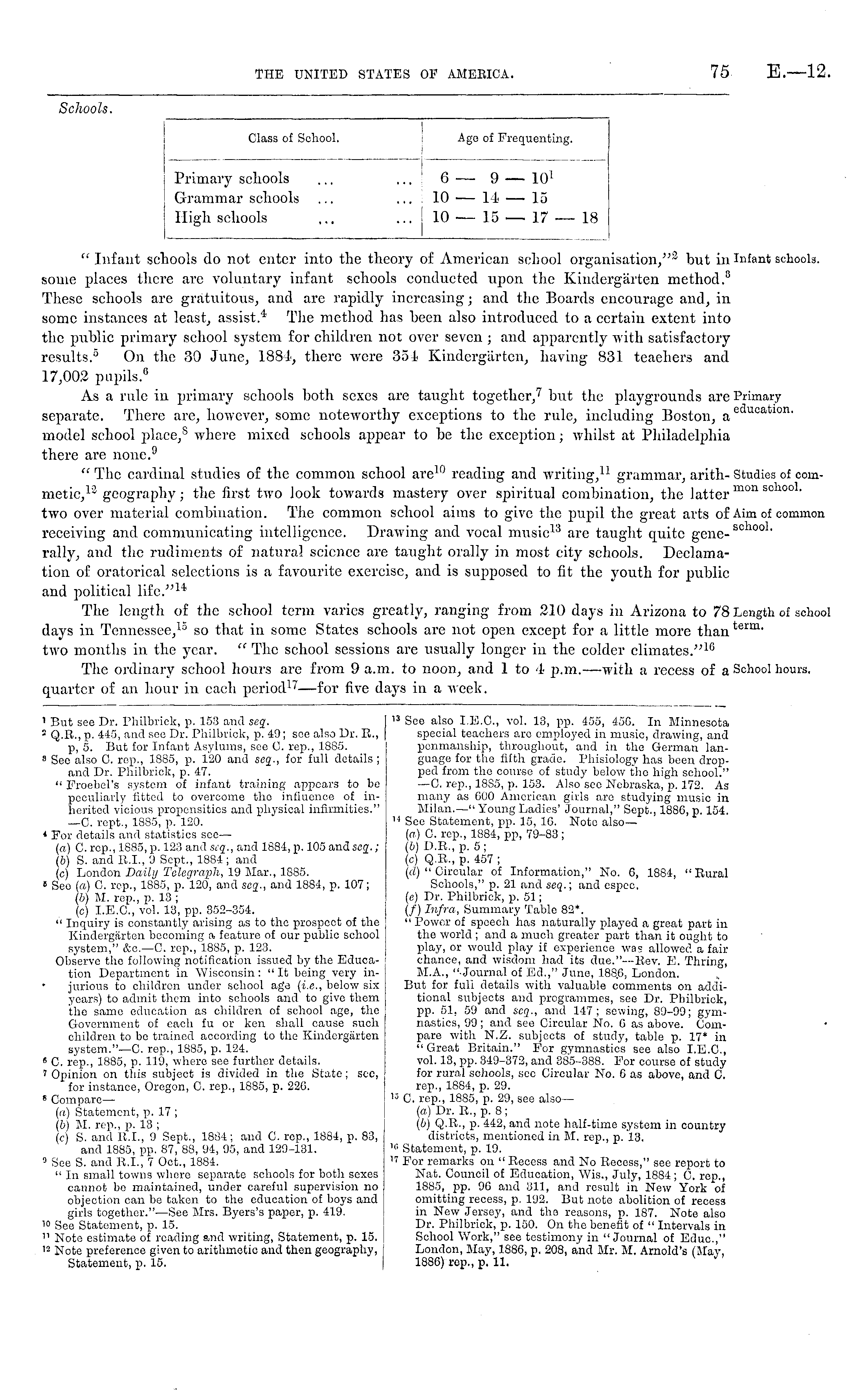 1 But see Dr. Philbriek, p. 153 and seq. 2 Q.8., p. 445, and see Dr. Philbrick, p. 49; see also Dr. E., p, 5. But for Infant Asylums, see C. rep., 1885. 8 Sec also C. rep., 1885, p. 120 and seq., for full details ; and Dr. Philbrick, p. 47. " Froebel's system of infant training appears to be peculiarly fitted to overcome the influence of inherited vicious propensities and physical infirmities." —C. rept., 1885, p. 120. * For details and statistics see— (a) C. rep., 1885, p. 123 and seq., and 1884, p. 105 and seq.; (b) S. and E.1., 9 Sept., 1884 ; and (c) London Daily Telegraph, 19 Mar., 1885. 8 Seo (a) C. rep., 1885, p. 120, and seq., and 1884, p. 107; (b) M. rep., p. 13 ; (c) 1.E.C., vol. 13, pp. 352-354. " Inquiry is constantly arising as to the prospect of the Kindergarten becoming a feature of our public school system," &c—C. rep., 1885, p. 123. Observe the following notification issued by the Education Department in Wisconsin: "It being very in- * jurious to children under school ago (i.e., below six years) to admit them into schools and to give them the same education as children of school age, the Government of each fu or ken shall cause such children to be trained according to the Kindergarten system."—C. rep., 1885, p. 124. s C. rep., 1885, p. 119, where see further details. ' Opinion on this subject is divided in the State; see, for instance, Oregon, G. rep., 1885, p. 220. 6 Compare— (a) Statement, p. 17 ; (b) M. rep., p. 13 ; (c) S. and E.1., 9 Sept., 1884; and C. rep., 1884, p. 83, and 1885, pp. 87, 88, 94, 95, and 129-131. 0 See S. and E.1., 7 Oct., 1884. 11 In small towns where separate schools for both sexes cannot bo maintained, under careful supervision no objection can be taken to the education of boys and girls together."—See Mrs. Byers's paper, p. 419. 10 See Statement, p. 15. 11 Note estimate of reading and writing, Statement, p. 15. 13 Note preference given to arithmetic and then geography, Statement, p. 15.
