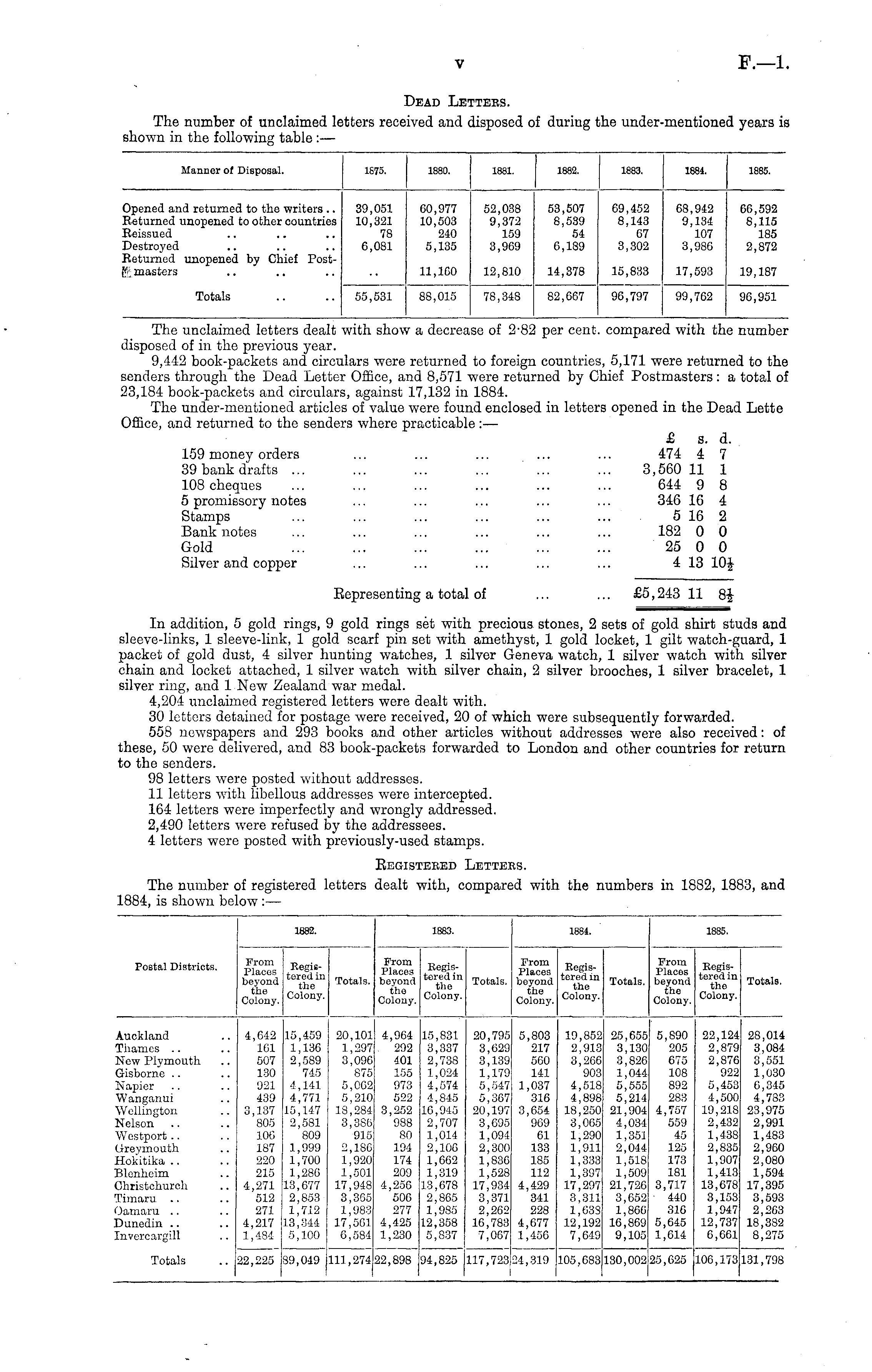 The unclaimed letters dealt with show a decrease of 2-82 per cent, compared with the number disposed of in the previous year. 9,442 book-packets and circulars were returned to foreign countries, 5,171 were returned to the senders through the Dead Letter Office, and 8,571 were returned by Chief Postmasters : a total of 23,184 book-packets and circulars, against 17,132 in 1884. The under-mentioned articles of value were found enclosed in letters opened in the Dead Lette Office, and returned to the senders where practicable : — £ s. d. 159 money orders .... ... ... ... ... 474 4 7 39 bank drafts ... ... ... ... ... ... 3,560 11 1 108 cheques ... ... ... ... ... ... 644 9 8 5 promissory notes ... ... ... ... ... 346 16 4 Stamps ... ... ... ... ... ... 5 16 2 Banknotes ... ... ... ... ... ... 182 0 0 Gold 25 0 0 Silver and copper ... ... ... ... ... 413 10i Eepresenting a total of ... ... £5,243 11 8J In addition, 5 gold rings, 9 gold rings set with precious stones, 2 sets of gold shirt studs and sleeve-links, 1 sleeve-link, 1 gold scarf pin set with amethyst, 1 gold locket, 1 gilt watch-guard, 1 packet of gold dust, 4 silver hunting watches, 1 silver Geneva watch, 1 silver watch with silver chain and locket attached, 1 silver watch with silver chain, 2 silver brooches, 1 silver bracelet, 1 silver ring, and 1 New Zealand war medal. 4,204 unclaimed registered letters were dealt with. 30 letters detained for postage were received, 20 of which were subsequently forwarded. 558 newspapers and 293 books and other articles without addresses were also received: of these, 50 were delivered, and 83 book-packets forwarded to London and other countries for return to the senders. 98 letters were posted without addresses. 11 letters with libellous addresses were intercepted. 164 letters were imperfectly and wrongly addressed. 2,490 letters were refused by the addressees. 4 letters were posted with previously-used stamps. Eegistered Letters. The number of registered letters dealt with, compared with the numbers in 1882, 1883, and 1884, is shown below : —