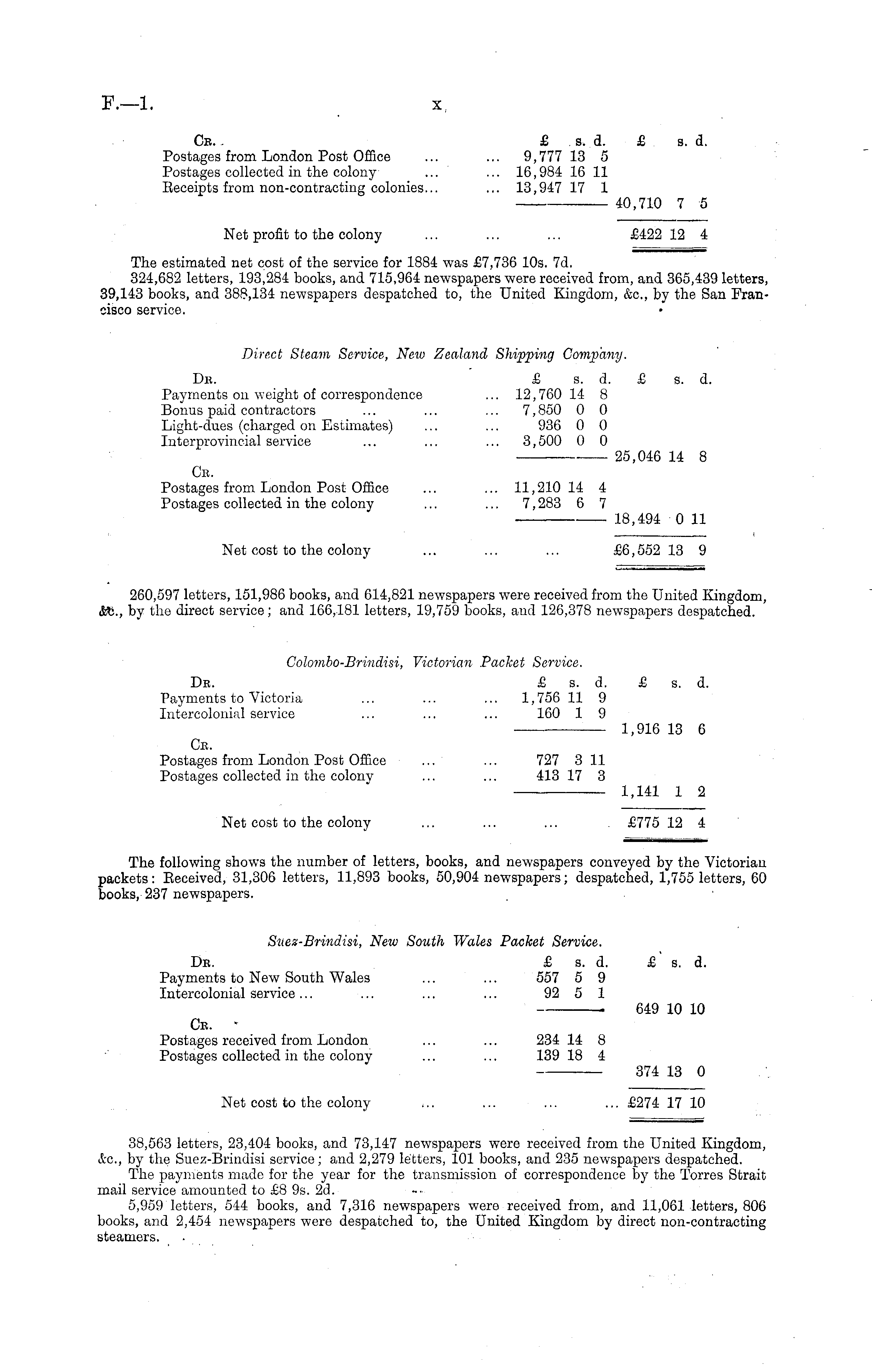 Cr. £ s. d. £ s. d. Postages from London Post Office ... ... 9,777 13 5 Postages collected in the colony ... ... 16,984 16 11 Eeceipts from non-contracting colonies... ... 13,947 17 1 — 40,710 7 5 Net profit to the colony ... ... ... £422 12 4 The estimated net cost of the service for 1884 was £7,736 10s. 7d. 324,682 letters, 193,284 books, and 715,964 newspapers were received from, and 365,439 letters, 39,143 books, and 388,134 newspapers despatched to, the United Kingdom, &c, by the San Francisco service. Direct Steam Service, New Zealand Shipping Company. Dr. £ s. d. £ s. d. Payments on weight of correspondence ... 12,760 14 8 Bonus paid contractors ... ... ... 7,850 0 0 Light-dues (charged on Estimates) ... ... 936 0 0 Interprovincial service ... ... ... 3,500 0 0 ■ 25,046 14 8 Cb. Postages from London Post Office ... ... 11,210 14 4 Postages collected in the colony ... ... 7,283 6 7 18,494 0 11 Net cost to the colony ... ... ... £6,552 13 9 260,597 letters, 151,986 books, and 614,821 newspapers were received from the United Kingdom, &£., by the direct service; and 166,181 letters, 19,759 books, and 126,378 newspapers despatched. Colombo-Briudisi, Victorian Packet Service. Dr. £ s. d. £ s. d. Payments to Victoria ... ... ... 1,756 11 9 Intercolonial service ... ... ... 160 1 9 1,916 13 6 Cb. Postages from London Post Office ... ... 727 3 11 Postages collected in the colony ... ... 413 17 3 1,141 1 2 Net cost to the colony ... ... ... £775 12 4 The following shows the number of letters, books, and newspapers conveyed by the Victorian packets: Eeceived, 31,306 letters, 11,893 books, 50,904 newspapers; despatched, 1,755 letters, 60 books, 237 newspapers. Suez-Brindisi, New South Wales Packet Service. Dr. £ s. d. £ s. d. Payments to New South Wales ... ... 557 5 9 Intercolonial service... ... ... ... 92 5 1 ■ 649 10 10 Cr. • Postages received from London ... ... 234 14 8 Postages collected in the colony ... ... 139 18 4 374 13 0 Net cost to the colony ... ... ... ...£274 17 10 38,563 letters, 23,404 books, and 73,147 newspapers were received from the United Kingdom, &.c, by the Suez-Brindisi service; and 2,279 letters, 101 books, and 235 newspapers despatched. The payments made for the year for the transmission of correspondence by the Torres Strait mail service amounted to £8 9s. 2d. 5,959 letters, 544 books, and 7,316 newspapers were received from, and 11,061 letters, 806 books, and 2,454 newspapers were despatched to, the United Kingdom by direct non-contracting steamers.