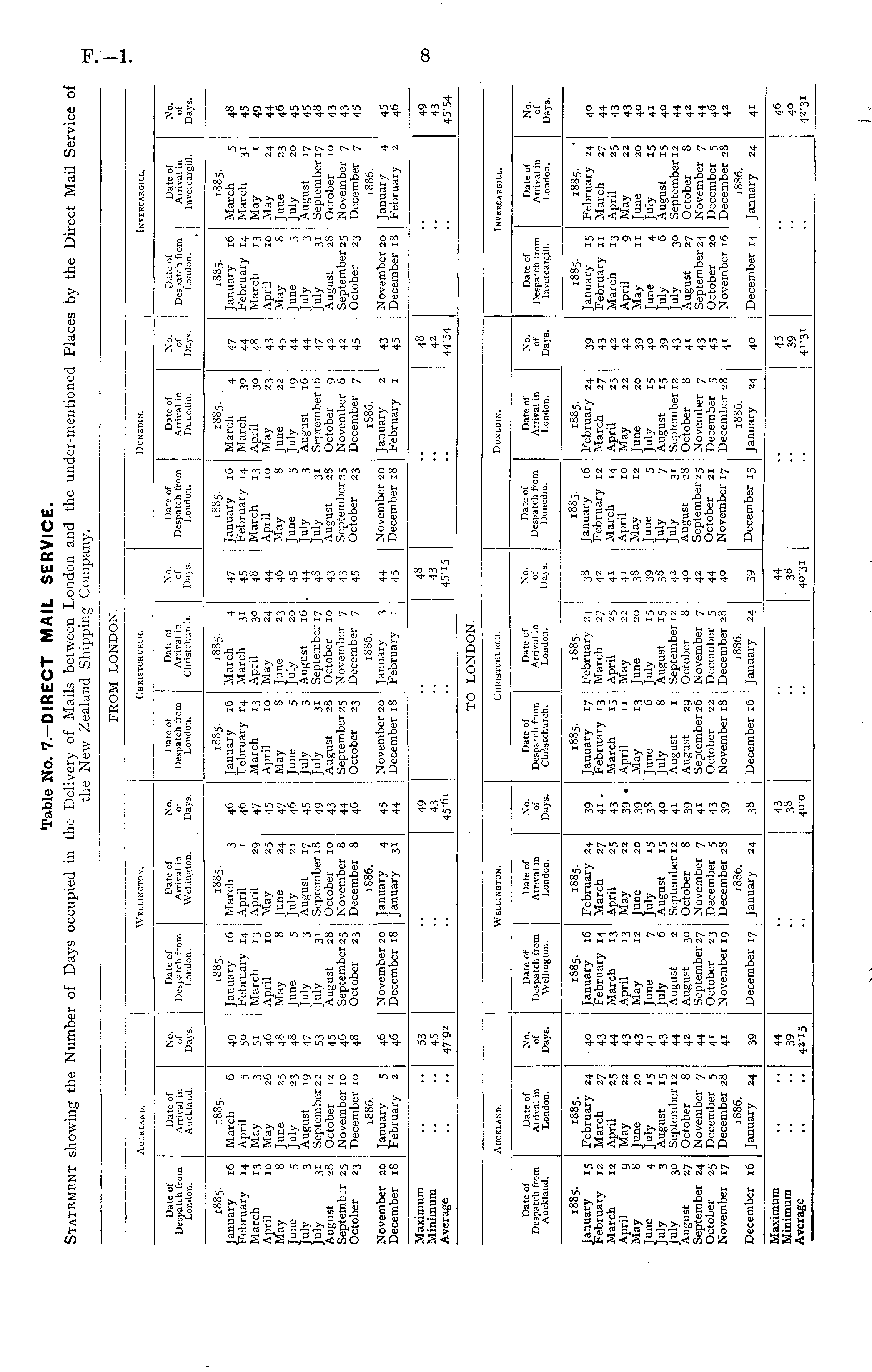 FROM LONDON. Auckland. Wellington. Christchurch. DUNEDIN. Invercargill. Date of Despatch from London. Date of Arrival in Auckland. No. of Days. Date of Despatch from London. Date of Arrival in Wellington. No. of Days. Date of Date of No. Despatch from Arrival in of London. Christchurch. Days. Date of Despatch from London. Date of Arrival in Duuedin. No. of Days. Date of Despatch fiom London. Date of Arrival in Invercargill. No. of Days. 1885. January 16 February 14 March 13 April 10 May 8 June 5 July 3 July 31 August 28 SeptemKr 25 October 23 1885. March 6 April 5 May 3 May 26 June 25 July 23 August 19 September 22 October 12 November 10 December 10 1886. 49 48 48 47 53 45 4 6 48 1885. January 16 February 14 March 13 April 10 May 8 June 5 July 3 July 31 August 28 September 25 October 23 1885. March 3 April 1 April 29 May 25 June 24 July 21 August 17 September 18 October 10 November 8 December 8 1886. January 4 January 31 46 46 47 45 47 46 45 49 43 44 46 1885. January 16 February r4 March 13 April 10 May 8 June 5 July 3 July 31 August 28 September 25 October 23 1885. March 4 March 31 April 30 May 24 June 23 July 20 August 16 September 17 October 10 November 7 December 7 1886. ■ 47 45 48 44 46 45 44 48 43 43 45 1885. January 16 February 14 March 13 April 10 I May 8 1 June 5 July 3 July 31 August 28 September 25 October 23 1885. March 4 March 30 April 30 May 23 June 22 July 19 August 16 September 16 October 9 November 6 December 7 1S86. January 2 February 1 47 44 43 45 44 44 47 42 42 45 1885. January 16 February 14 March 13 April 10 May 8 June 5 July 3 July 31 August 28 September 25 October 23 1885. March 5 March 31 May 1 May 24 June 23 July 20 August 17 September 17 October 10 November 7 December 7 1886. 4 S 45 49 44 4 6 45 45 48 43 43 45 November 20 December 18 January 5 February 2 46 46 November 20 December 18 45 44 November 20 December 18 January 3 February 1 44 45 November 20 December 18 43 45 November 20 December 18 January 4 February 2 45 46 Maximum Minimum Average 53 45 4792 49 43 45-61 48 43 45-15 48 42 44'54 49 43 45'54 TO LONDON. Auckland. Wellington. RISTCHURCIf. Dunedin. IVERCARGILL. Date of Despatch from Auckland. Date of Arrival in London. No. of Days. Date of Despatch from ! Wellington. Date of Arrival in London. No. of Days. Date of Despatch from Christchurch. Date of Arrival in London. No. Date of of Despatch fiom Days. Duaedio. Date of Arrival in London. No. of Days. Date of Despatch from Inrercargill. Date of Arrival in London. No. of Days. 1885. January 15 February 12 March 12 April g May 8 June 4 July 3 July 30 August 27 September 24 October 25 November 17 1885. February 24 March 27 April 25 May 22 June 20 July 15 August 15 September 12 October 8 November 7 December 5 December 28 1886. January 24 40 43 44 43 43 4 1 43 44 42 44 41 41 1885. January 16 February 14 March 13 April 13 May 12 June 7 July 6 August 2 August 30 September 27 October 23 November 19 1885. February 24 March 27 April 25 May 22 June 20 July 15 August 15 September 12 October 8 November 7 December 5 December 28 1886. January 24 39 41 . 43 39 • 39 38 40 4 1 39 41 43 39 1885. January 17 February 13 March 15 April 11 May 13 June 6 July 8 August 1 August 29 September 26 October 22 November 18 1885. February 24 March 27 April 25 May 22 June 20 July 15 August 15 September 12 October 8 November 7 December 5 December 28 1886. 38 42 41 41 38 39 38 42 40 42 44 40 1885. January 16 February 12 March 14 April 10 May 12 June 5 July 7 Jul y 31 August 28 September 25 October 21 November 17 1885. February 24 March 27 April 25 May 22 June 20 July 15 August 15 September 12 October 8 November 7 December 5 December 28 39 43 42 42 39 40 3D 43 41 43 45 41 1885. January 15 February 11 March 13 April 9 May 11 June 4 July 6 July 30 August 27 September 24 October 20 November 16 1885. February 24 March 27 April 25 May 22 June 20 July 15 August 15 September 12 October 8 November 7 December 5 December 28 18S6. 40 44 43 43 4° 41 40 44 42 44 46 42 December 16 39 December 17 38 December 16 January 24 39 December 15 1886. January 24 40 December 14 41 January 24 Maximum Minimum Average 44 39 42^5 43 1 40-0 I 44 38 40-31 45 39 46 40 4231