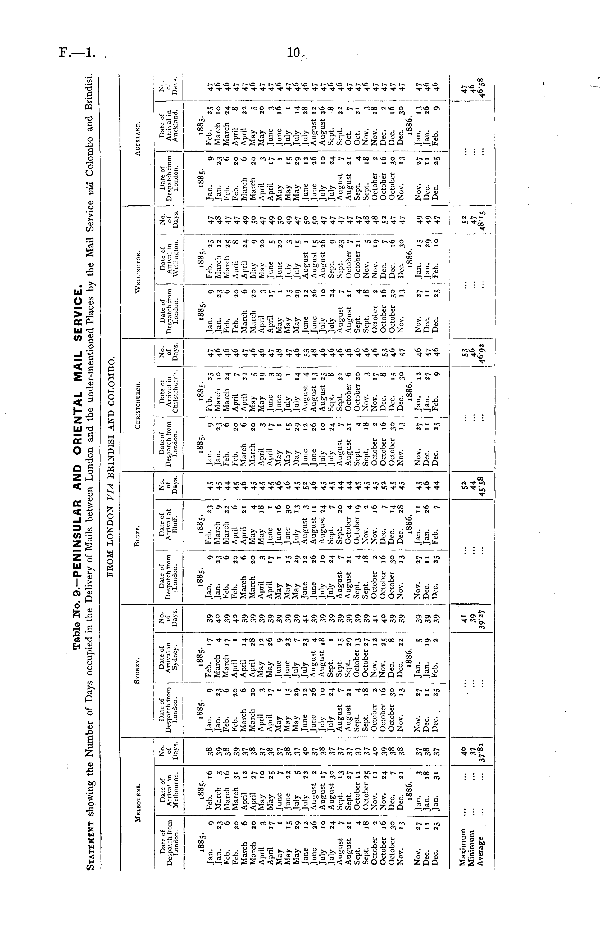 PROM LONDON VIA BRINDISI AND COLOMBO. Melbourne. Sydney. Bluff. Christchurch. Wellington. Auckland. Date of Despatch from London. Date of Arrival in Melhnurne. No. of Days. Date of Despatch from London. Date of Arrival in Sydney. No. of Days. Date of Despatch from ; London. Date of Arrival at Bluff. No. of Davs. Date of Despatch from London. Date of Arrival in Christchurch. No. of Days. Date of Despatch from London. Date of Arrival in Wellington. No. of Days. Date of Despatch from London. Date of Arrival in Auckland. No. of Dai?. 1885. 1885. Feb. 16 March 3 March 16 March 3 1 April 12 April 27 May 10 May 2 5 June 1 June 22 July 5 July 22 August 2 August 17 August 30 Sept. 13 Sept. 27 October 11 October 25 Nov. 1 1 Nov. 24 Dec. 7 Dec. 2 1 1886. Jan. 3 Jan. 18 Jan. 31 38 39 38 39 37 38 37 38 37 38 37 40 37 38 37 37 37 37 37 40 39 38 38 1885. 1885. Feb. 17 March 4 March 17 April 1 April 14 April 28 May 12 May 26 June 9 June 23 July 7 July 23 August 4 August 18 Sept. 1 Sept. 15 Sept. 29 October 13 October 27 Nov. 12 Nov. 25 Dec. 8 Dec. 22 1886. 39 40 39 40 39 39 39 39 39 39 39 4' 39 39 39 i 39 i 39 41 40 39 39 1885. Jan. 9 Jan. 23 Feb. 6 Feb. 20 March 6 March 20 April 3 April 17 May 1 May 15 May 29 June 12 June 26 July 10 July 24 August 7 August 21 Sept. 4 Sept. 18 October 2 October 16 October 30 Nov. 13 1885. Feb. 23 March 9 March 22 April 6 April 21 May 4 May 18 June 1 June 16 June 30 Jul y '3 August 3 August 11 August 24 Sept. 7 Sept. 20 October 4 October 19 Nov. 2 Nov. 16 Dec. 7 Dec. 14 Dec. 28 1886. 45 45 44 45 46 45 45 45 46 46 45 52 46 45 45 44 44 45 45 45 52 45 45 1885. 1885. Feb. 25 March 10 March 24 April 7 April 22 May 5 May 19 June 3 June 18 July 1 July 14 August 4 August 13 August 25 Sept. 8 Sept. 22 October 6 October 20 Nov. 3 Nov. 17 Dec. 8 Dec. 15 Dec. 30 1886.' Jan. 12 Jan. 27 Feb. 9 47 46 46 46 47 46 46 47 48 47 46 53 48 46 46 46 46 46 46 46 53 46 ; 47 1885. 1885. Feb. 25 March 12 March 25 April 8 April 24 May 9 May 20 June 5 June 20 July 3 July '5 August 1 August 15 August 26 Sept. 9 Sept. 23 October 7 October 2 I Nov. 5 Nov. 19 Dec. 7 Dec. 16 Dec. 30 1886.' 47 48 47 47 49 50 47 49 50 49 47 50 5° 47 47 47 47 ; 47 48 48 52 47 47 I ■ 885. 1885. Feb. 25 March 1 o March 24 April 8 April 22 May 5 May 20 June 3 June 16 July 1 July 14 July 28 August 12 August 26 Sept. 8 Sept. 22 Oct. 7 Oct. 2 1 Nov. 3 Nov. 18 Dec. 2 Dec. 16 Dec. 30 1886. Jan. 13 Jan. 26 Feb. 9 47 46 46 47 47 46 47 47 47 46 46 47 47 46 46 4/ 47 46 47 47 47 47 Jan. 9 Jan. 23 Feb. 6 Feb. 20 March 6 March 20 April 3 April 17 May 1 May 1 s May 29 June 12 June 26 July 10 July 24 August 7 August 21 Sept. 4 Sept. 18 October 2 October 16 October 30 Nov. 13 Jan. 9 Tan. 23 Feb. 6 Feb. 20 March 6 March 20 April 3 April 17 May 1 May 15 May 29 June 12 June 26 July 10 July 24 August 7 August 21 Sept. 4 Sept. 18 October 2 | October 16 ; October 30 Nov. 13 Jan. 9 Jan. 23 Feb. 6 Feb. 20 March 6 March 20 April 3 April 17 May 1 May 15 May 29 June 12 June 26 July 10 July 24 August 7 August 21 Sept. 4 Sept. 18 October 2 October 16 October 30 Nov. 13 Jan. 9 Jan. 23 Feb. 6 Feb. 20 March 6 March 20 April 3 April 17 May 1 May 15 May 29 June 12 June 26 July 10 July 24 August 7 August 2 1 Sept. 4 Sept. 18 October 2 October 16 October 30 Nov. 13 Jan. 9 Jan. 2} Feb. 6 Feb. 20 March 6 March 20 April 3 April 17 May 1 May 15 May 29 June 12 June 26 July 10 July 24 August 7 August 2 1 Sept. 4 Sept. 18 October 2 October 16 October 30 j Nov. 13 Nov. 27 I Dec. 11 j Dec. 25 1 37 38 37 Nov. 27 Dec. 11 Dec. 25 Jan- 5 Jan. 19 Feb. 2 39 39 : 39 1 Nov. 27 Dec. 1 1 Dec. 25 Jan. 11 Jan. 26 j Feb. 7 45 46 44 Nov. 27 Dec. 1 1 Dec. 25 46 47 46 Nov. 2 7 Dec. 11 Dec. 25 Jan. 15 Jan. 29 Feb. 10 49 49 47 Nov. 27 Dec. 1 1 Dec. 25 47 46 46 Maximum Minimum Average 40 37 ... 3781 4' 39 39'27 52 44 45-58 53 46 46 92 52 47 47 46 46-58
