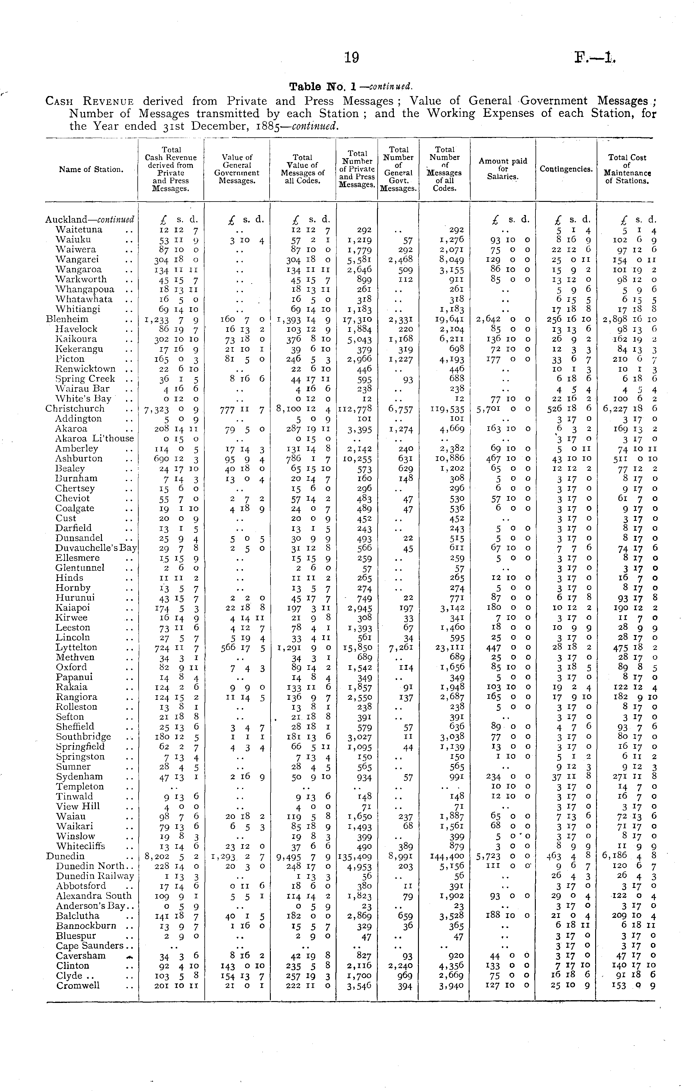 Table No. 1—continued. Cash Revenue derived from Private and Press Messages; Value of General Government Messages; Number of Messages transmitted by each Station; and the Working Expenses of each Station, for the Year ended 31st December, 1885 — continued.
