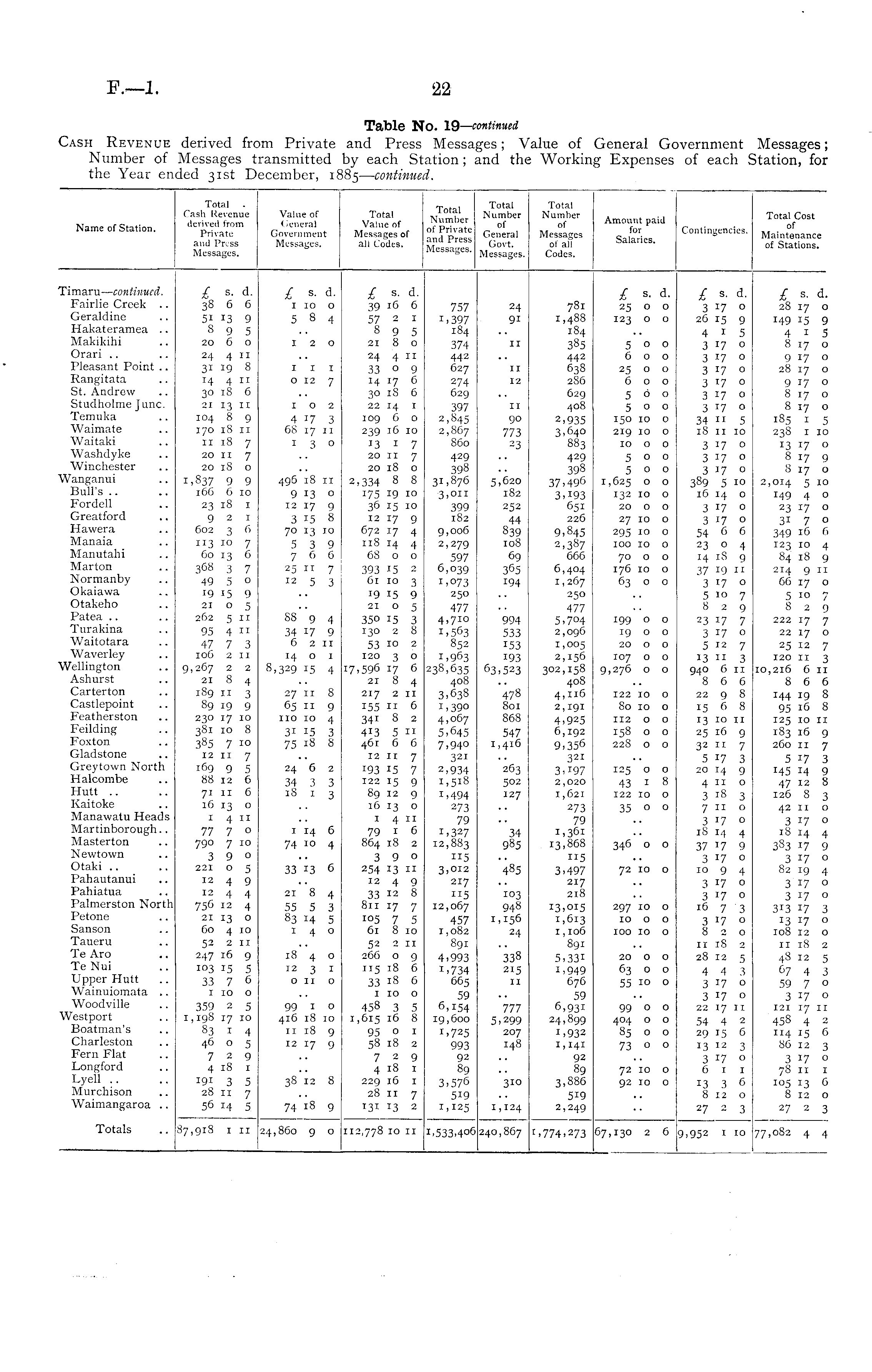 Table No. 19— continued Cash Revenue derived from Private and Press Messages; Value of General Government Messages; Number of Messages transmitted by each Station; and the Working Expenses of each Station, for the Year ended 31st December, 1885 — continued.