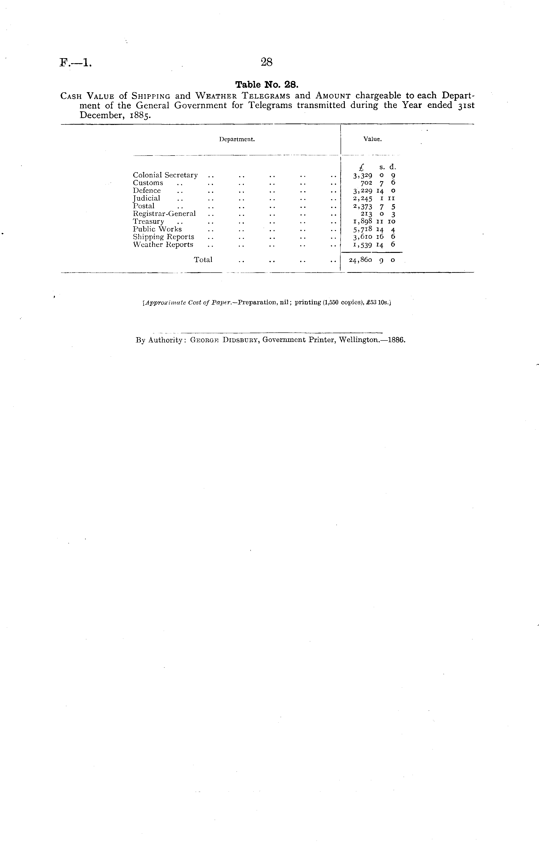 Table No. 28. Cash Value of Shipping and Weather Telegrams and Amount chargeable to each Department of the General Government for Telegrams transmitted during the Year ended 31st December, 1885.