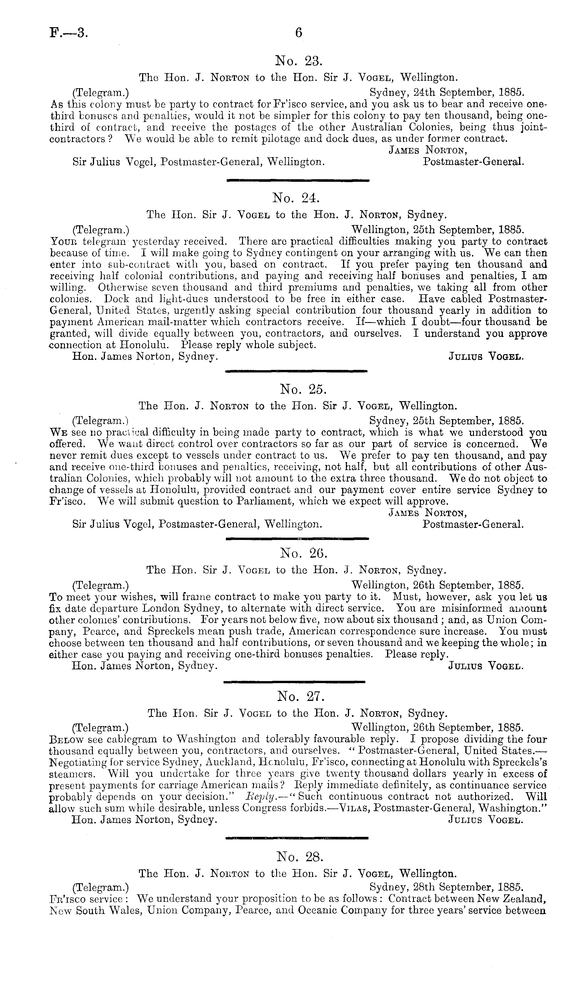 No. 25. The Hon. J. Noeton to the Hon. Sir J. Vogel, Wellington. (Telegram.) Sydney, 25th September, 1885. We see no practical difficulty in being made party to contract, which is what we understood you offered. We want direct control over contractors so far as our part of service is concerned. We never remit dues except to vessels under contract to us. We prefer to pay ten thousand, and pay and receive one-third bonuses and penalties, receiving, not half, but all contributions of other Australian Colonies, which probably will not amount to the extra three thousand. We do not object to change of vessels at Honolulu, provided contract and our payment cover entire service Sydney to Frisco. W Te will submit question to Parliament, which we expect will approve. James Noeton, Sir Julius Vogel, Postmaster-General, Wellington. Postmaster-General.